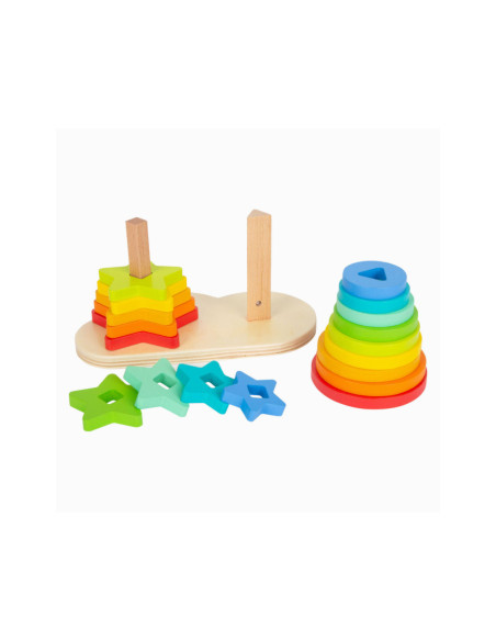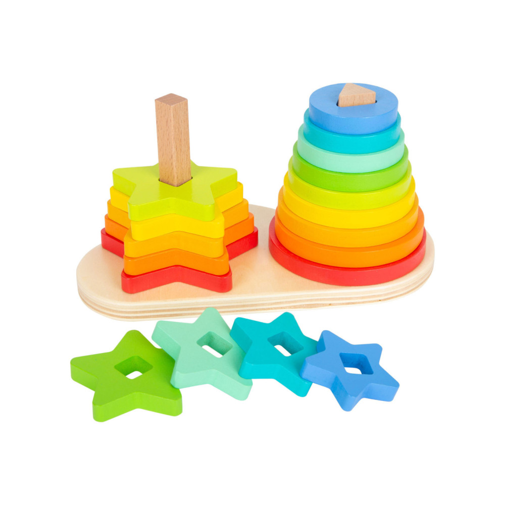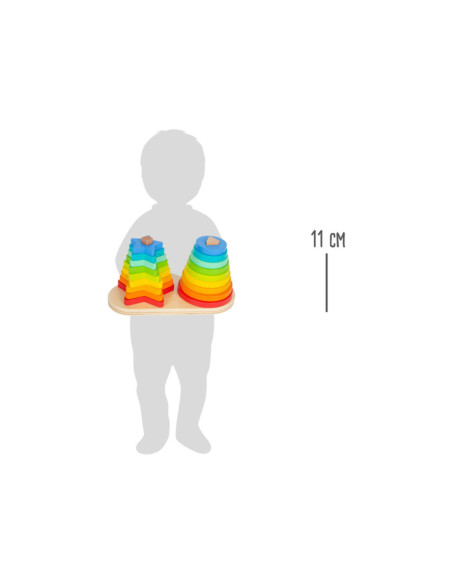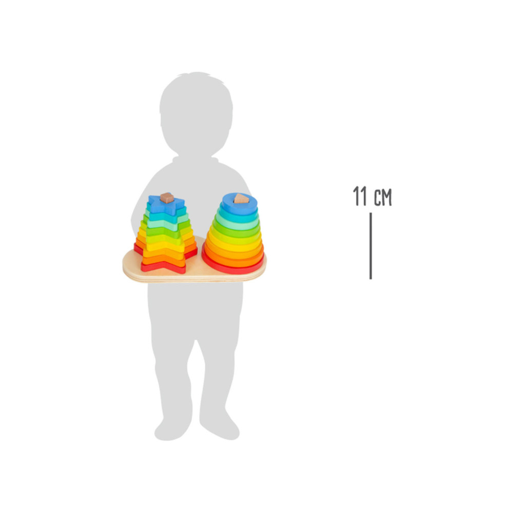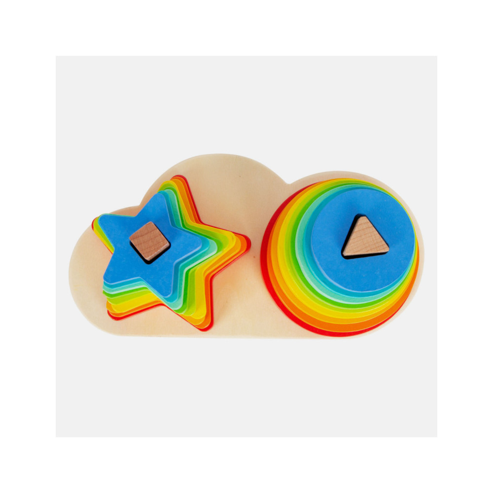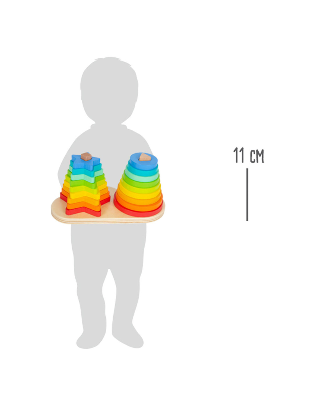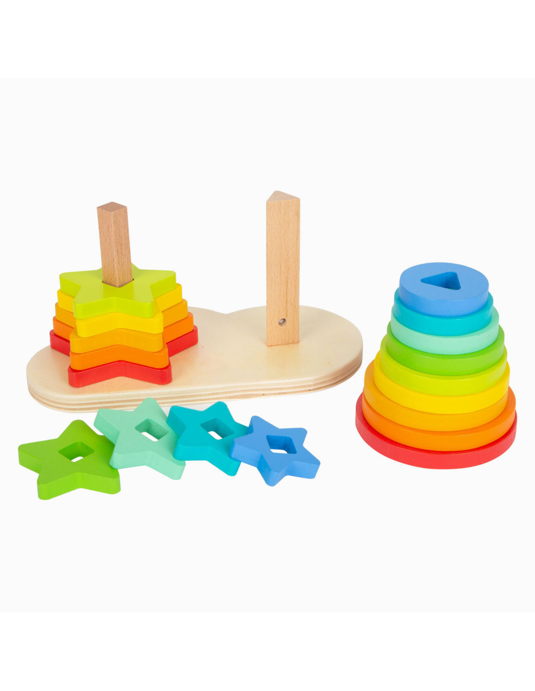 Zo kleurrijk als de regenboog! Bij dit vorm-passende stapelspel is het doel om identieke vormen op maat op elkaar te stapelen, zodat de kleuren van de regenboog in de juiste volgorde komen te staan. Door te stapelen, in te leggen en sorteren leren kinderen spelenderwijs over vormen, kleuren en maten. Ook de fijne motoriek en hand-oogcoördinatie worden getraind. Absoluut eindeloze stapel- en sorteermogelijkheden! Wie maakt de regenboog compleet?