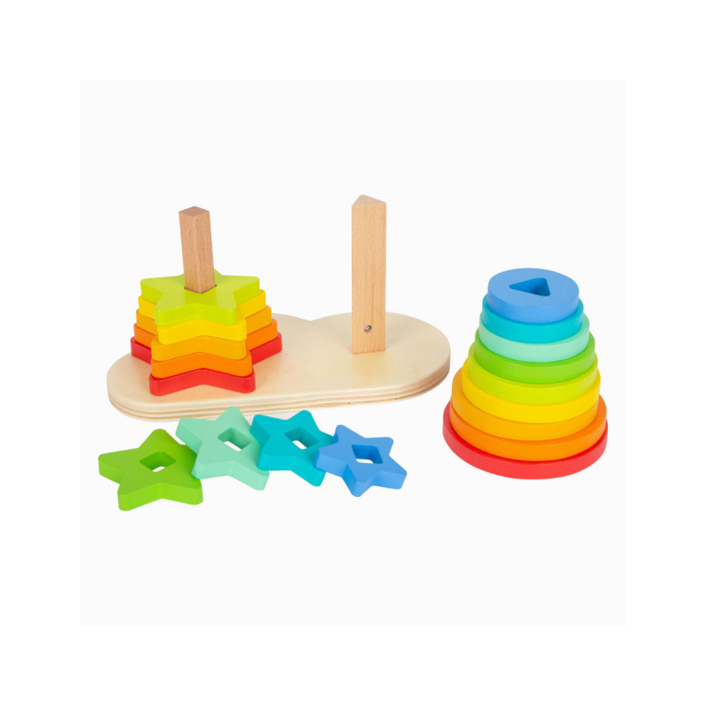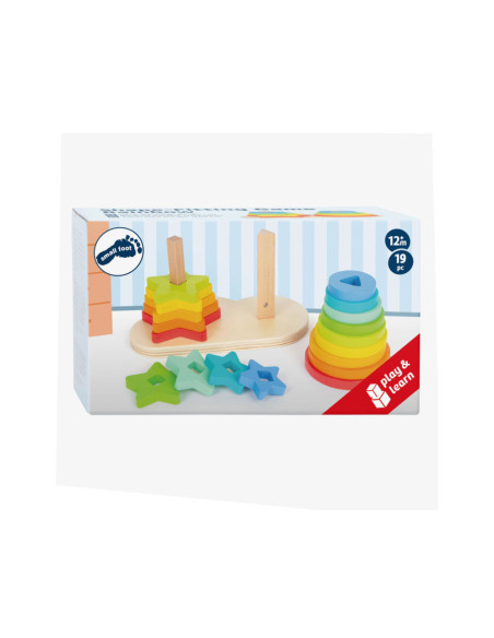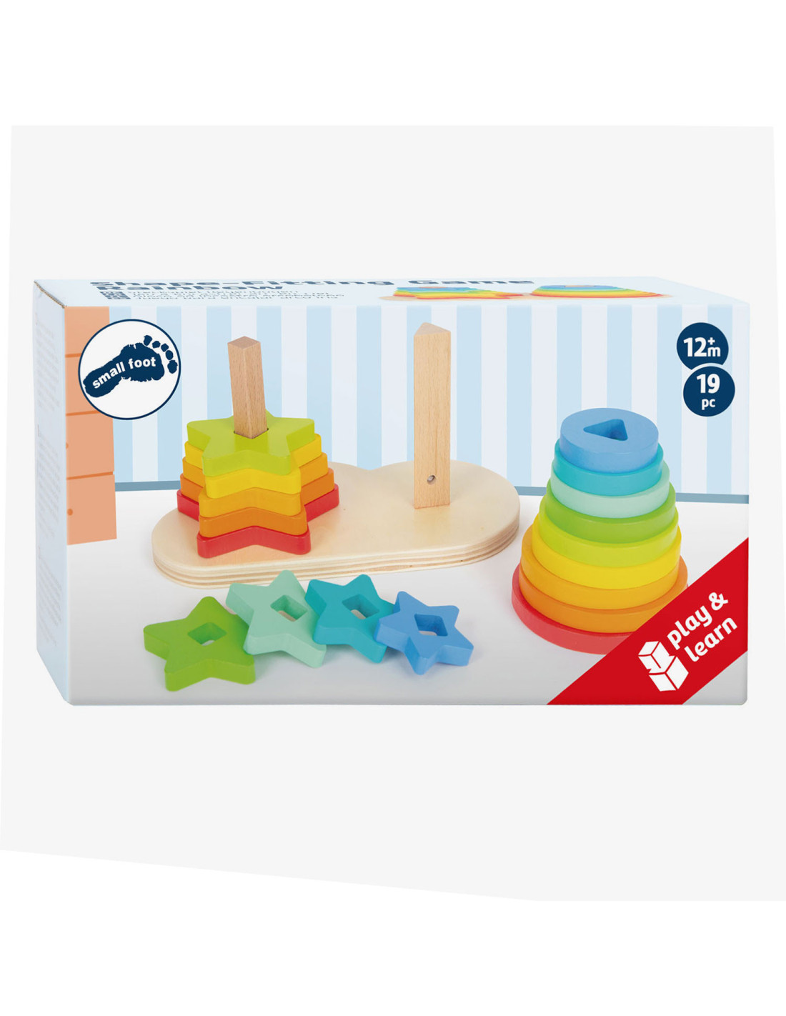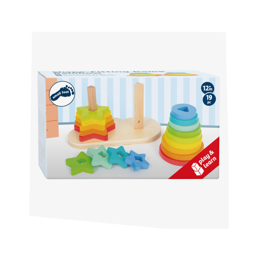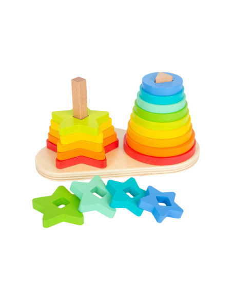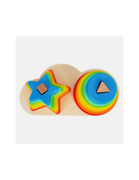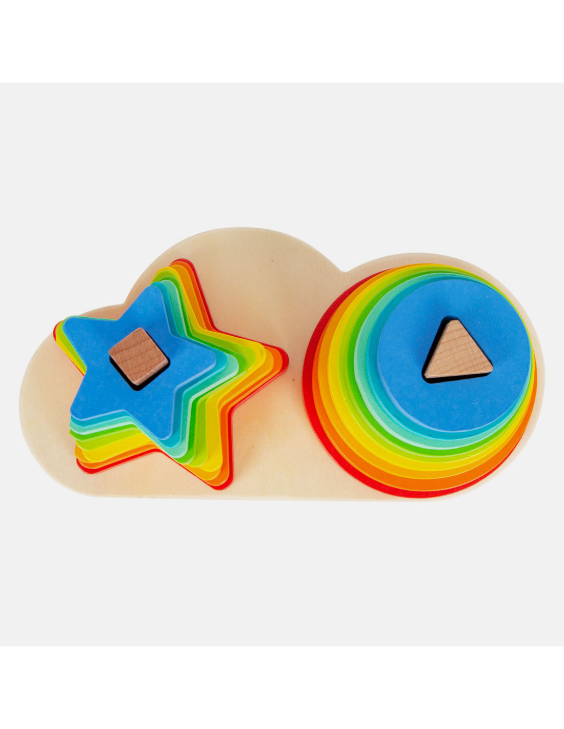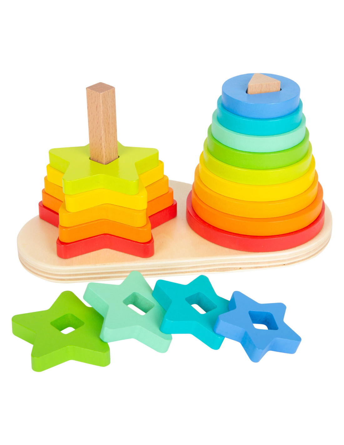 Zo kleurrijk als de regenboog! Bij dit vorm-passende stapelspel is het doel om identieke vormen op maat op elkaar te stapelen, zodat de kleuren van de regenboog in de juiste volgorde komen te staan. Door te stapelen, in te leggen en sorteren leren kinderen spelenderwijs over vormen, kleuren en maten. Ook de fijne motoriek en hand-oogcoördinatie worden getraind. Absoluut eindeloze stapel- en sorteermogelijkheden! Wie maakt de regenboog compleet?