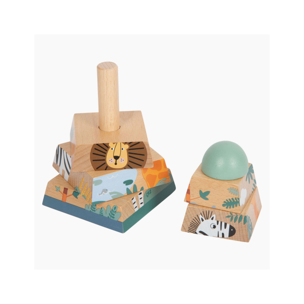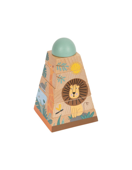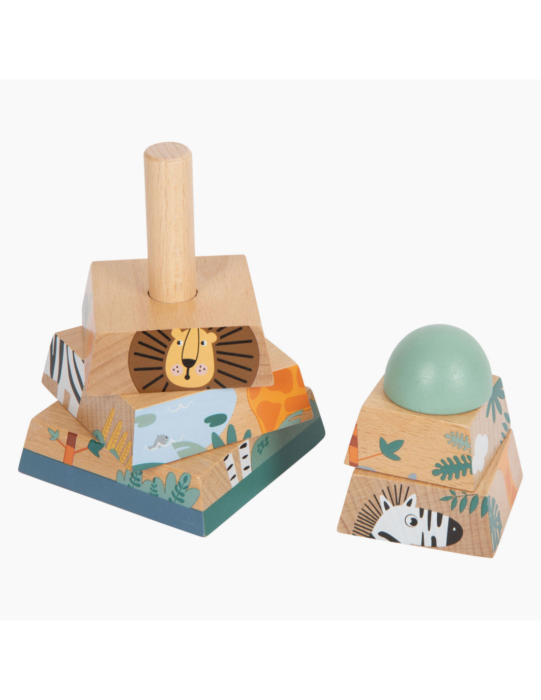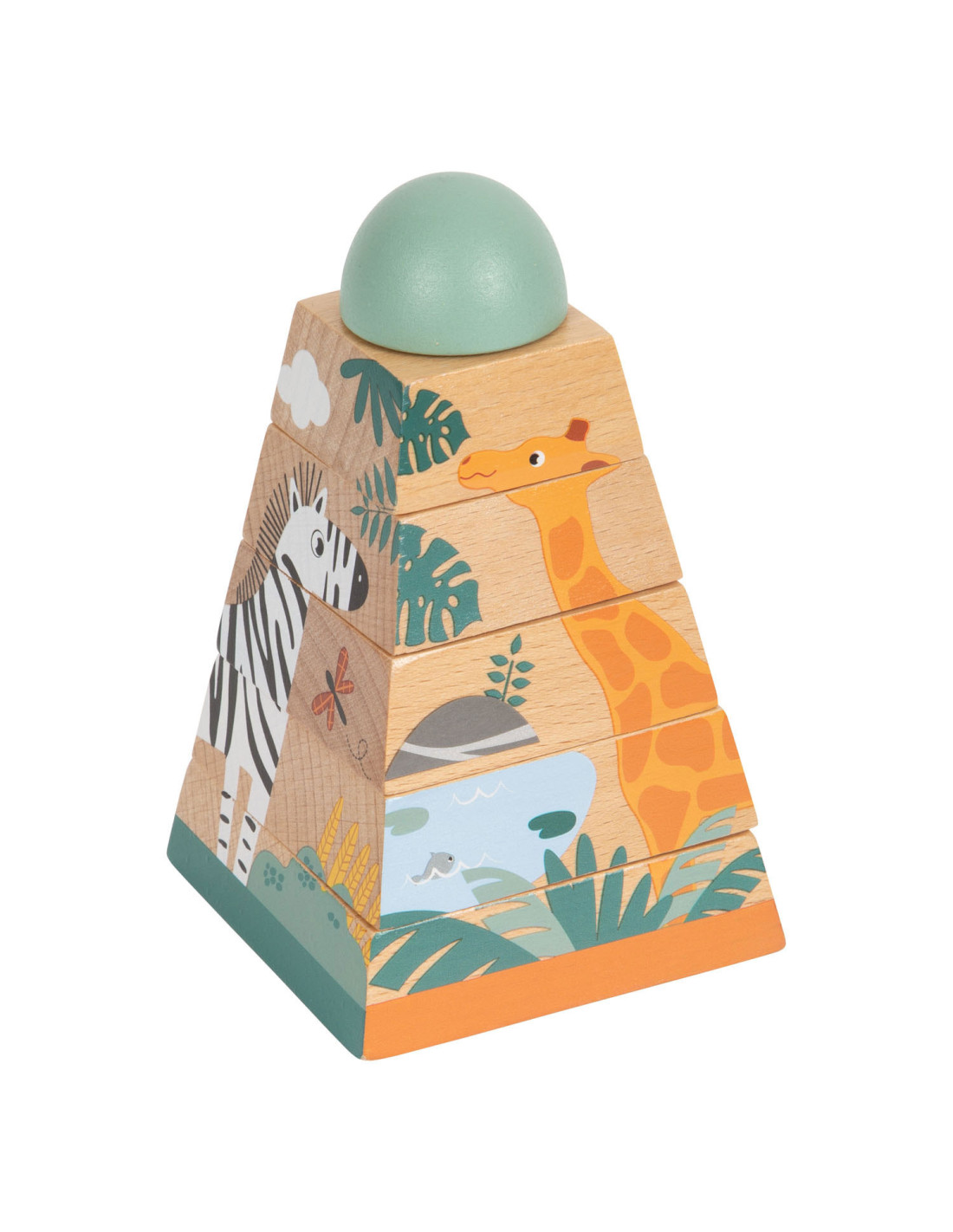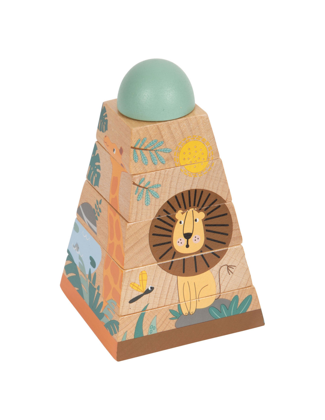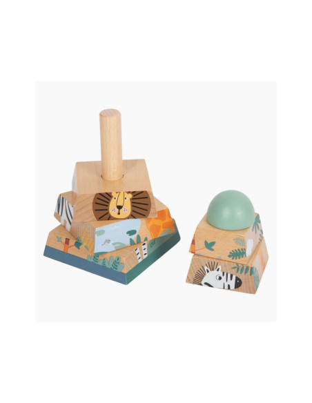 Stapelplezier in een wilde look! Dit stapelspeelgoed van robuust hout traint de fijne motoriek en het ruimtelijk inzicht. Door de massieve houten blokken in de juiste volgorde te stapelen ontstaat een toren die vriendelijke wilde dieren laat zien. De giraf, zebra en leeuw helpen bij het stapelen! Het in elkaar zetten van deze zesdelige stapeltoren traint hand-oogcoördinatie en maatbegrip. Een leerzaam motoriek- en behendigheidsspel voor de allerkleinsten! Geschikt voor kinderen vanaf 12 maanden oud.