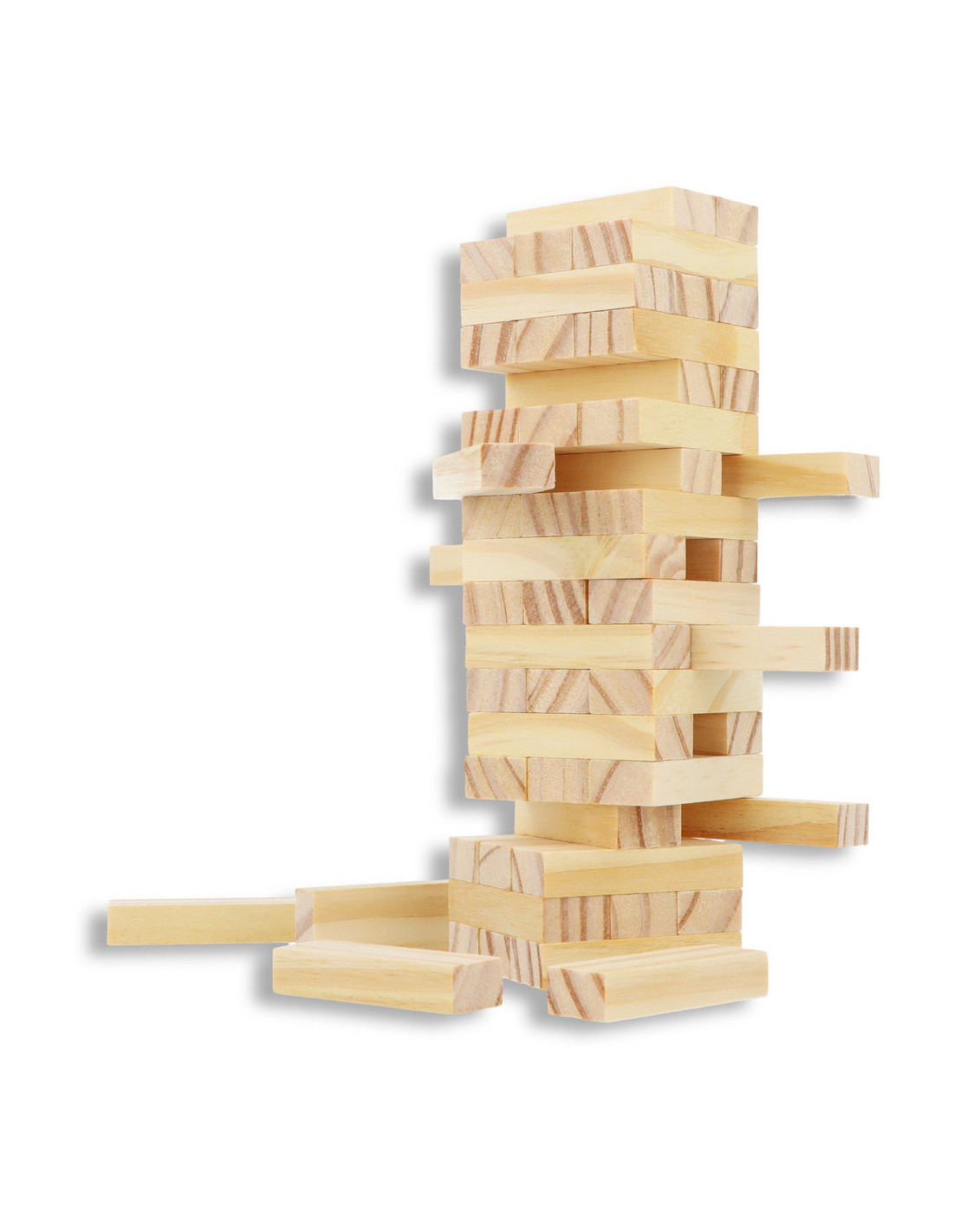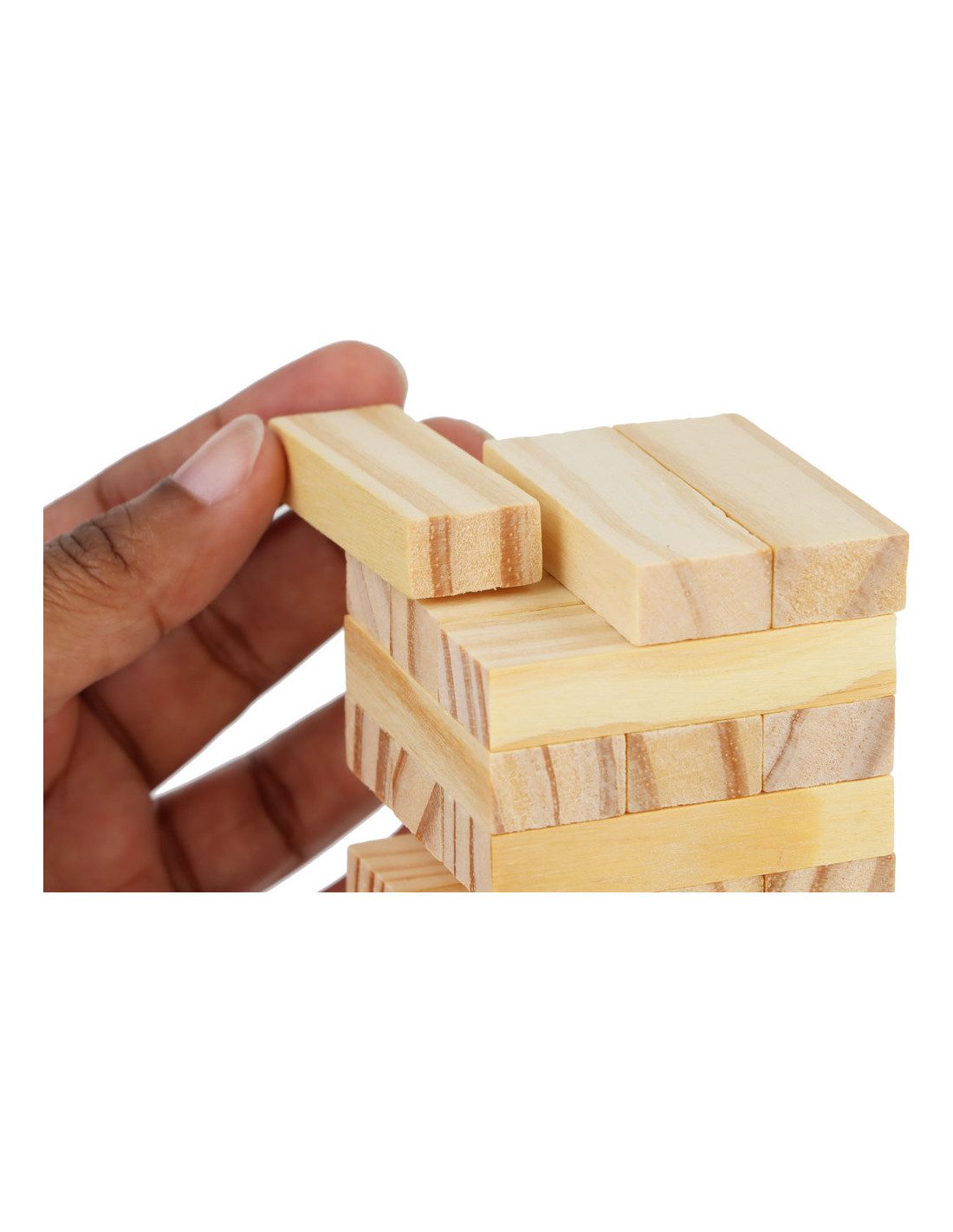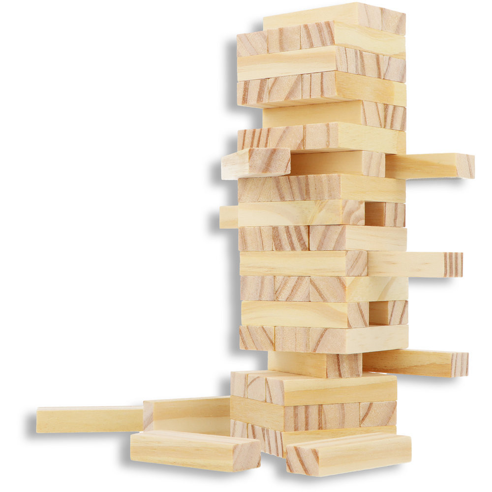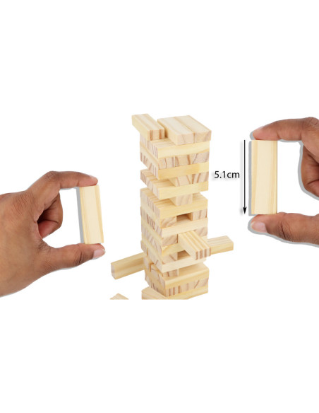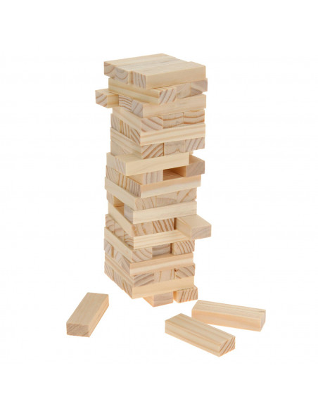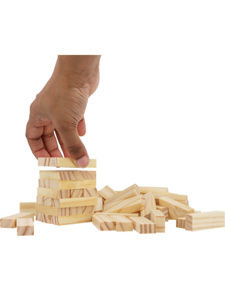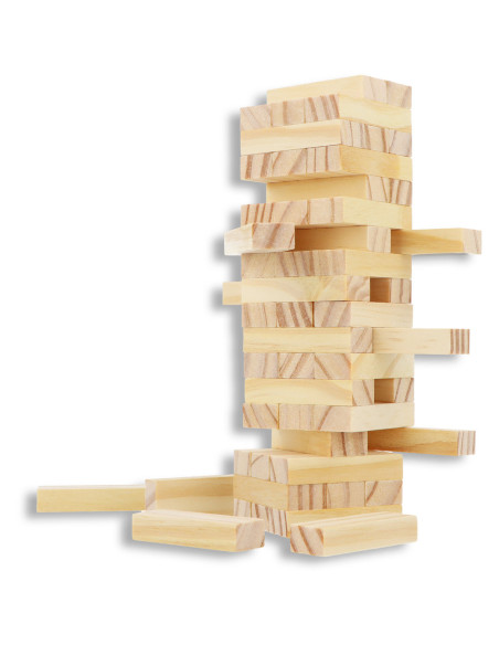 Ontdek wie de toren het langst kan balanceren met dit stapelspel. Bouw eerst de toren op door de blokjes in rijtjes van 3 op te stapelen, start vervolgens het duel in het balanceren van de toren. Aantal blokjes: 54 stuks