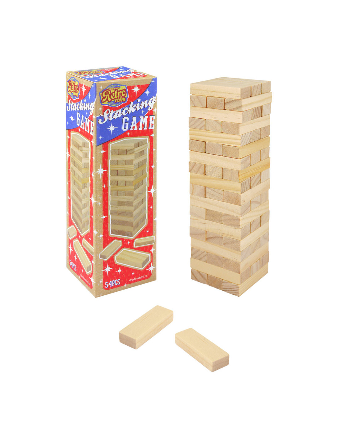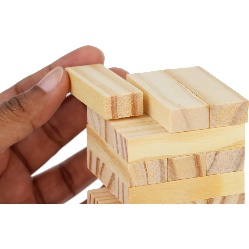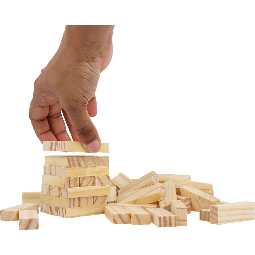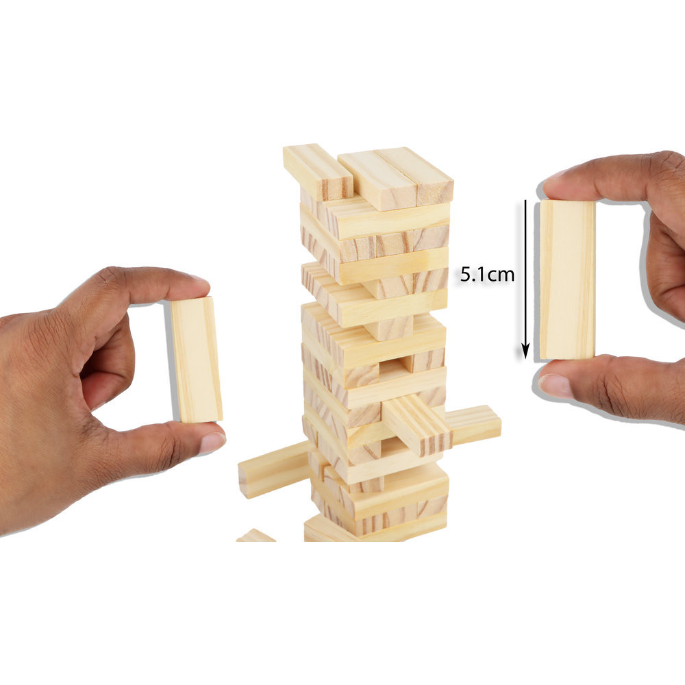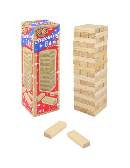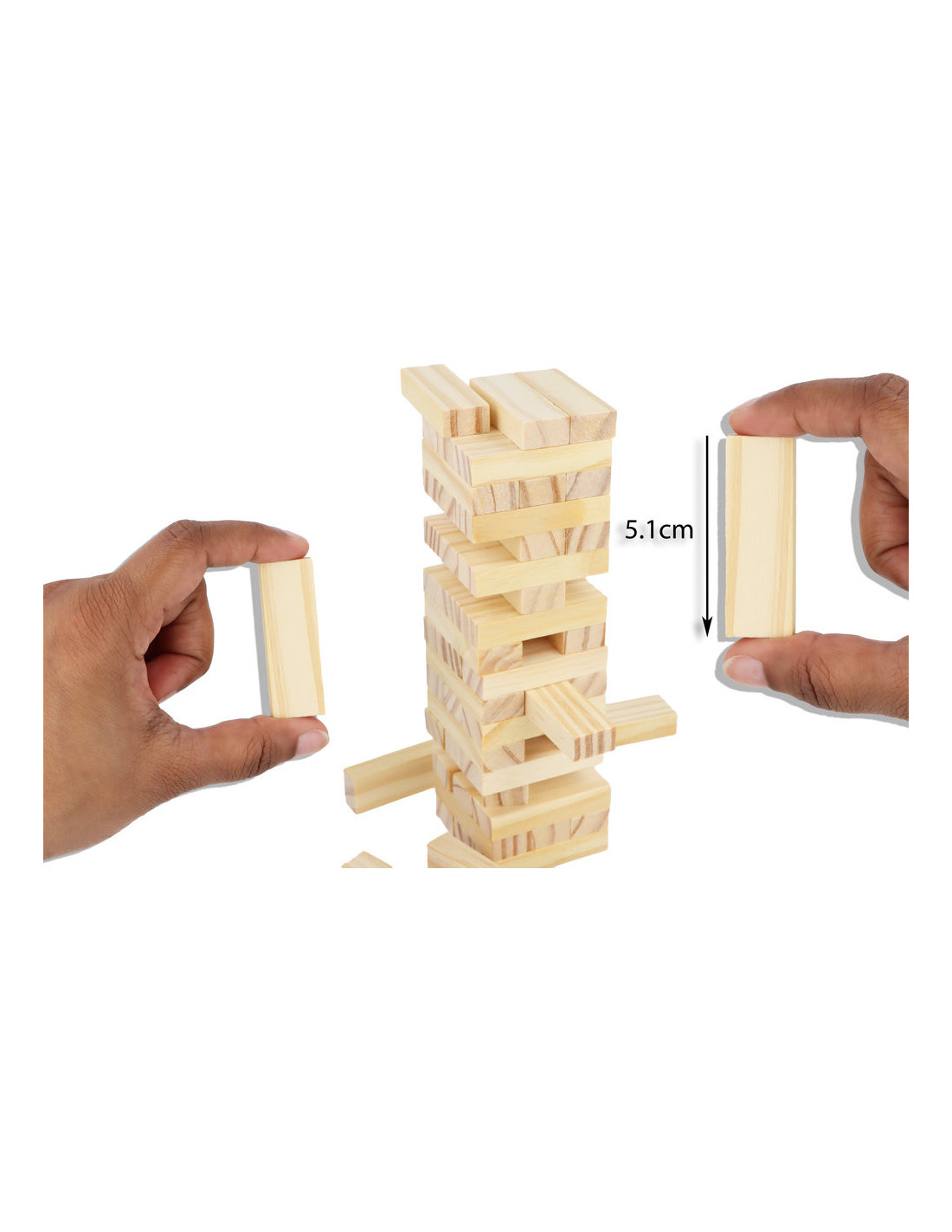 Ontdek wie de toren het langst kan balanceren met dit stapelspel. Bouw eerst de toren op door de blokjes in rijtjes van 3 op te stapelen, start vervolgens het duel in het balanceren van de toren. Aantal blokjes: 54 stuks
