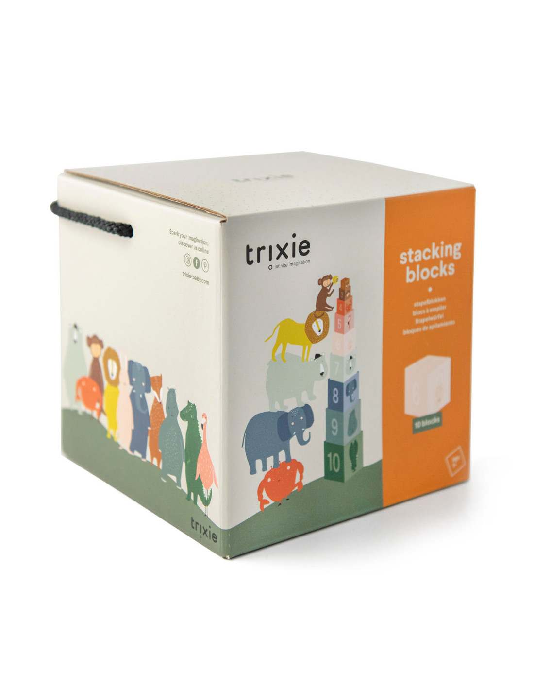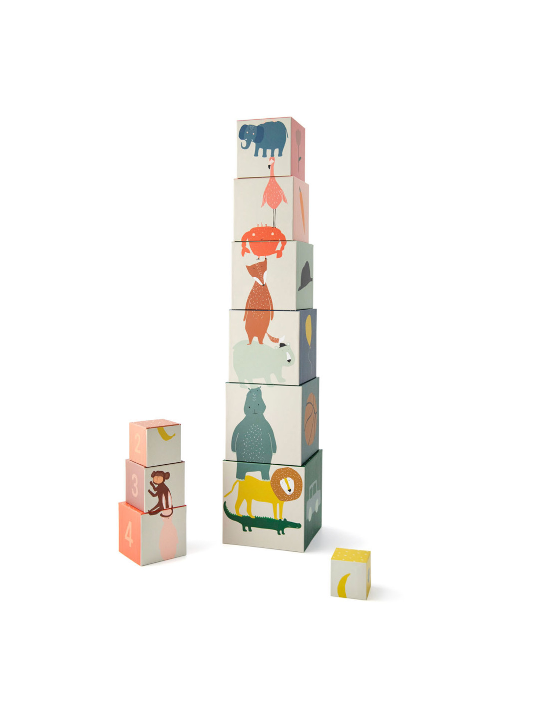 Pret gegarandeerd met deze stapelblokken! Aan elke kant van de blokken kan je een ander thema ontdekken, zodat kinderen op een speelse manier kunnen bijleren. De set bestaat uit 10 kleurrijke blokken. Kinderen kunnen de blokke, stapelen, een leuke dierenpuzzel maken, de blokken op grootte sorteren, leren tellen of voorwerpen benoemen. Er zijn talloze manieren om met deze blokken te spelen. Dat maakt ze een absolute must-have onder het kinderspeelgoed! De blokken zijn gemaakt van sterk FSC© karton en zijn bedrukt met soya inkt.