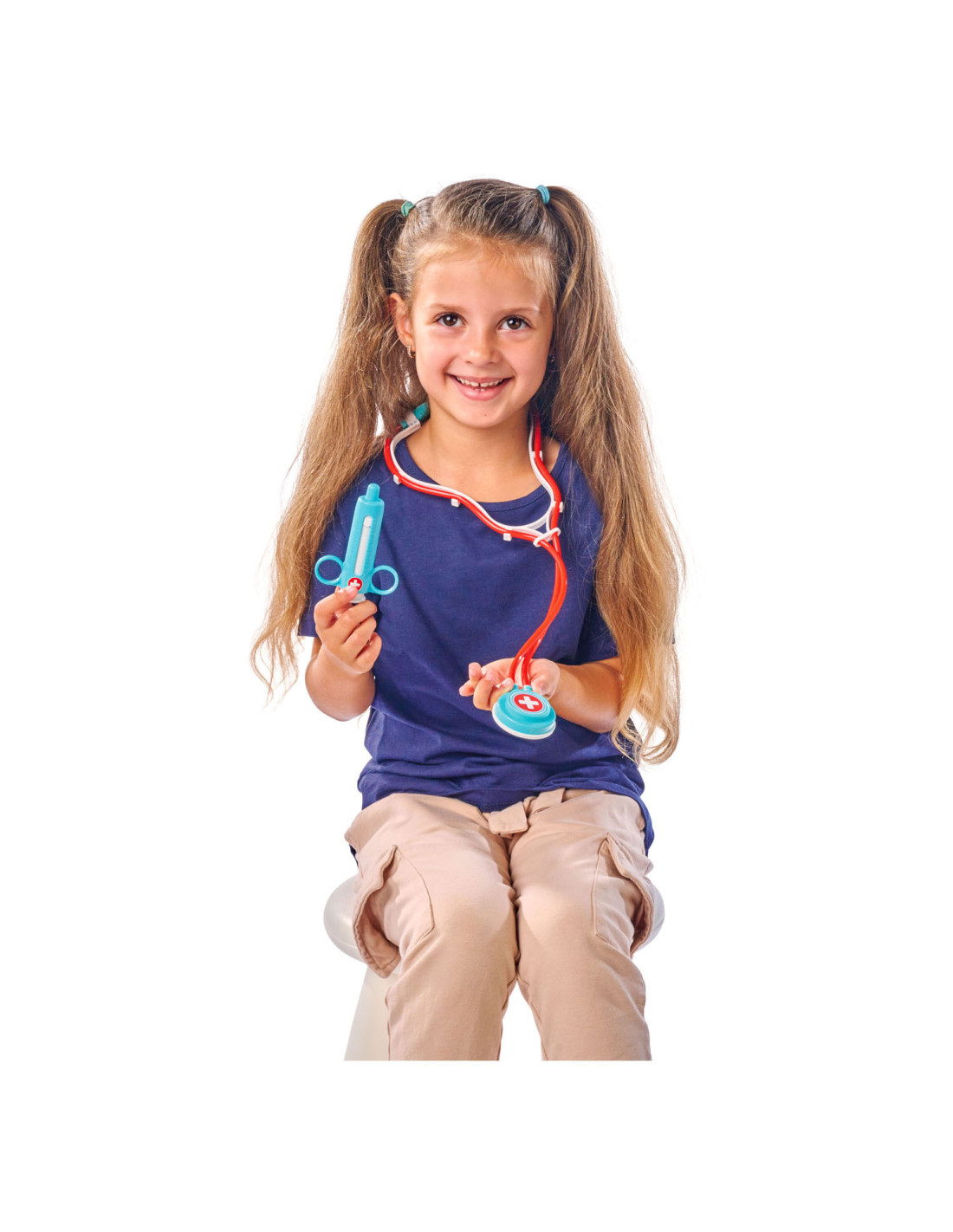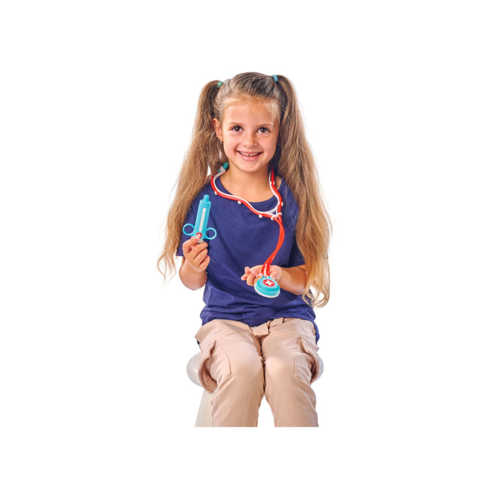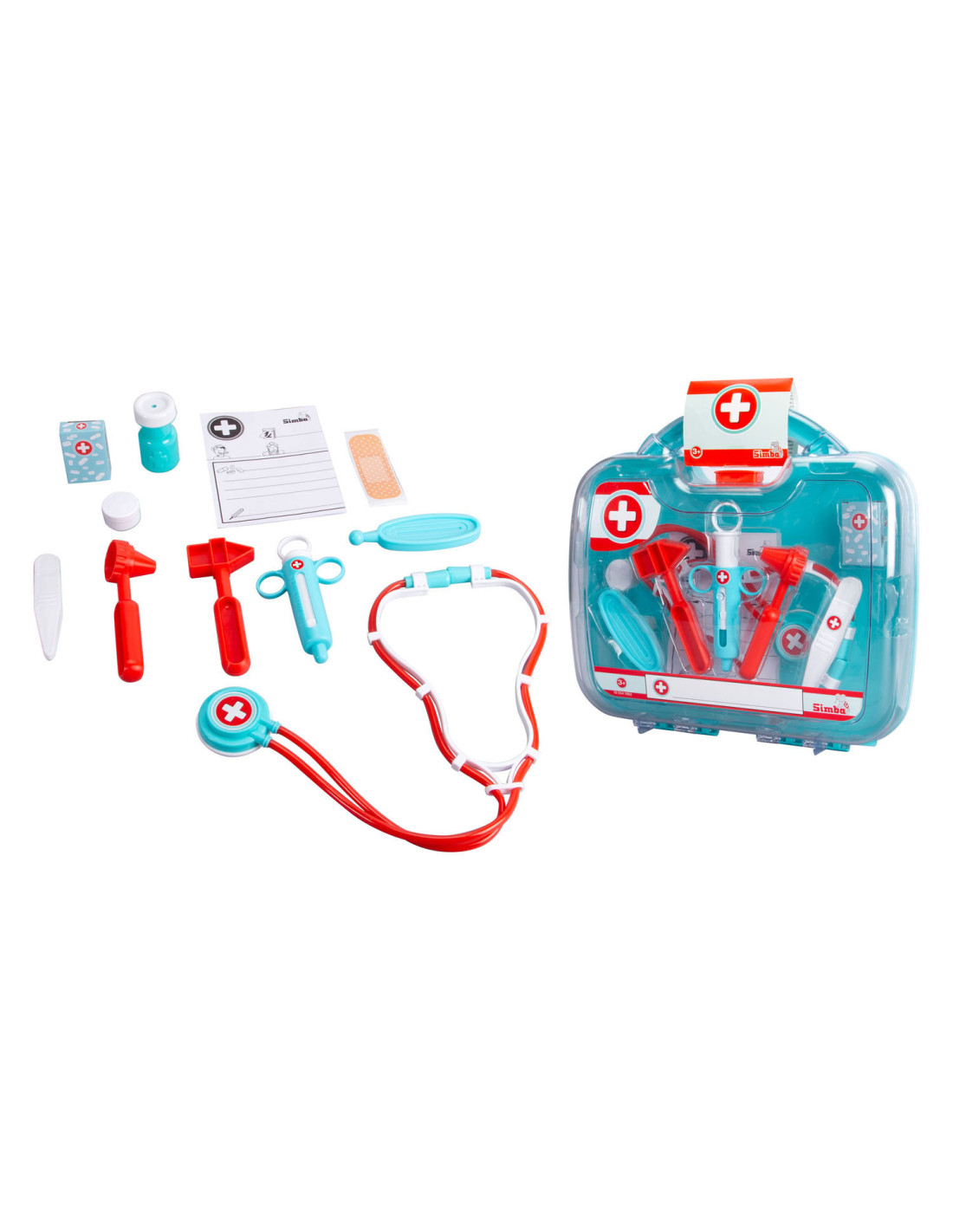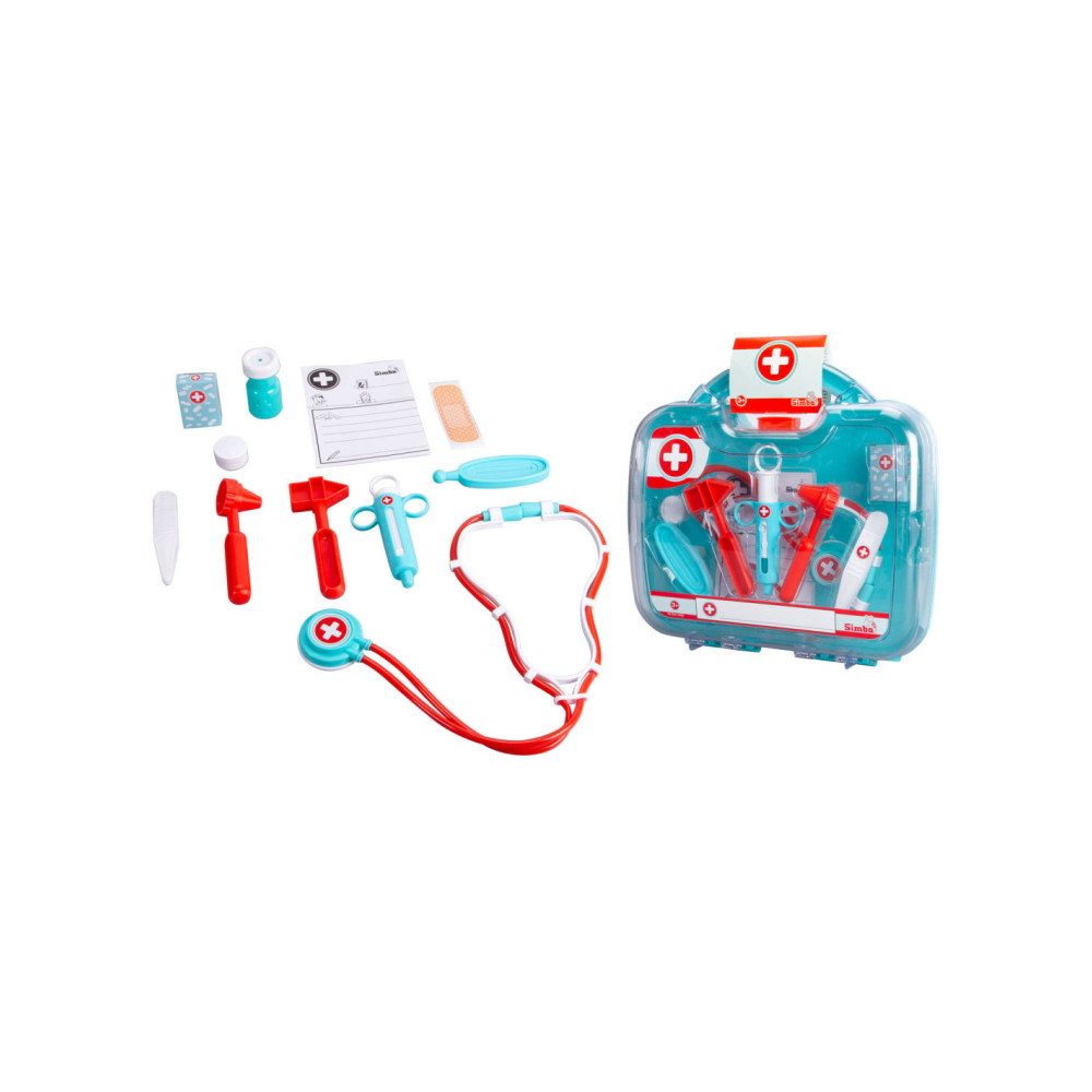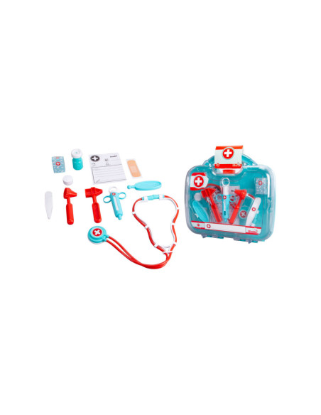 Kunststof dokterskoffer met 12 accessoires, waaronder een stethoscoop, een doktersbriefje, een thermometer en een pleister. Geschikt vanaf 3 jaar.