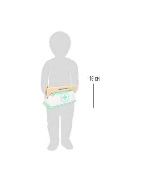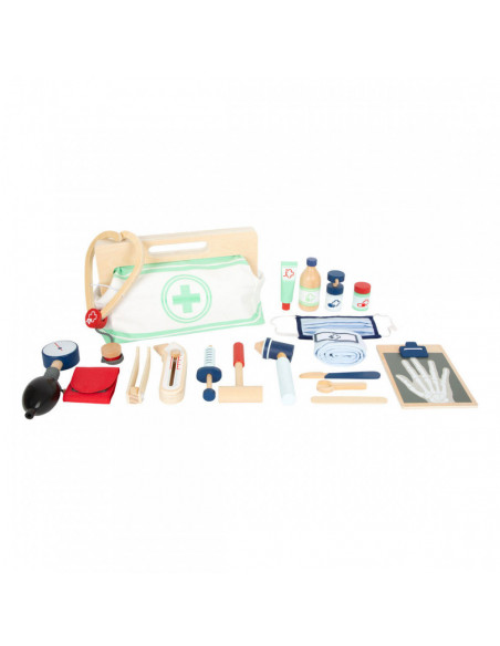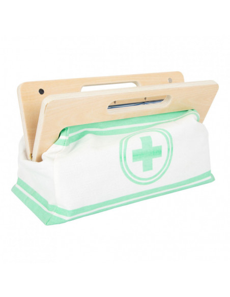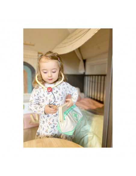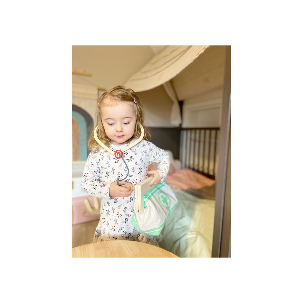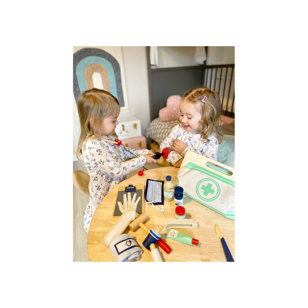 Met deze standaard dokterstas zijn de jonge, aspirant-medici perfect uitgerust! De tas van zachte stof maakt visueel en functioneel een geweldige indruk met zijn gemakkelijk te openen grepen die worden gesloten met magneten en gemaakt van natuurlijk hout. De binnenkant van de tas bevat alles wat nodig is voor een nepbehandeling: een stethoscoop, een thermometer, een speelgoedspuit en nog veel meer - allemaal gemaakt van robuust hout! De highlights zijn de bloeddrukmeter met pompbal en de otoscoop met echt vergrootglas.