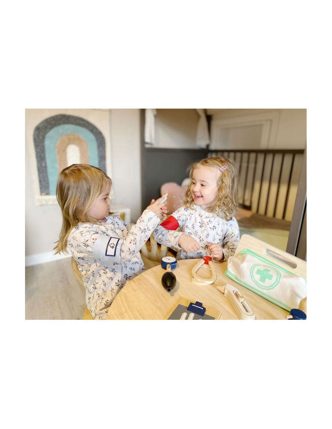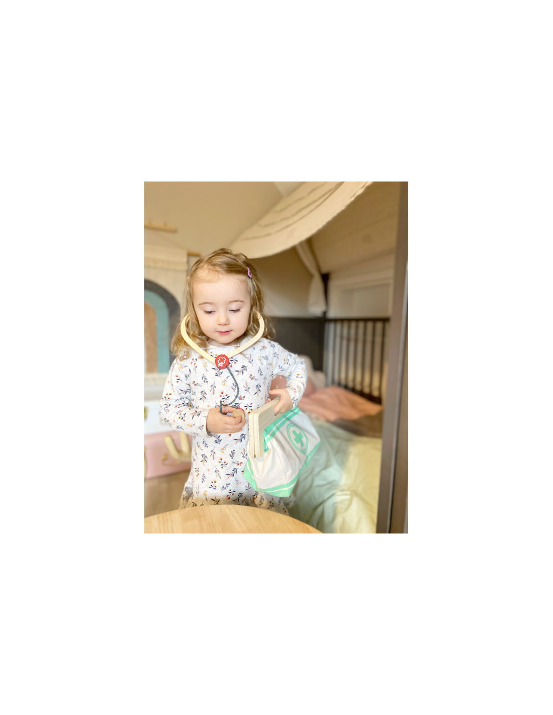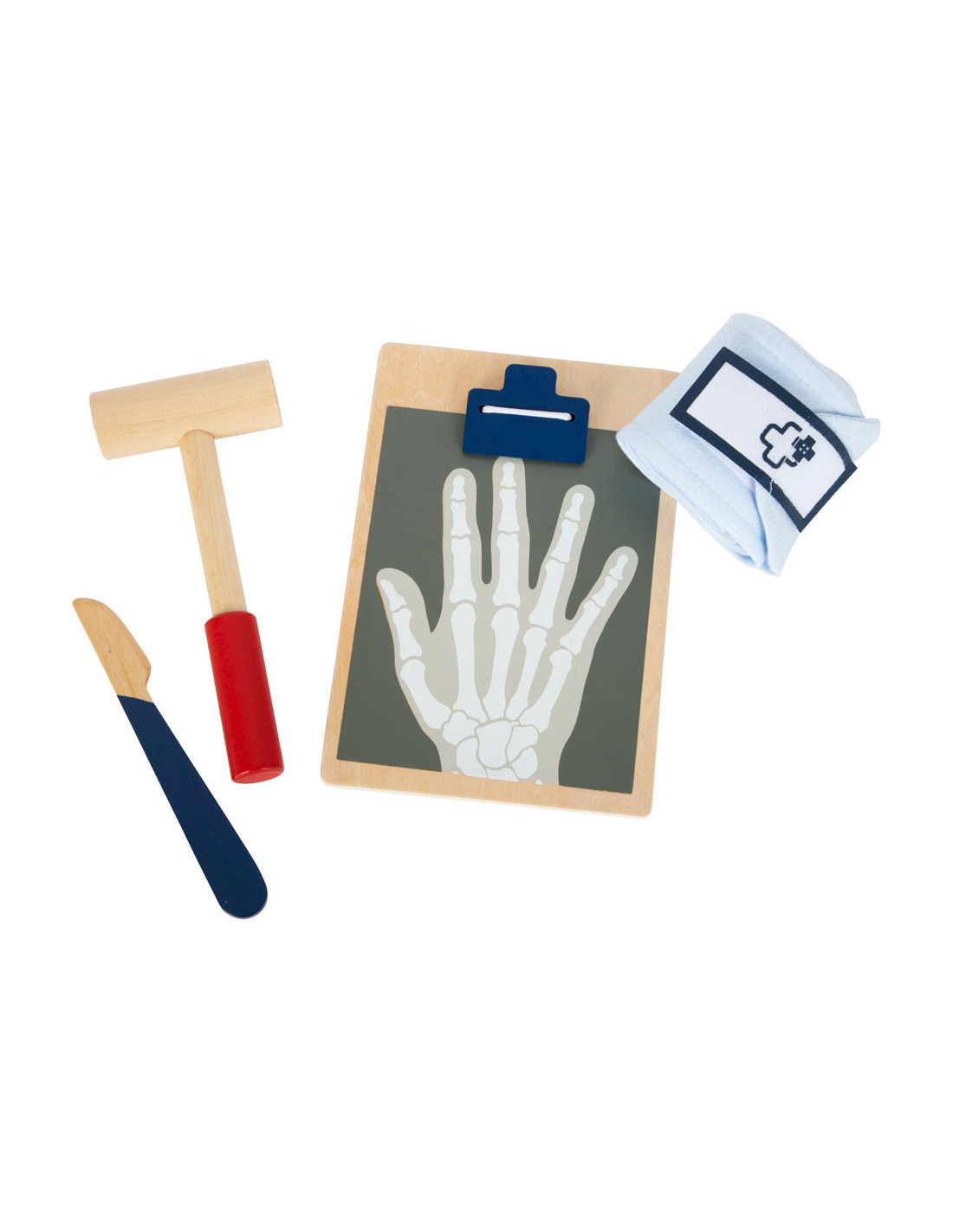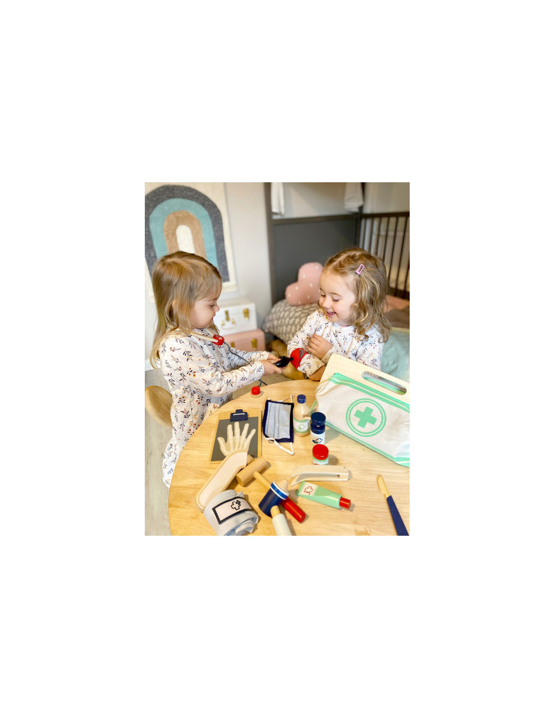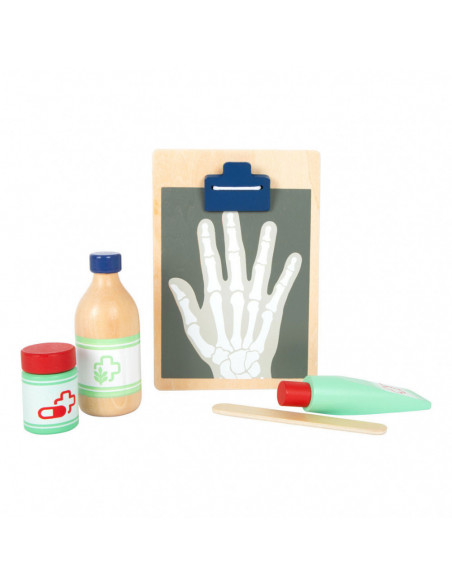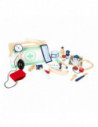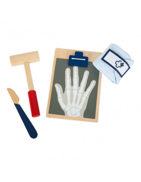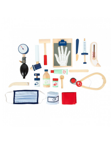 Dit is een uitgebreide set doktersspeelgoed die veel "echte" gebruiksvoorwerpen en apparaten uit de medische industrie bevat en alles samenbrengt wat kinderen nodig hebben voor een dokter-patiënt rollenspel! Met dit robuuste en haptisch aangename houten medische speelgoed kunnen kinderen dingen ontdekken en oefenen in rollenspel dat typisch is voor een doktersbezoek. De illustraties op de gebruiksvoorwerpen geven hints over waar ze tijdens het spelen voor kunnen worden gebruikt. Ideaal voor als je onderweg bent!