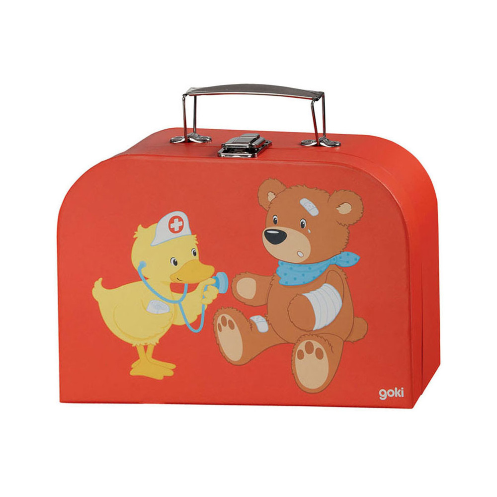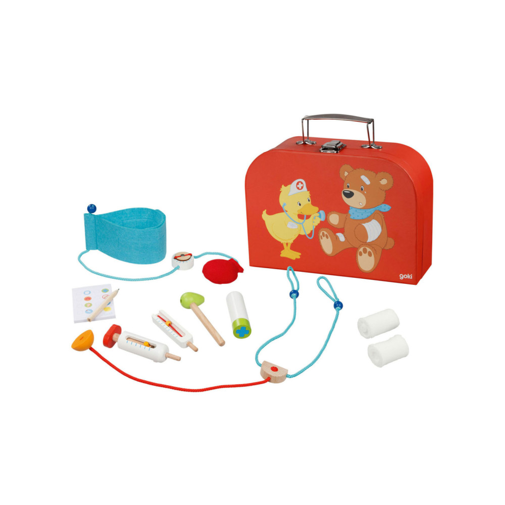 De dokterskoffer met een twist! Angst voor een bezoek aan de dokter is natuurlijk niet fijn voor kindjes. Het is dus erg nuttig om de situatie tussen arts en patiënt in een rollenspel na te spelen. De goki dokterskoffer is hier perfect voor. Zelfs het uiterlijk van de koffer geeft aan: "Hier word je zeer gevoelig en liefdevol behandeld". Alle belangrijke instrumenten zijn aanwezig in de dokterskoffer, in een bij de leeftijd passend ontwerp. Of het nu een vriendje of een favoriete teddybeer is: iedereen kan zonder problemen behandeld worden. Tegelijkertijd wordt de taalvaardigheid getraind. Laten we hopen dat de patiënt zijn arts ook begrijpt!