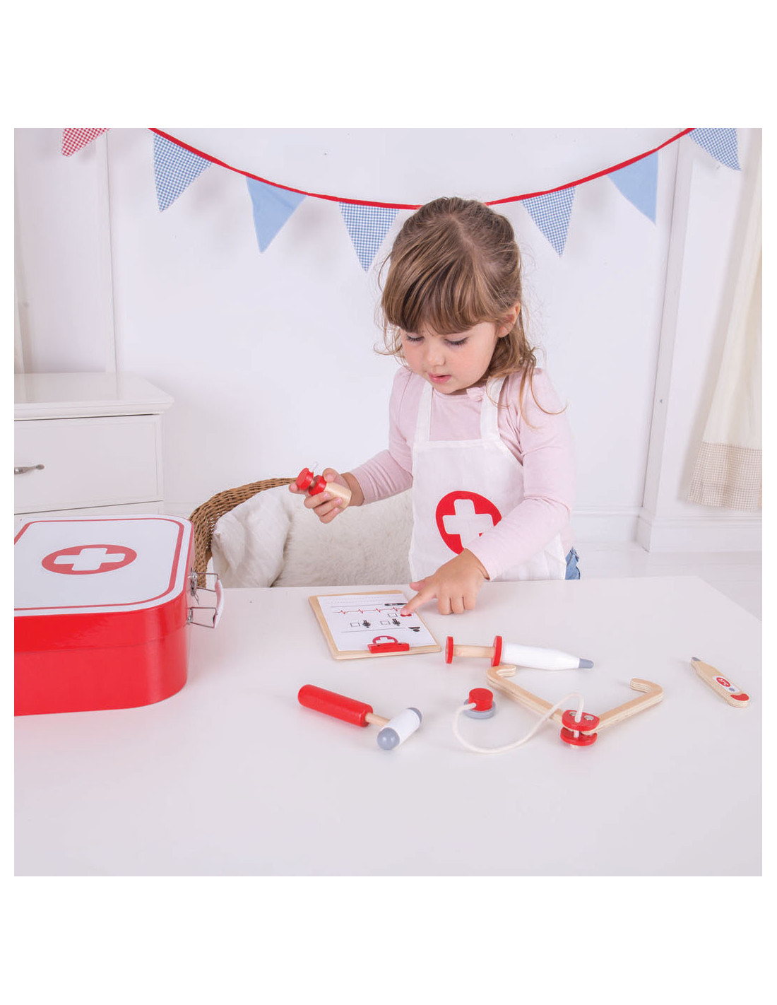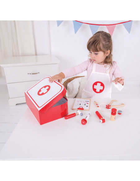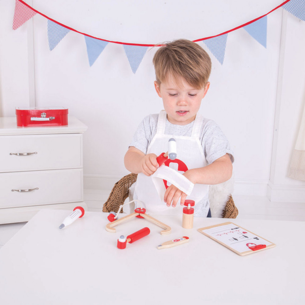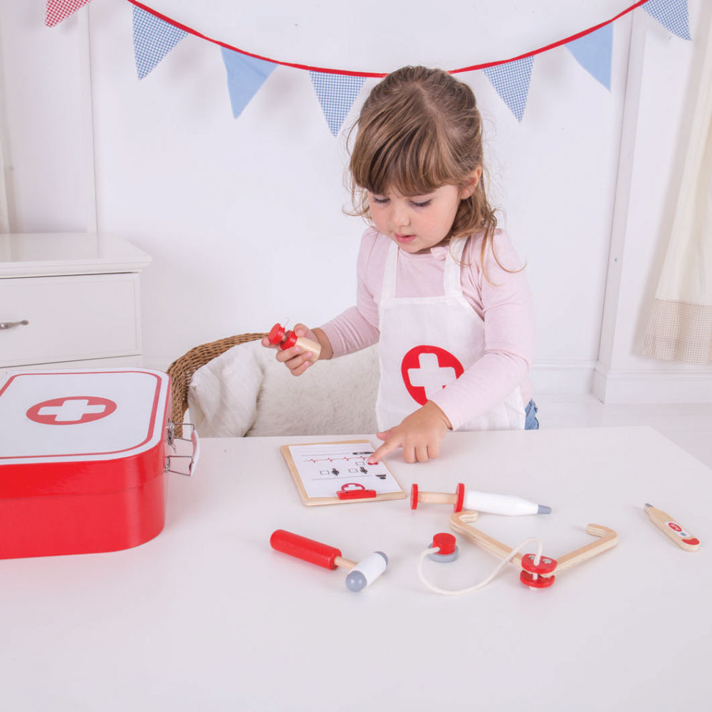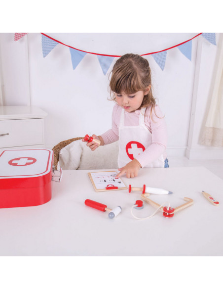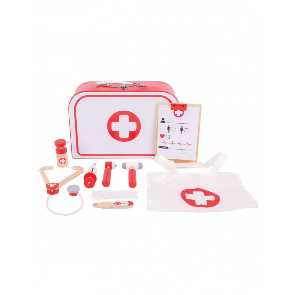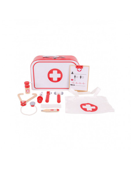 Word een echte dokter met deze houten dokterset van Bigjigs. De set bestaat uit een dokterskoffer, stethoscoop, thermometer, hamer, otoscoop, inhaler, Notitiehouder met dokterspapieren en een schort.