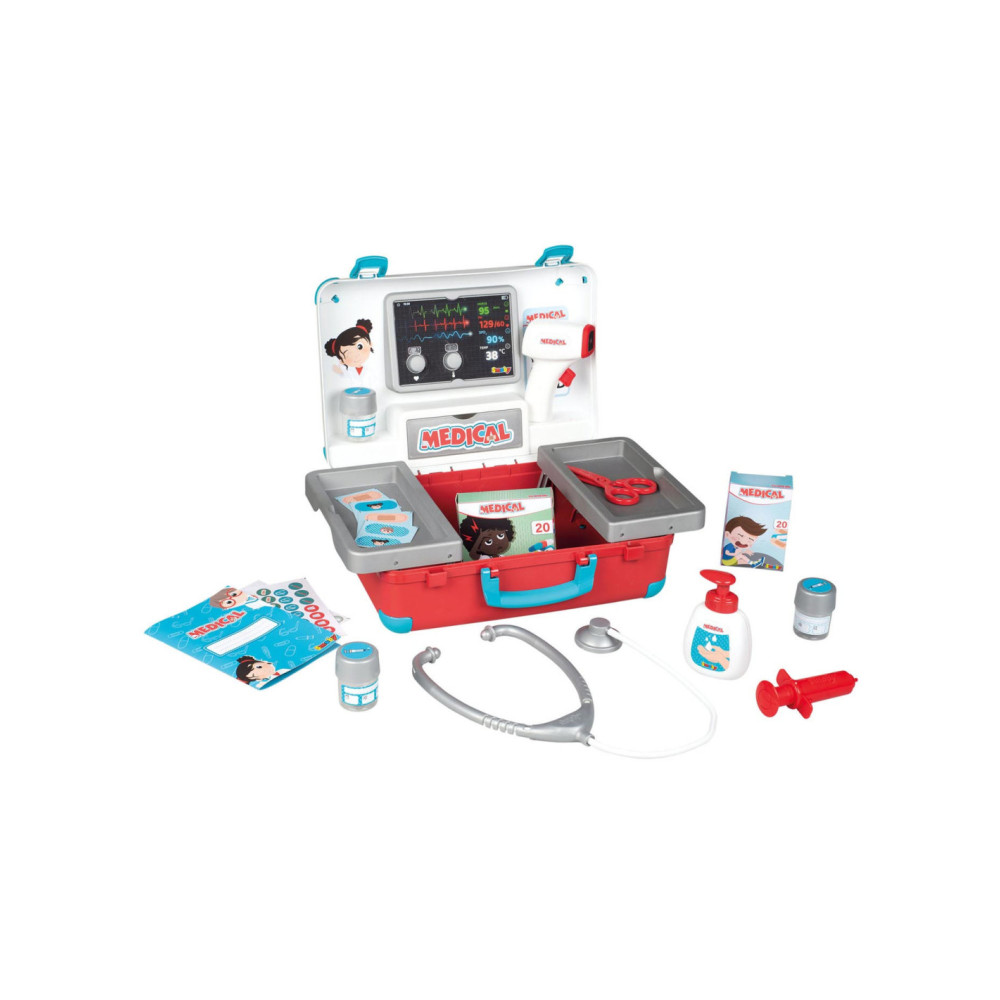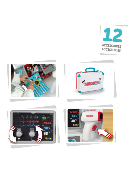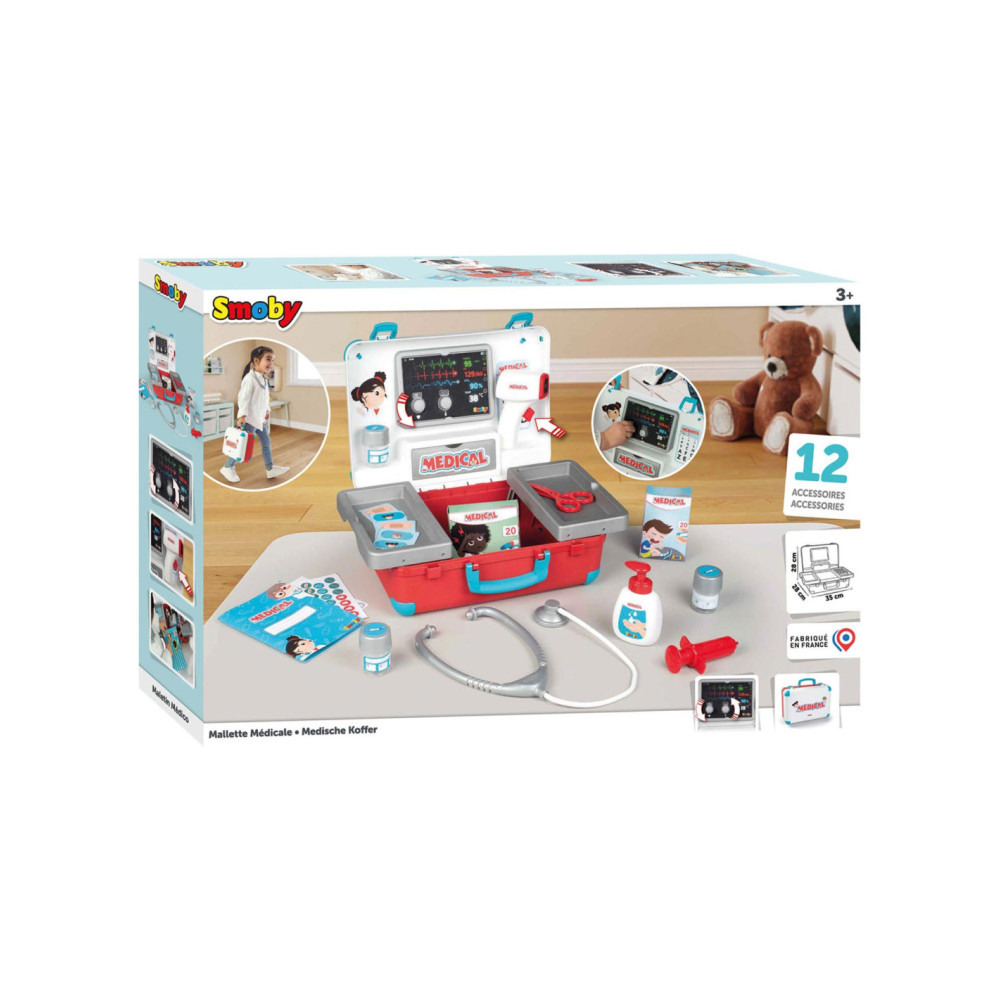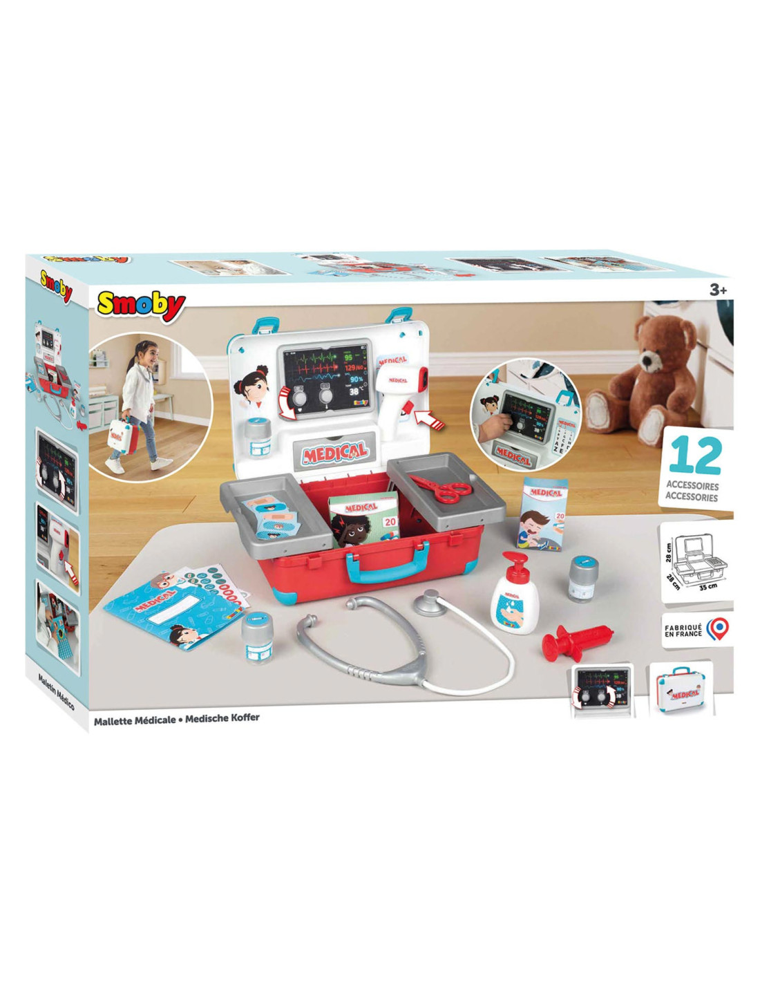 12-delige dokterskoffer van Smoby. In de handige opbergkoffer met sluitclips zitten 12 doktersattributen zoals een schaar, een thermometer, stethoscoop en een spuitje. Aan de binnenzijde van de deksel zie je de hartmonitor, waarop de hartslag, bloeddruk, saturatie en temperatuur leesbaar is. De 12-delige dokterskoffer heeft een formaat van 35 x 28 x 28 centimeter en is gemaakt van kunststof. Geschikt voor kinderen vanaf 3 jaar.