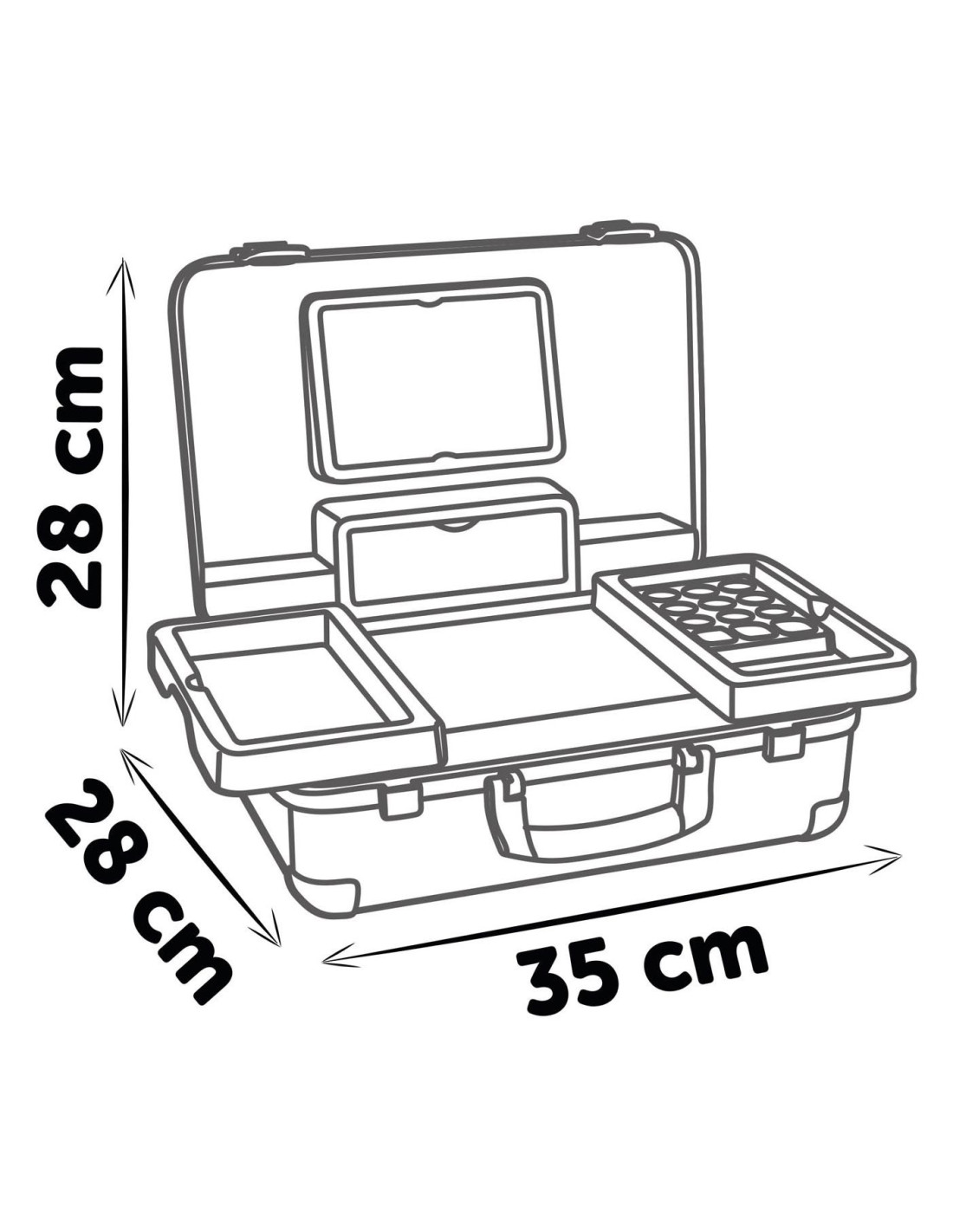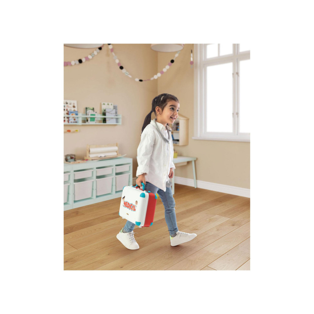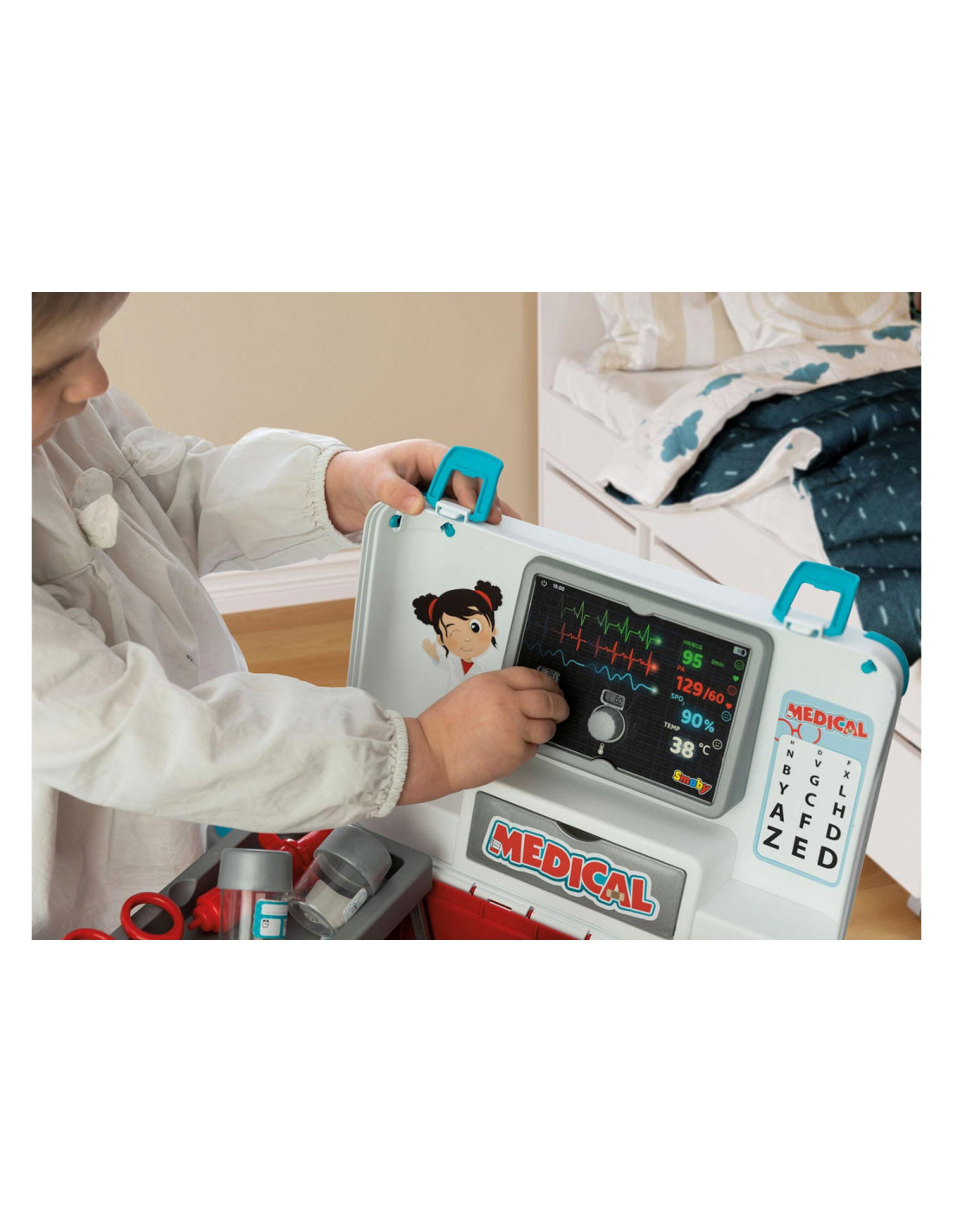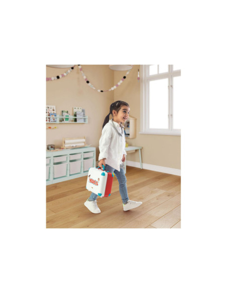 12-delige dokterskoffer van Smoby. In de handige opbergkoffer met sluitclips zitten 12 doktersattributen zoals een schaar, een thermometer, stethoscoop en een spuitje. Aan de binnenzijde van de deksel zie je de hartmonitor, waarop de hartslag, bloeddruk, saturatie en temperatuur leesbaar is. De 12-delige dokterskoffer heeft een formaat van 35 x 28 x 28 centimeter en is gemaakt van kunststof. Geschikt voor kinderen vanaf 3 jaar.