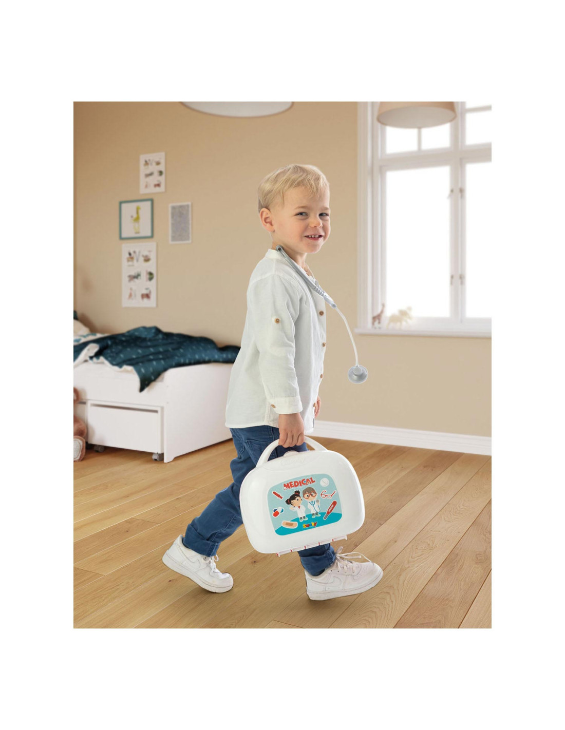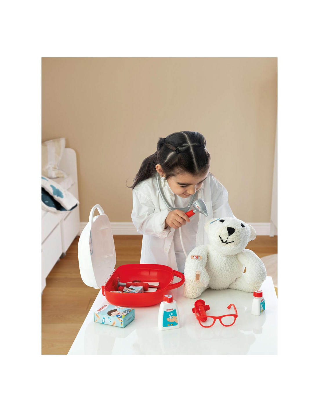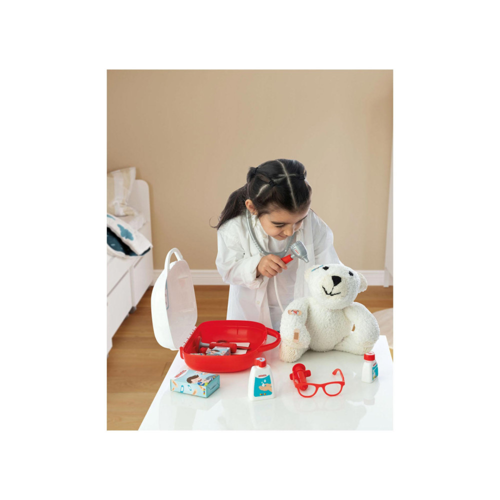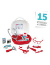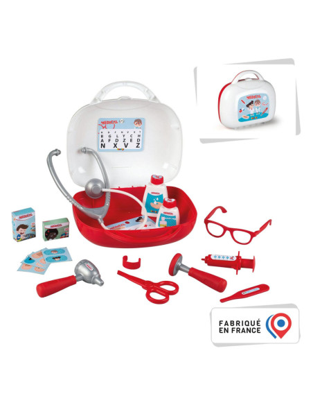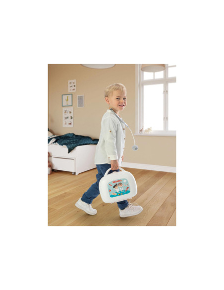 15-delige dokterskoffer van Smoby. Inhoud: 1 stethoscoop, 1 bril, 2 kaarten, 2 flesjes, 2 dummyboxen, 1 spuit, 1 thermometer, 1 schaar, 1 armband, verband, 1 otoscoop en 1 reflexhamer. De koffer is 25 x 23 x 10,5 centimeter groot en gemaakt van kunststof. Geschikt voor kinderen vanaf 3 jaar oud.