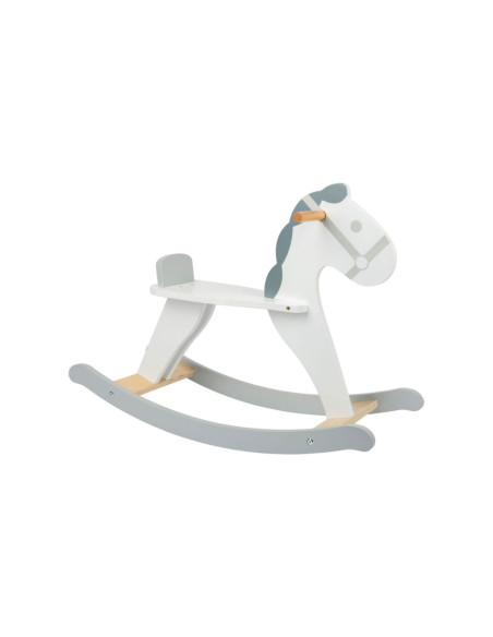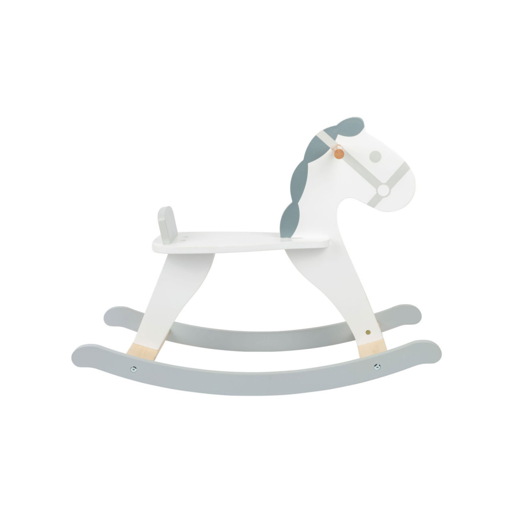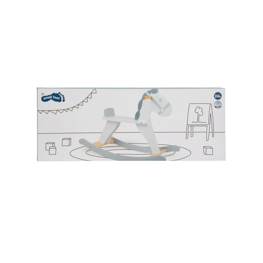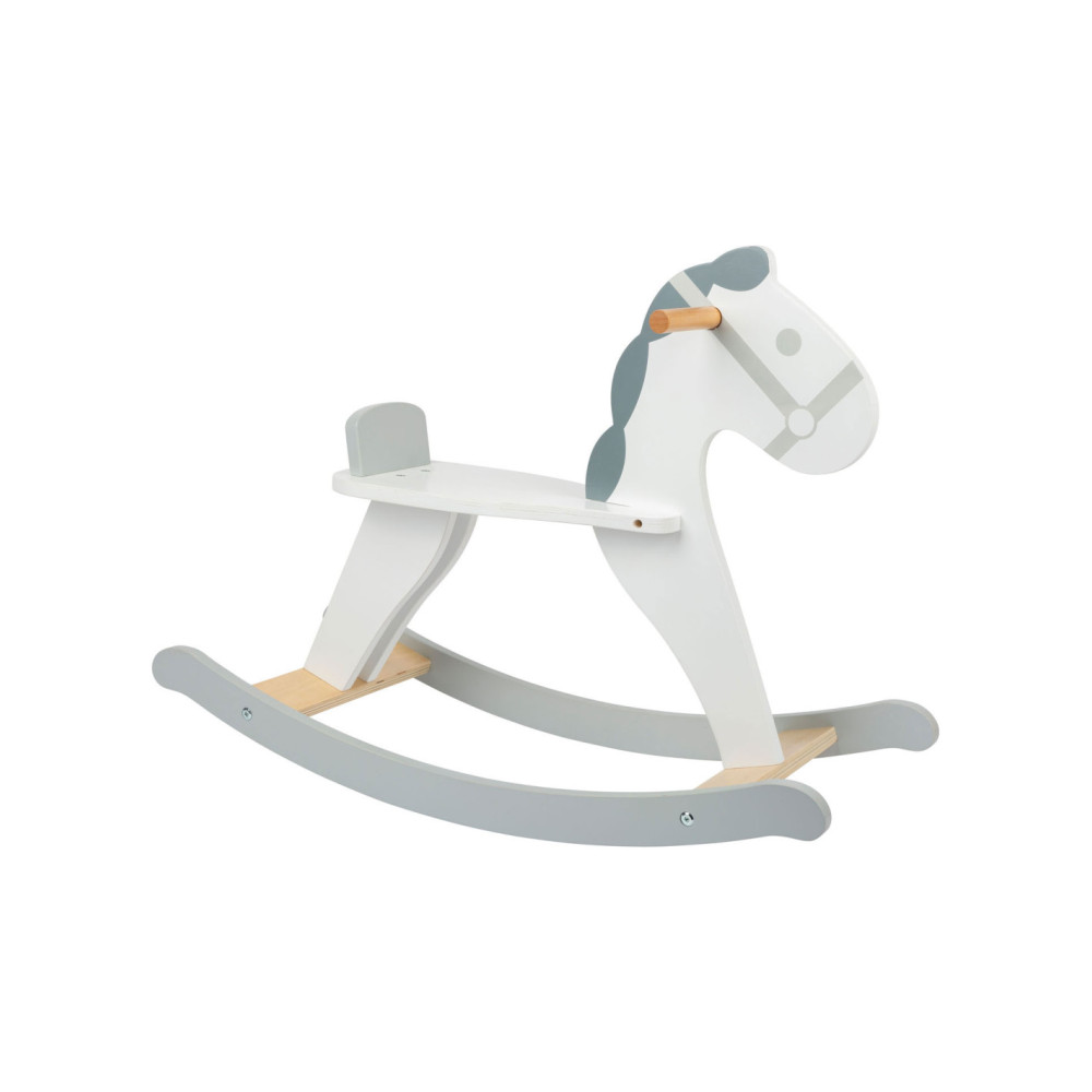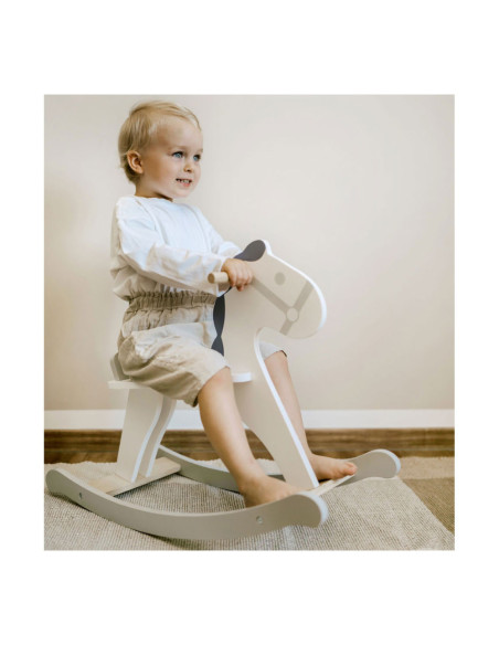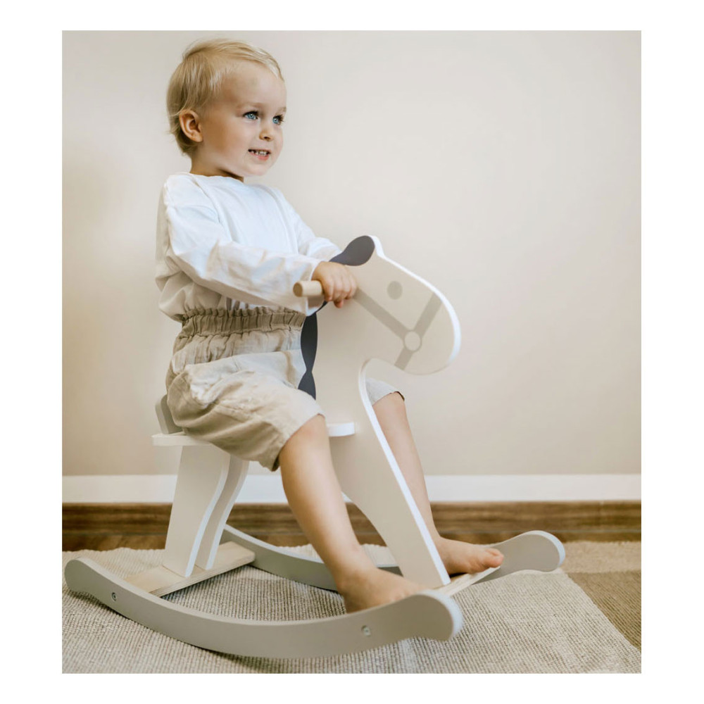 Dit hobbelpaard in een moderne, Scandinavische stijl die klanten betovert met zijn subtiele grijs-witte dessin. Het kleine paard met een vriendelijk gezicht nodigt kinderen uit tot leuke ritjes en is ook een mooie decoratie voor de kinderkamer. Terwijl de kleintjes schommelen, zorgen een rugleuning en praktische handgrepen voor een stevige houvast in het zadel. Gemaakt van stabiel multiplex en massief hout, brengt dit hobbelpaard wilde ritjes door de kinderkamer en langdurig paardrijplezier. Een klassiek speeltje in een moderne presentatie die thuishoort in elke kinderkamer!