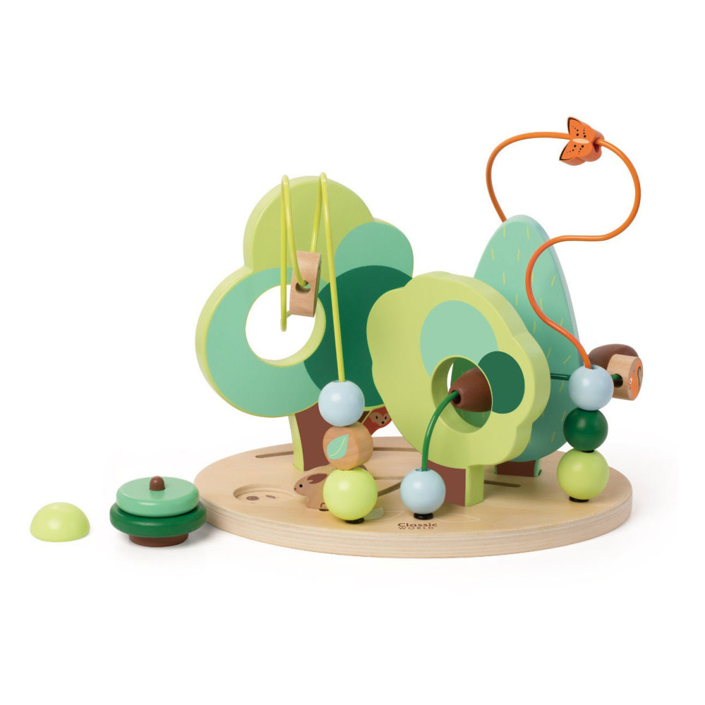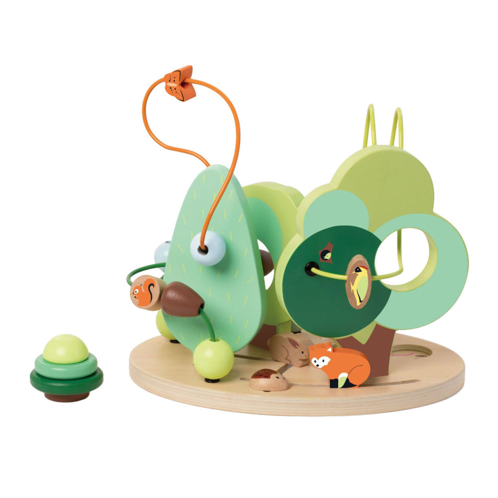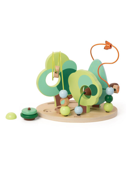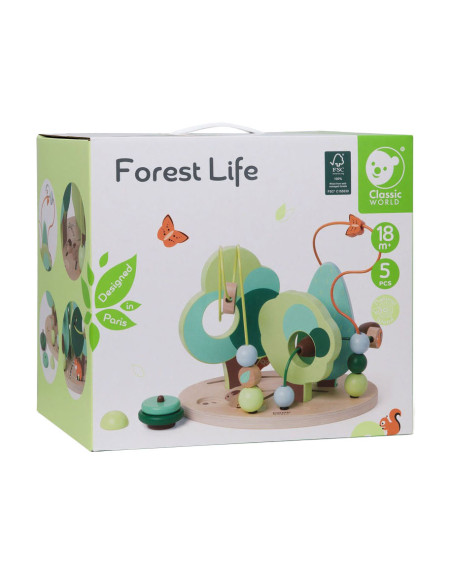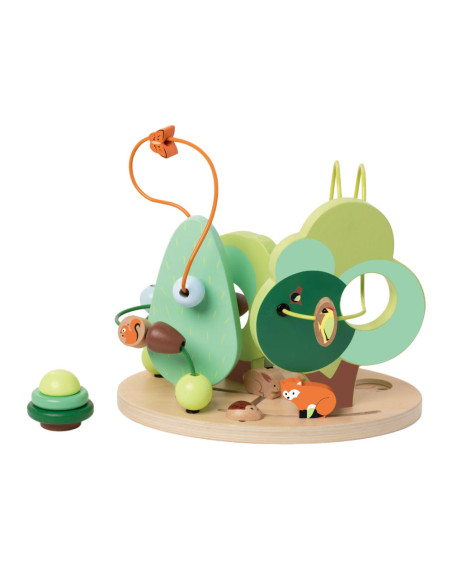 Kralendoolhof met bos-thema. In het doolhof zijn verschillende dieren te vinden die over de grond en door het doolhof kunnen bewegen. Het kralendoolhof is geschikt voor kinderen vanaf 18 maanden.