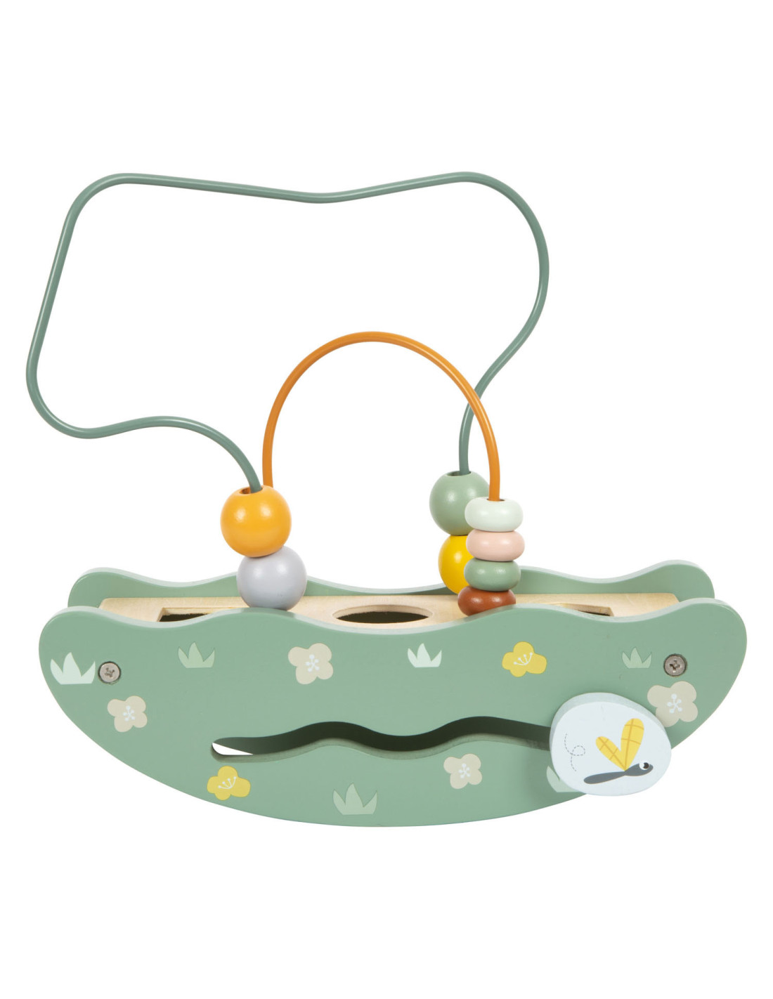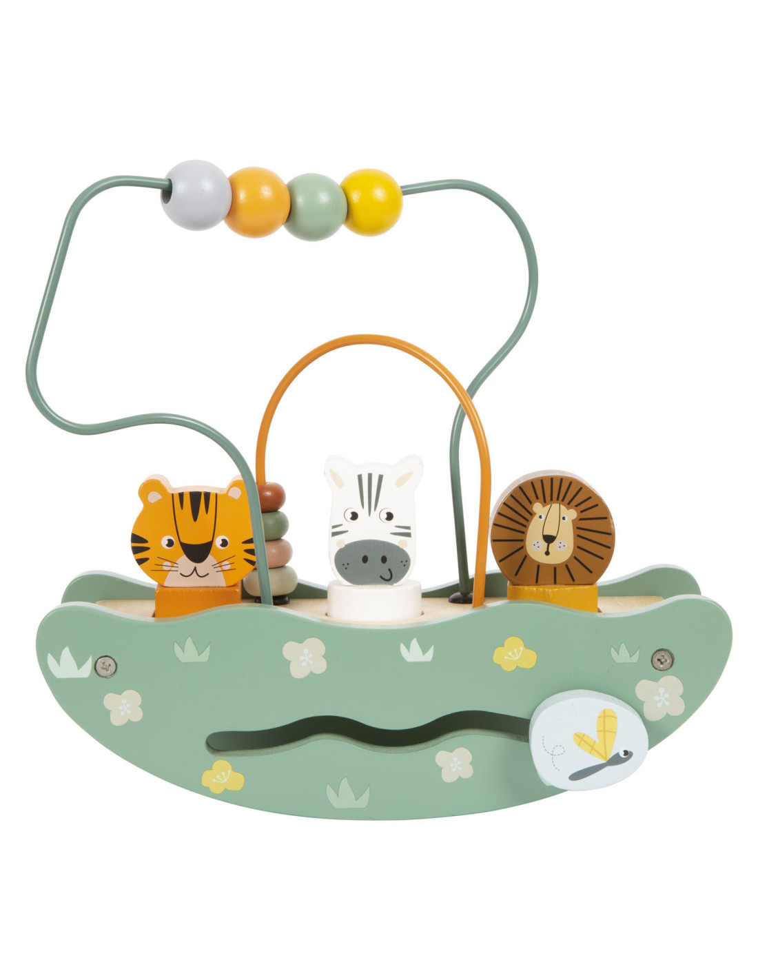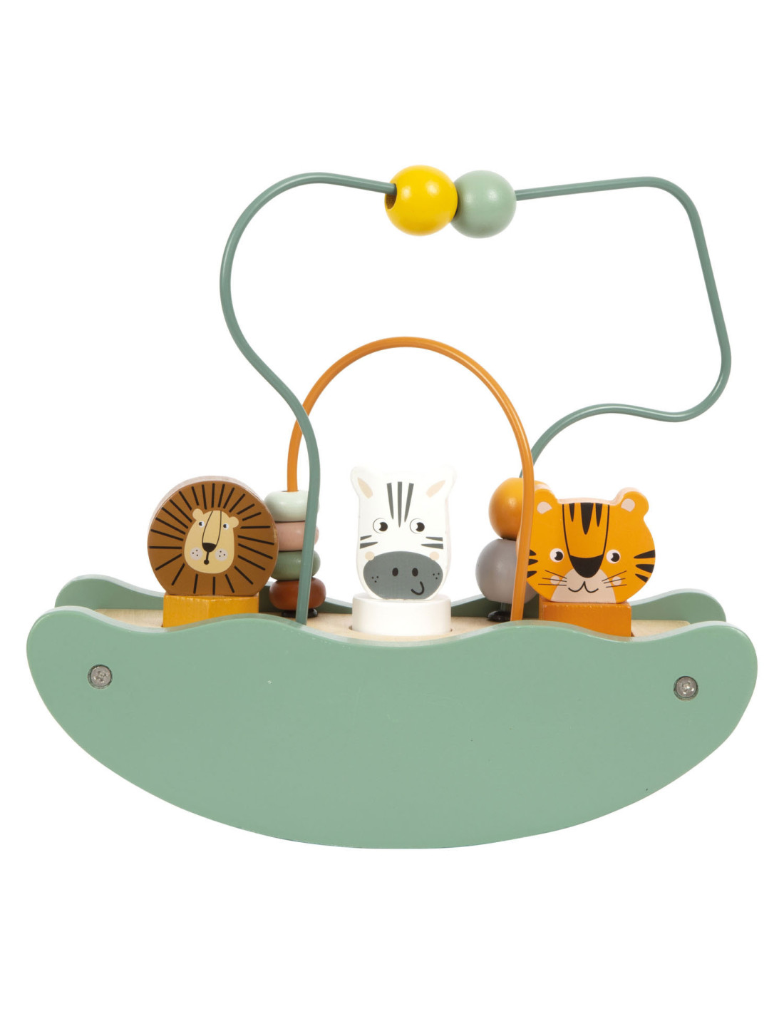Ontdekken, spelen en leren - dit veelzijdige motoriekspeelgoed in safari-look van robuust hout biedt het allemaal met een combinatie van twee kralendoolhoven met schuifspel, een vormspel en een wip. De kralendoolhoven hebben elk vier kralen in verschillende maten. Hiermee kunnen jonge ontdekkingsreizigers hun fijne motoriek trainen.