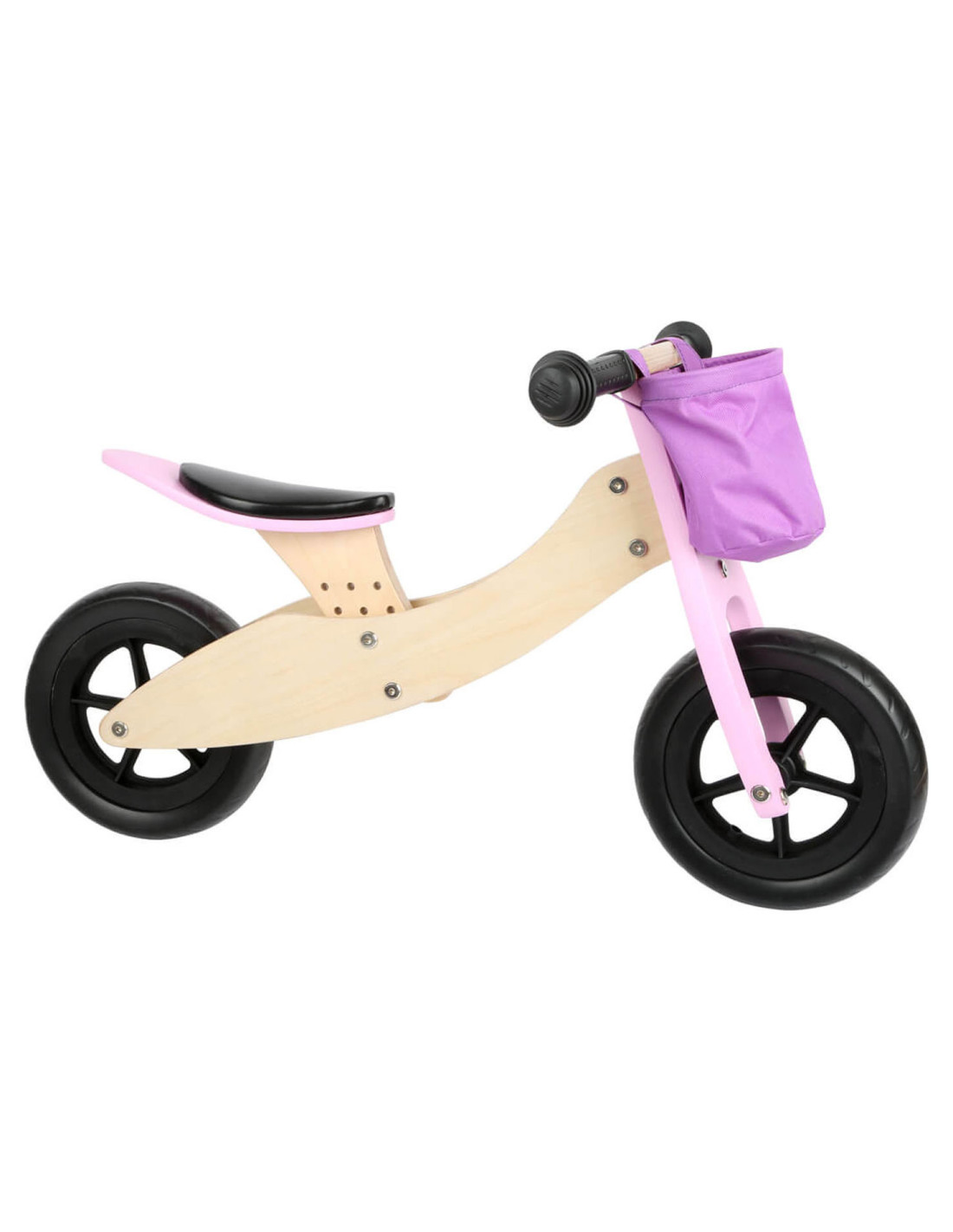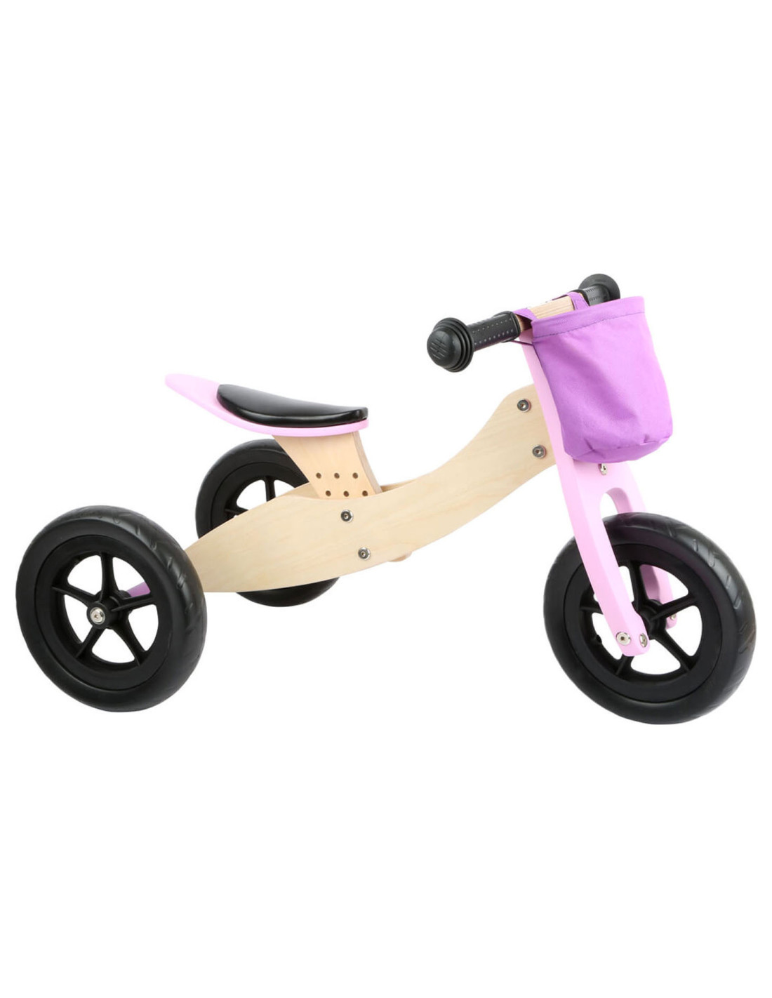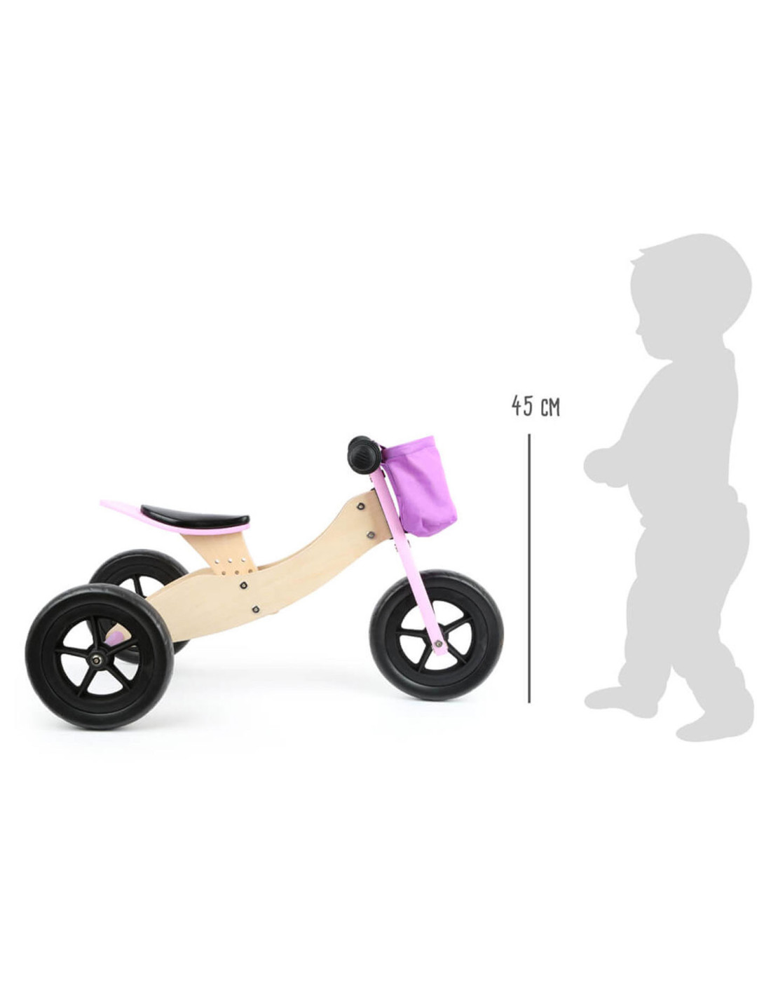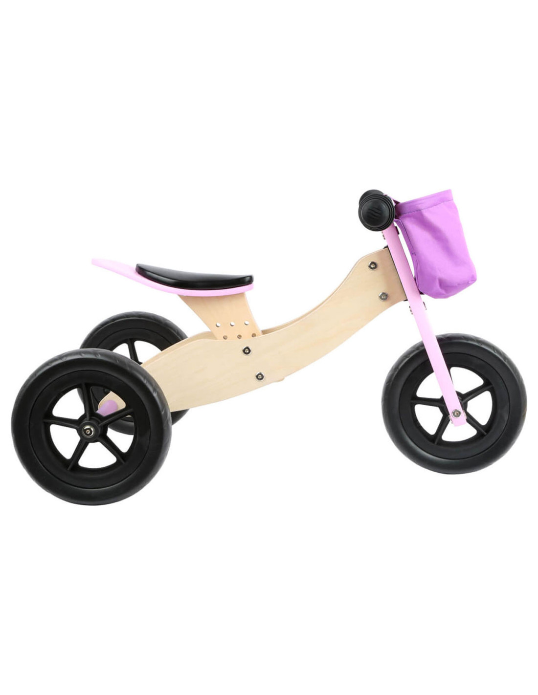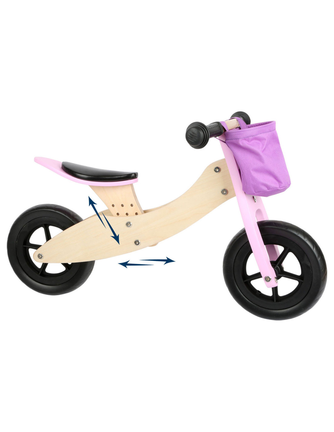 Deze lichte houten trainingsdriewieler groeit met de kinderen mee en is in hoogte verstelbaar door het op drie niveaus in hoogte verstelbare zadel en de verstelbare drietraps zitafstand! De veilige, driewielige variant met twee achterwielen is ideaal voor beginnende rijders, en als de leervoortgang en balans het toelaten, kan hij worden omgevormd tot een klassieke loopfiets! Het stuur met stuurbegrenzer biedt een extra mate van veiligheid! In de afneembare stuurtas kunnen favoriete speeltjes en andere spullen worden opgeborgen. De rubberen grips, de onverwoestbare EVA Soft bandafwerking en het zachte zadel zorgen voor veel rijcomfort.