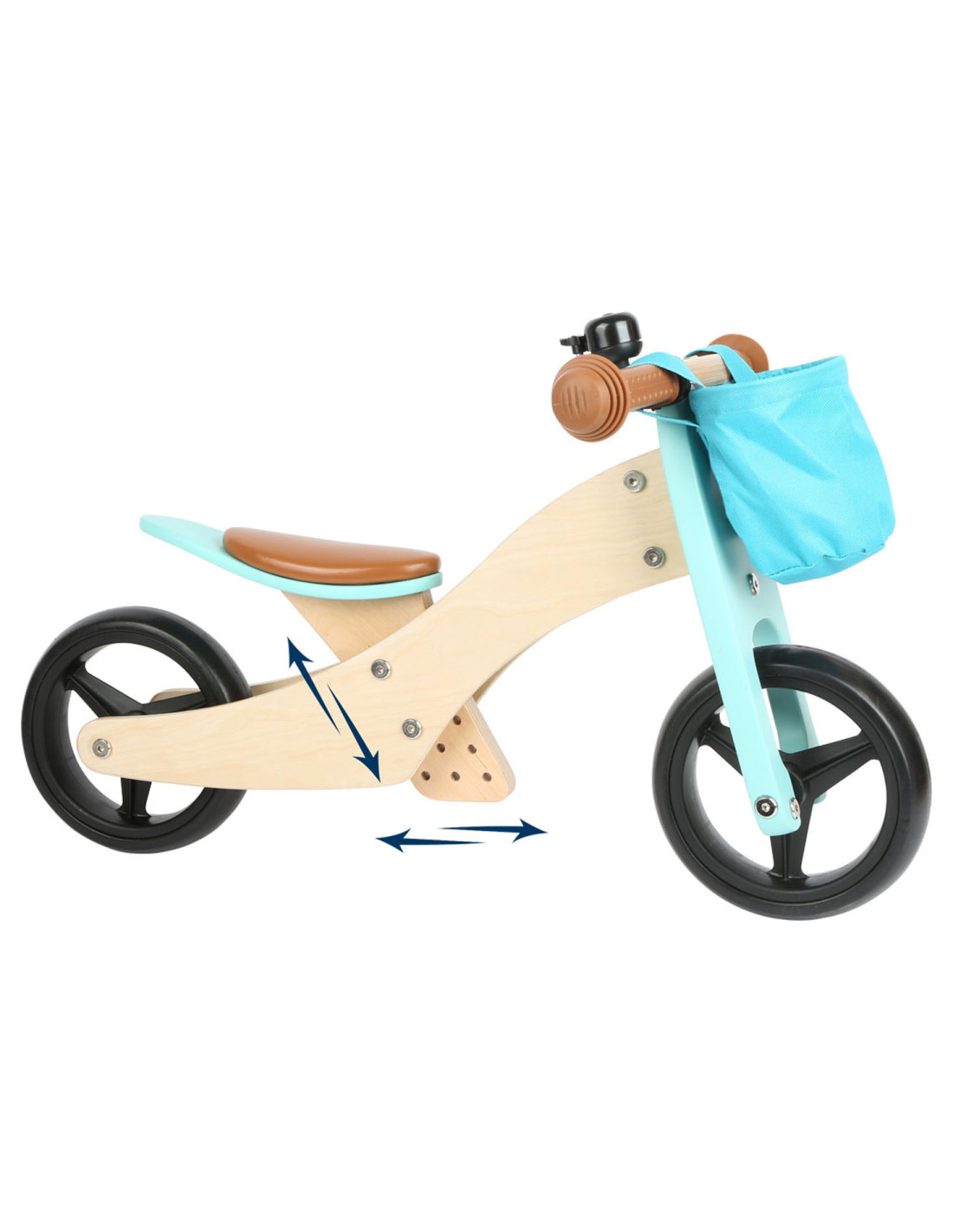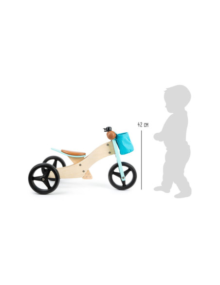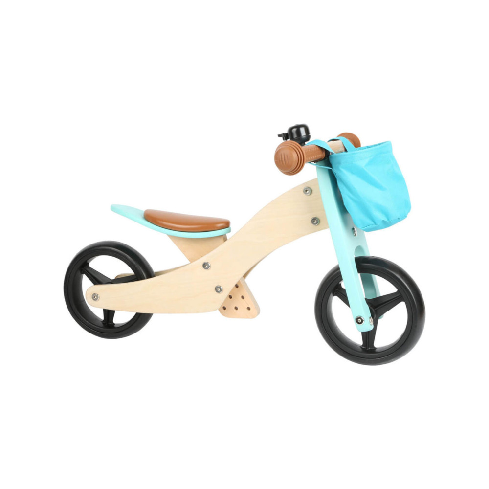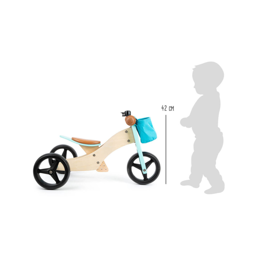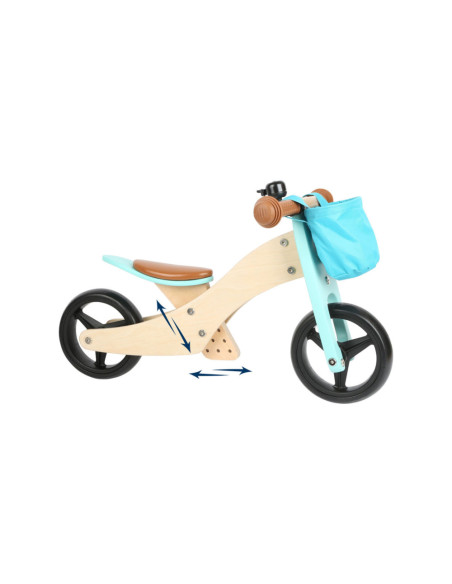 Deze lichte houten trainingsdriewieler groeit met de kinderen mee en is in hoogte verstelbaar door het op drie niveaus in hoogte verstelbare zadel en de verstelbare drietraps zitafstand! De veilige, driewielige variant met twee achterwielen is ideaal voor beginnende rijders, en als de leervoortgang en balans het toelaten, kan hij worden omgevormd tot een klassieke loopfiets! Het stuur met stuurbegrenzer biedt een extra mate van veiligheid! In de afneembare stuurtas kunnen favoriete speeltjes en andere spullen worden opgeborgen. De rubberen grips, de onverwoestbare EVA Soft bandafwerking en het zachte zadel zorgen voor veel rijcomfort.