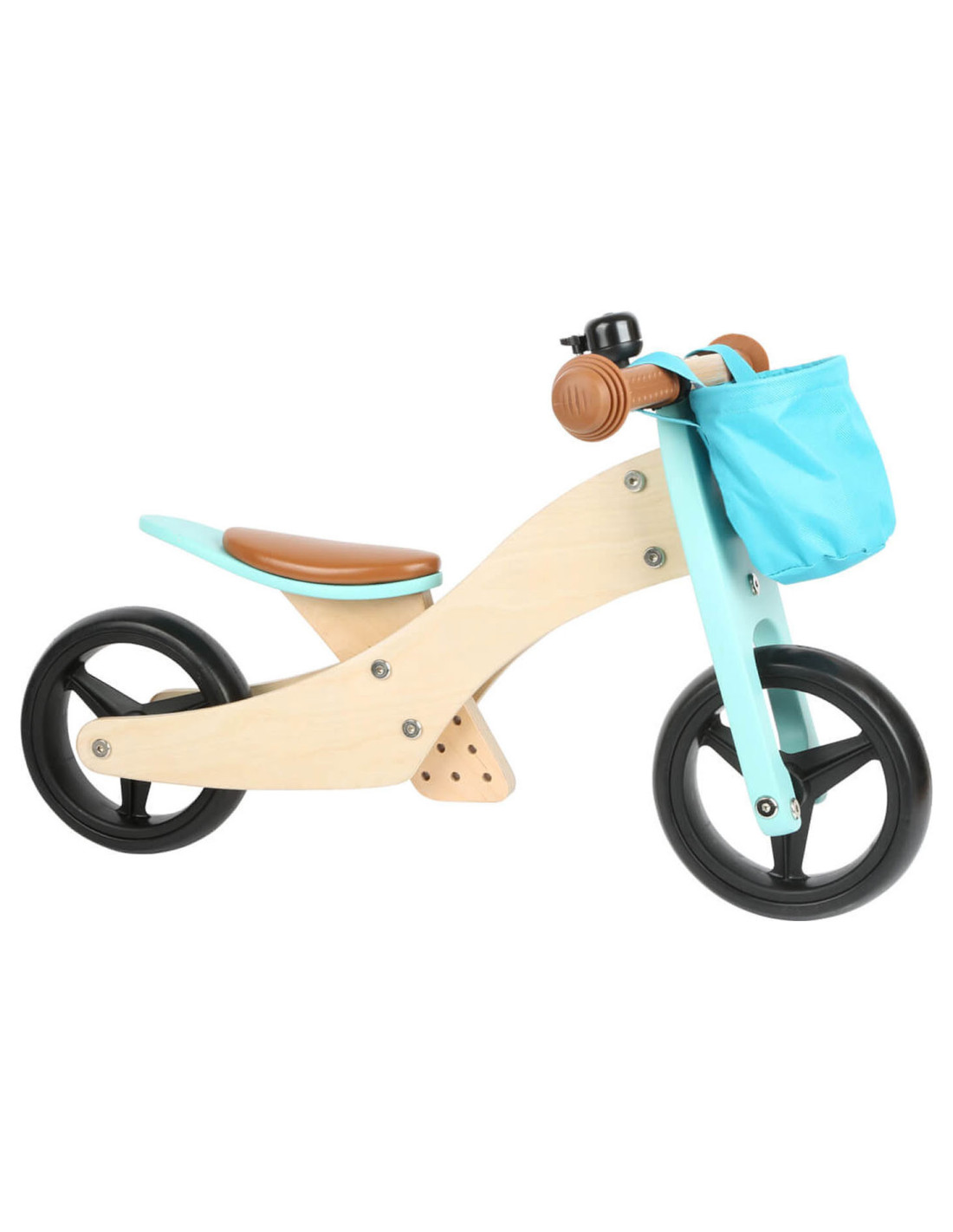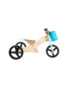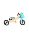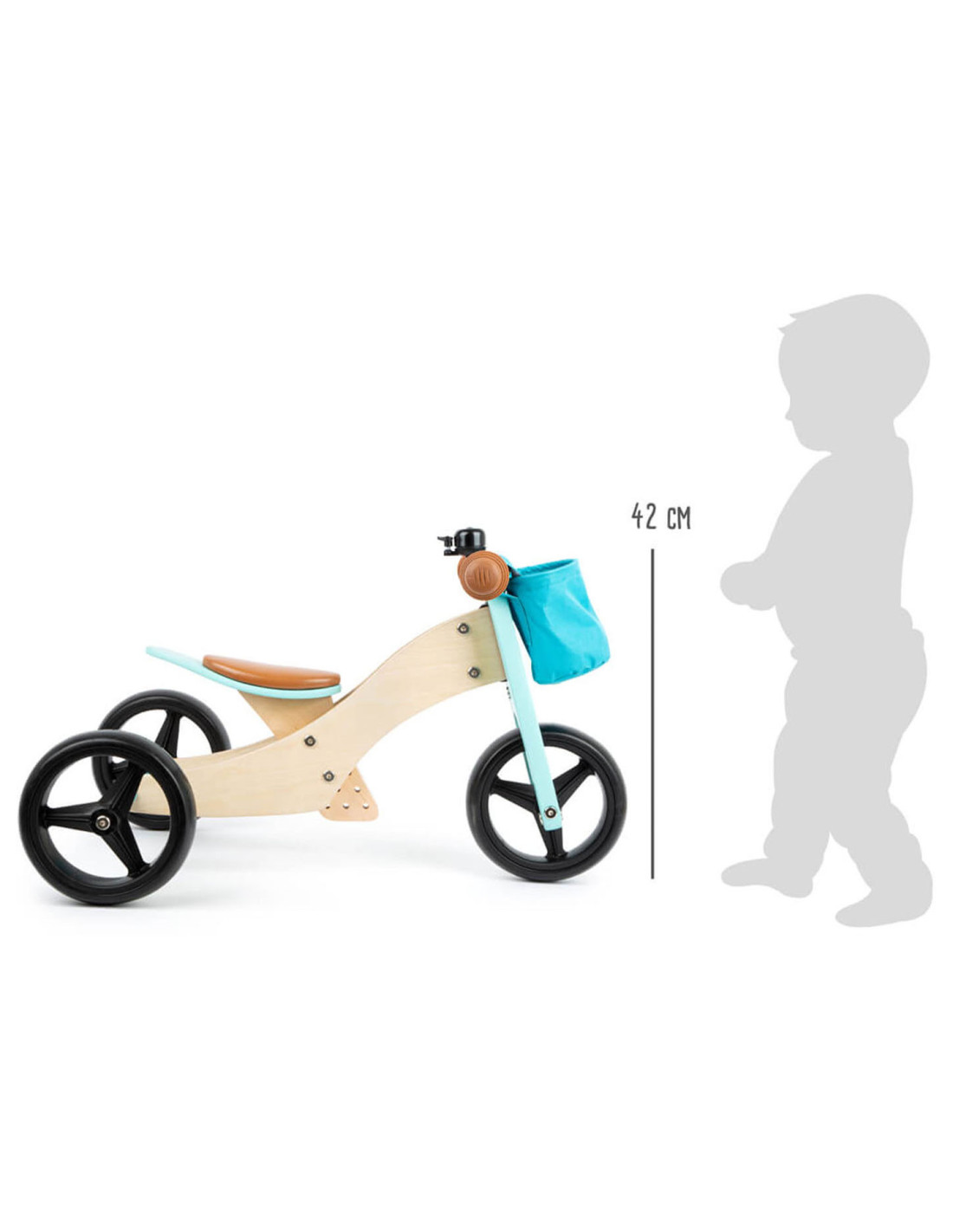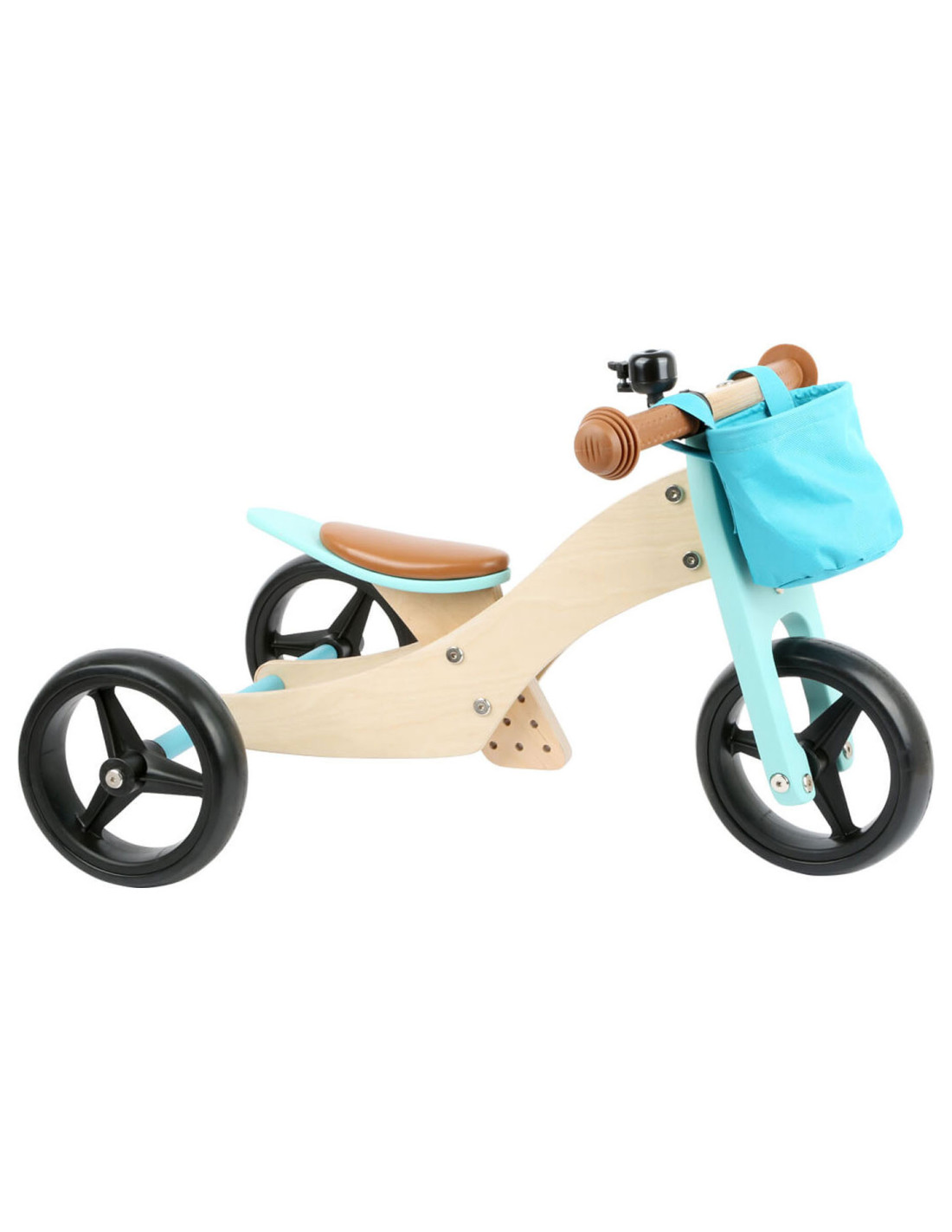 Deze lichte houten trainingsdriewieler groeit met de kinderen mee en is in hoogte verstelbaar door het op drie niveaus in hoogte verstelbare zadel en de verstelbare drietraps zitafstand! De veilige, driewielige variant met twee achterwielen is ideaal voor beginnende rijders, en als de leervoortgang en balans het toelaten, kan hij worden omgevormd tot een klassieke loopfiets! Het stuur met stuurbegrenzer biedt een extra mate van veiligheid! In de afneembare stuurtas kunnen favoriete speeltjes en andere spullen worden opgeborgen. De rubberen grips, de onverwoestbare EVA Soft bandafwerking en het zachte zadel zorgen voor veel rijcomfort.