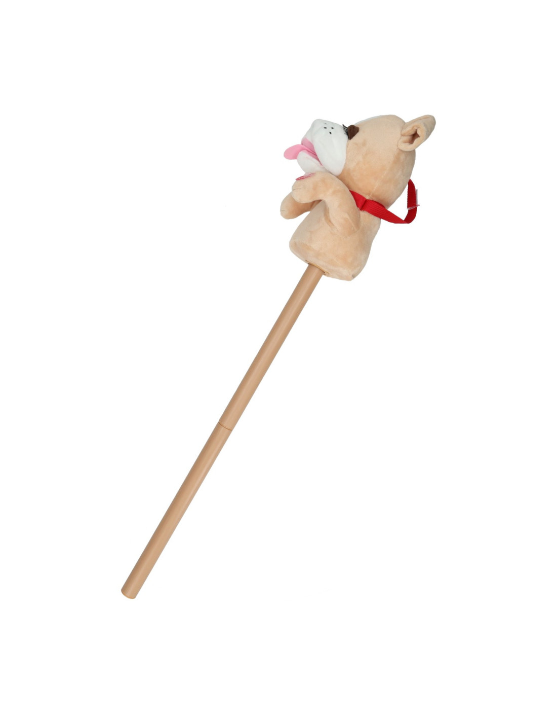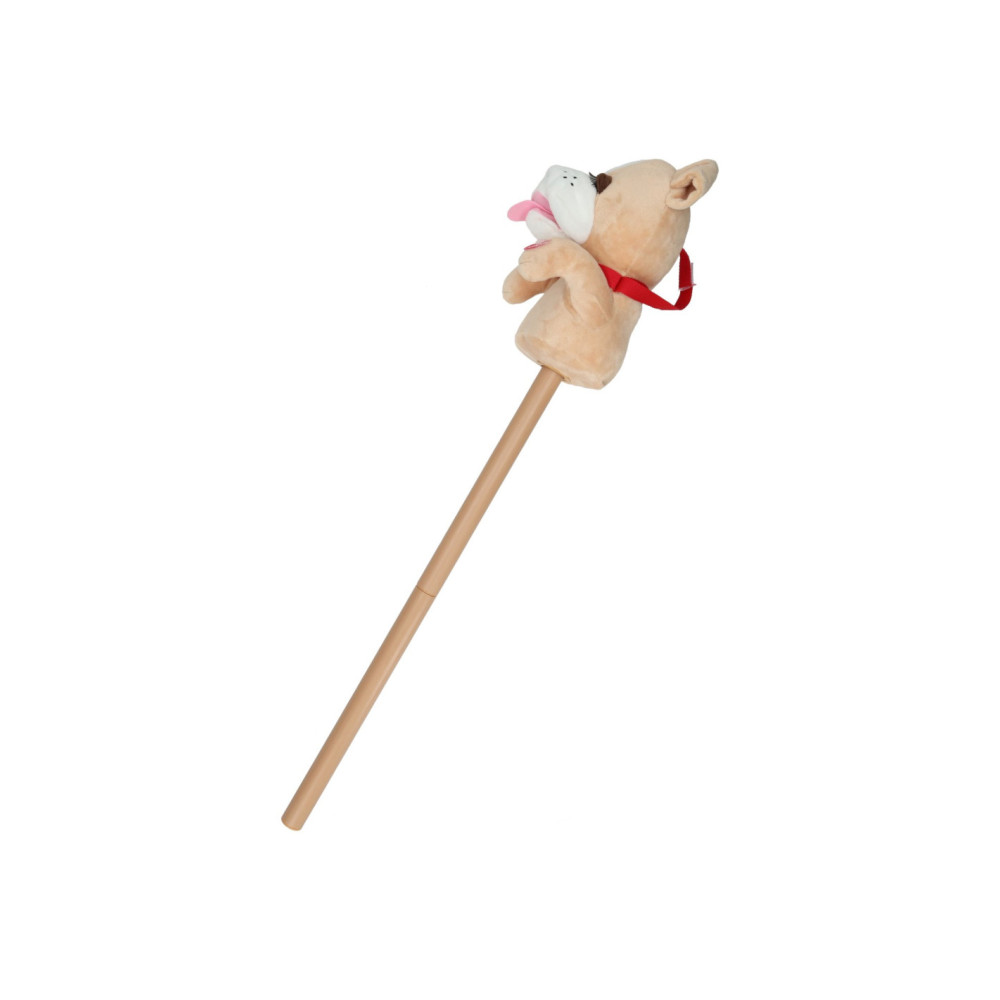 Stokpaard met honden hoofd. De hond heeft een bruine kleur en blauw ogen. Wanneer je in zijn poot drukt, blaft de hond. Het stokpaard is geschikt voor kinderen vanaf 3 jaar. De stok is ongeveer 80 cm lang en heeft een bruine kleur.