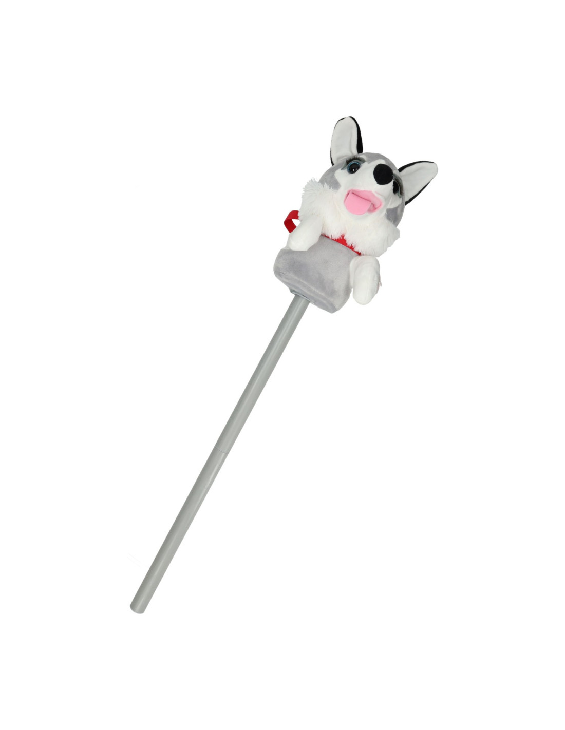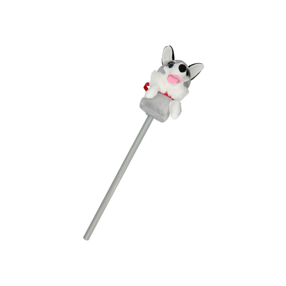 Stokpaard met een grijs hondenhoofd. In de poot van de hond zit geluid. Het stokpaard is geschikt voor kinderen vanaf 3 jaar. De stok is ongeveer 80 cm lang.