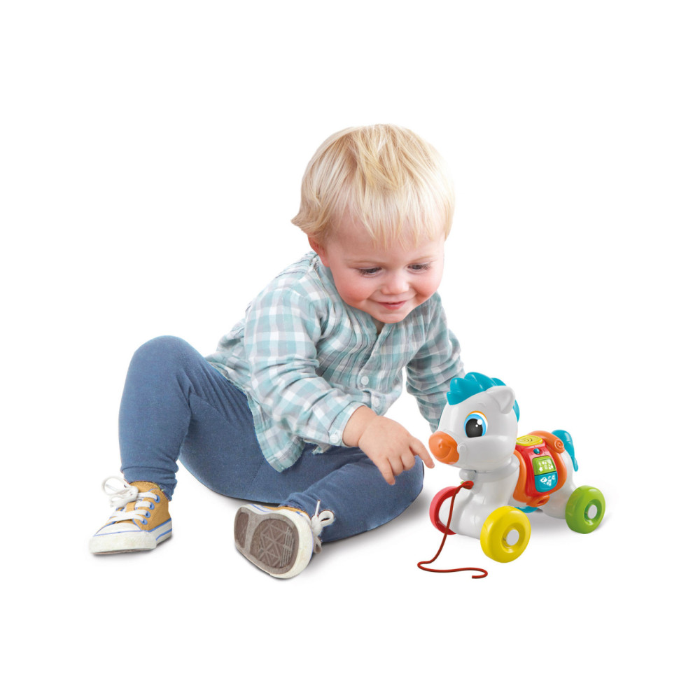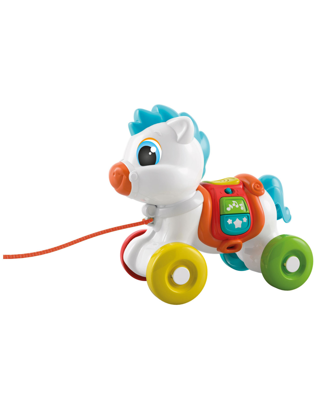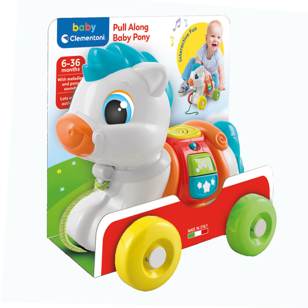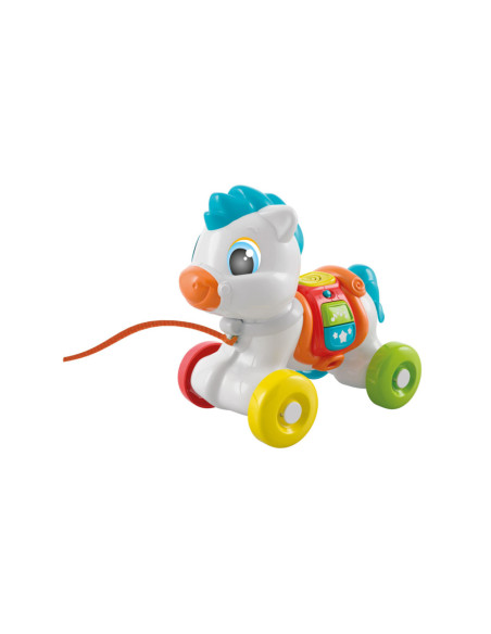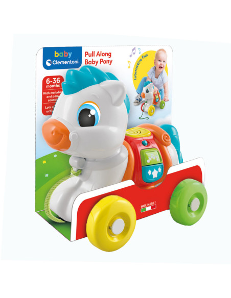 Een hele lieve sleepbare pony om altijd met je mee te nemen. Door het drukken op de toetsen van zijn zadel, komt de pony tot leven. Hij eet, hij lacht en vermaakt het kind dankzij de geluidseffecten. Dankzij de interactieve toetsen, de wielen en het touw, ondersteunt de pony de zintuiglijke en motorische ontwikkeling. Een iconisch personage van de Baby Clementoni lijn waar kinderen heel veel van houden. Made in Italy.