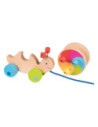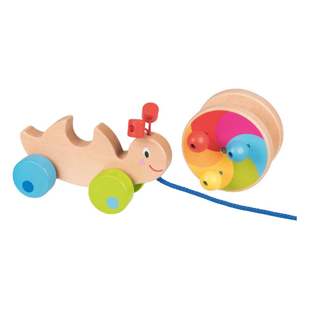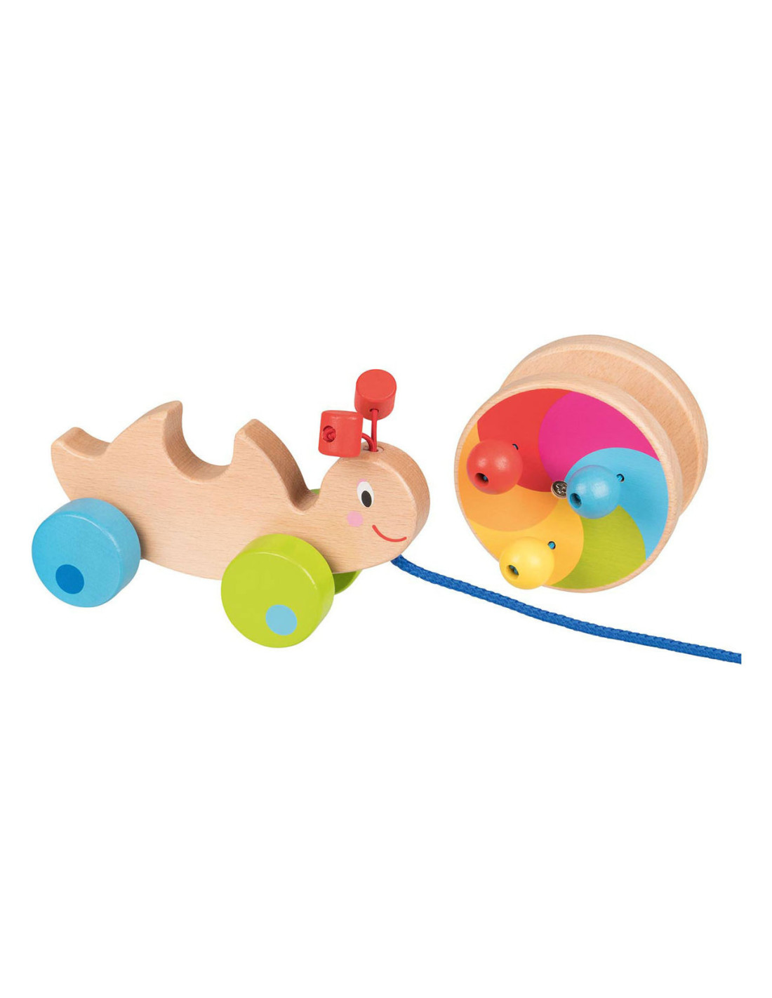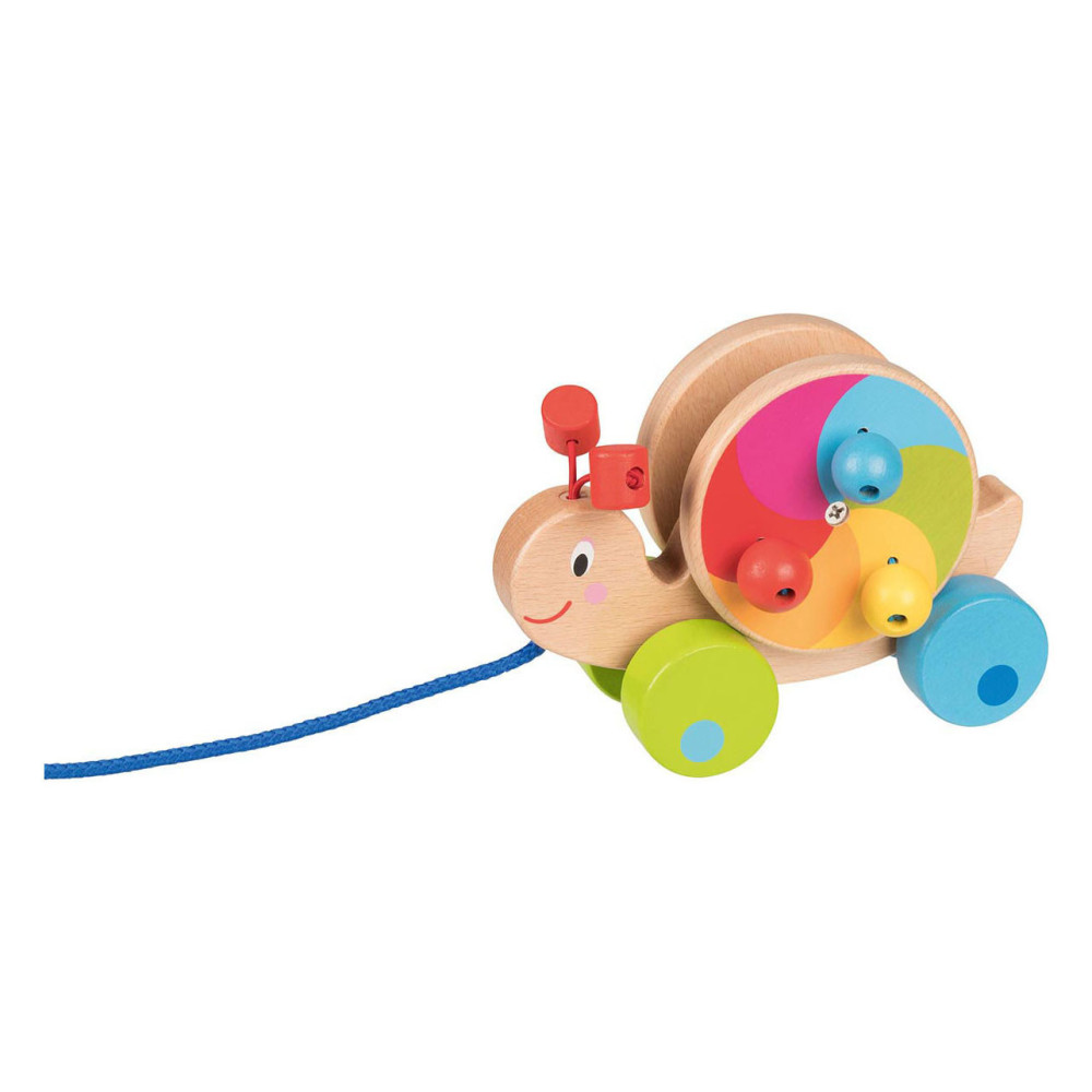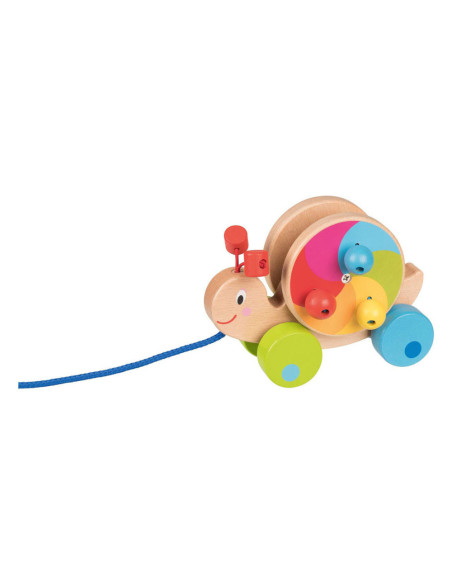 Een trekslak die aan de hoogste eisen voldoet. Gemaakt van massief beukenhout, met hoogwaardige afwerking en een zeer doordacht kleurontwerp dat een uitstekende visuele ondersteuning biedt voor de beweging van roterende schijven. De houten kralen produceren een aangenaam, zacht geluid. Een absoluut betrouwbare metgezel tijdens de eerste uitstapjes van je kind.