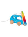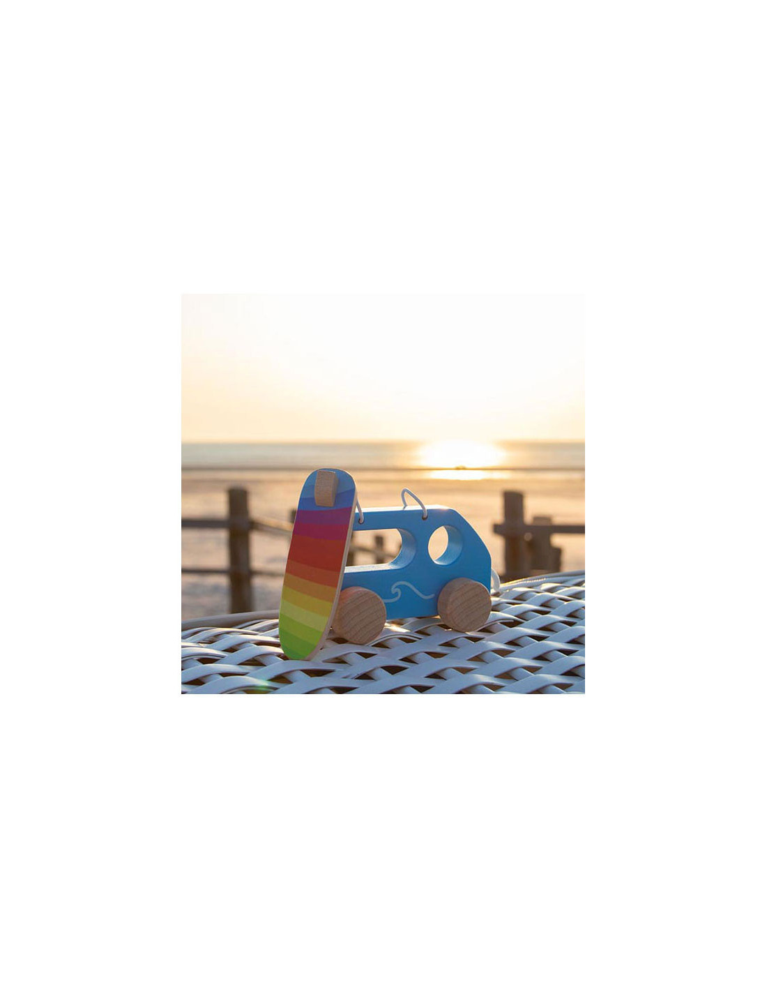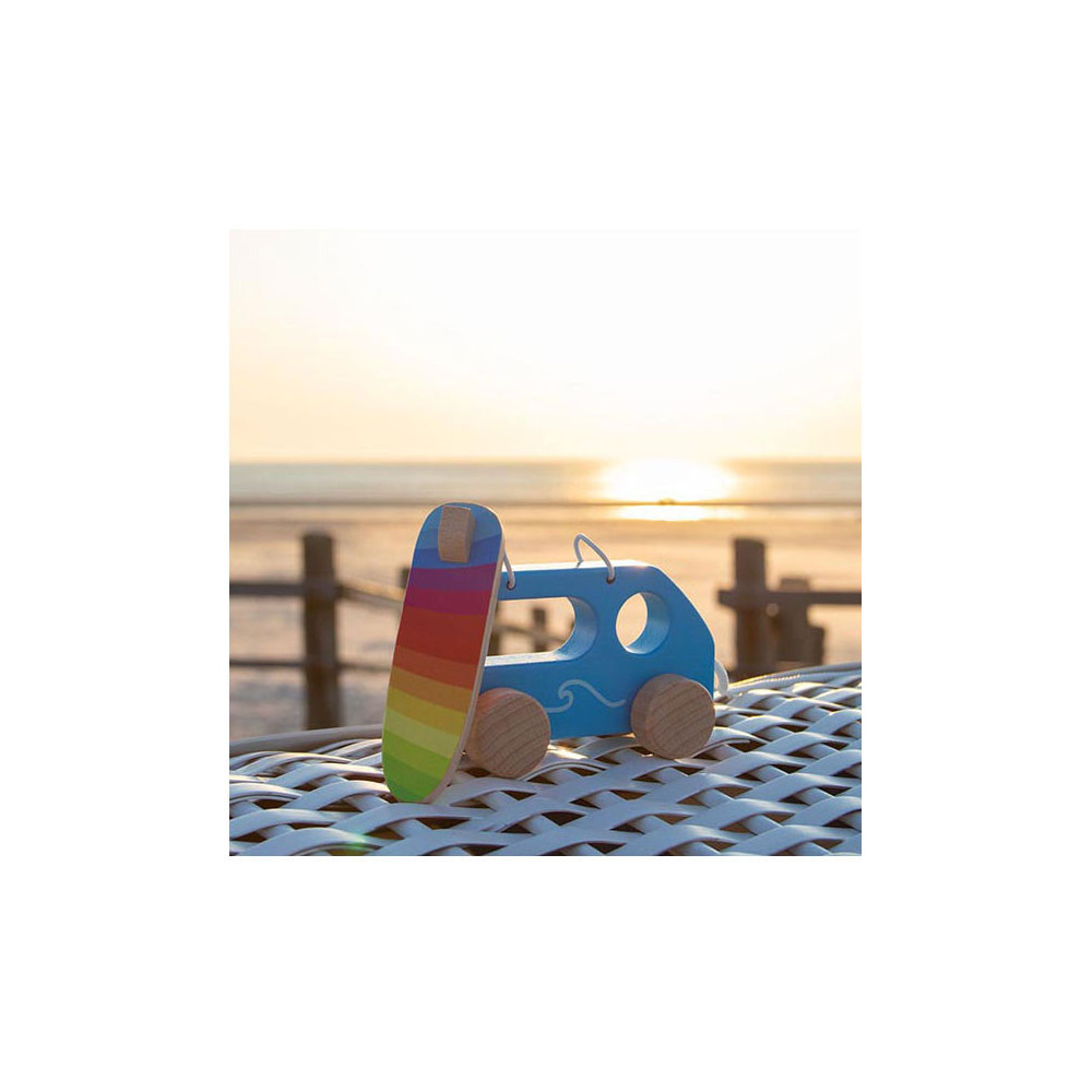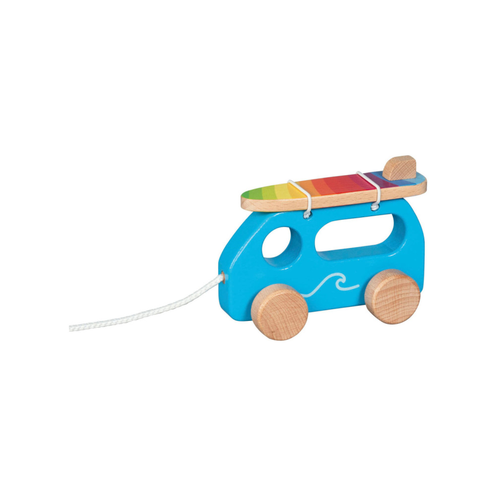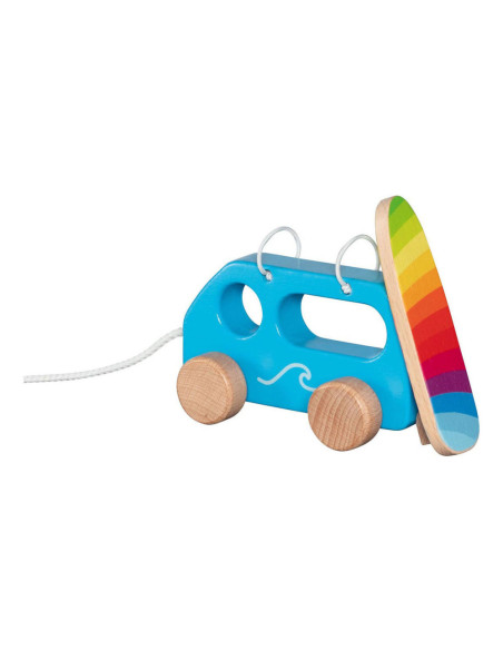 Het is tijd om naar het strand te gaan! Dit is het eerste dat opkomt bij het zien van dit prachtige houten trekvoertuig. Met het touwtje trek je het surferbusje over de grond met je mee. De kleurrijke, afneembare surfplank bovenop houten auto maakt het geheel helemaal af. Het maakt leren lopen nog leuker en leuker stimuleert beweging.