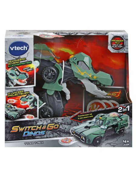 Tijd voor actie! Transformeer Tyler de T-Rex eenvoudig van dino naar een superstoere auto! Lanceer de bijgesloten projectielen uit zijn bek en ontdek meer dan 30 stoere geluiden en zinnen.