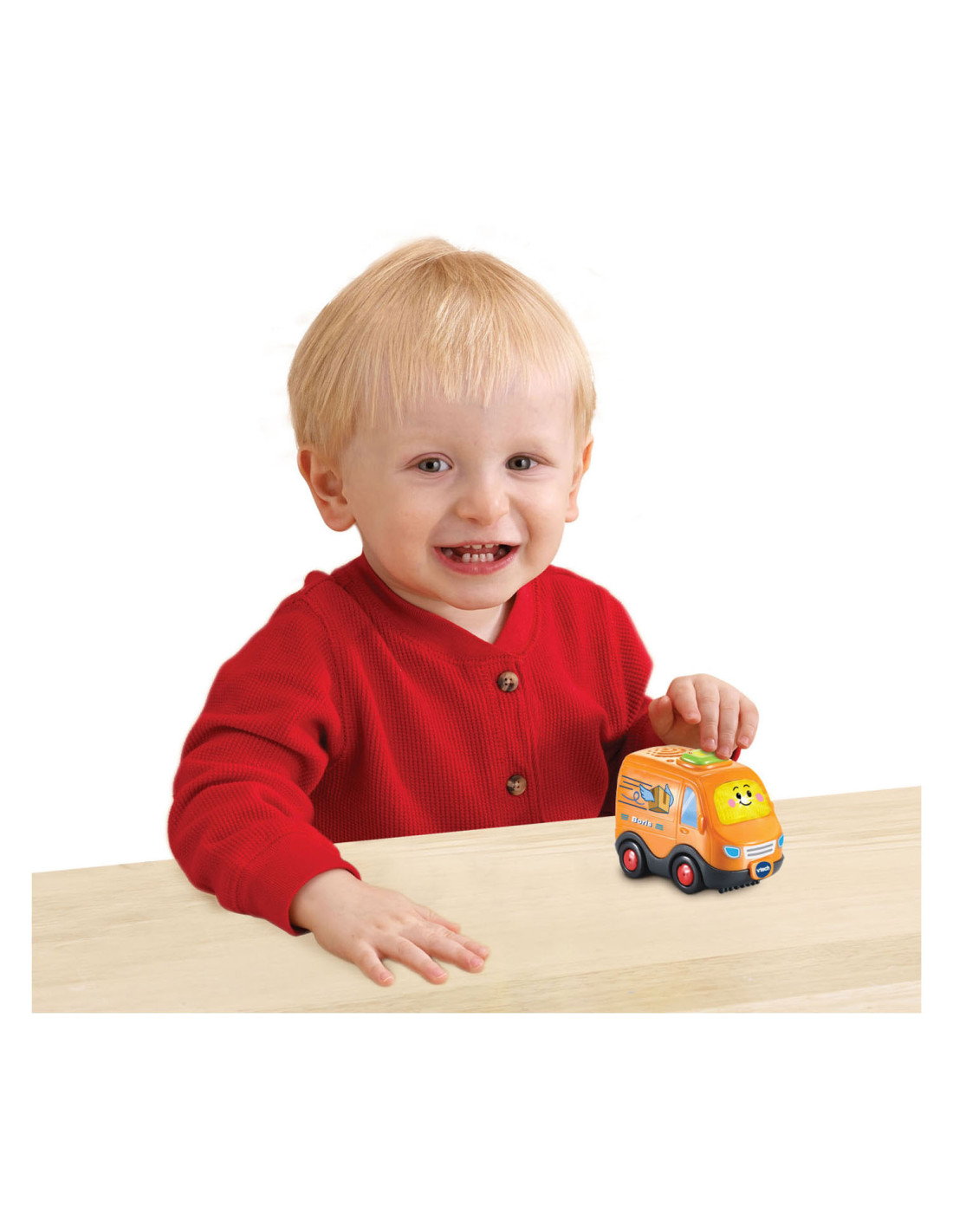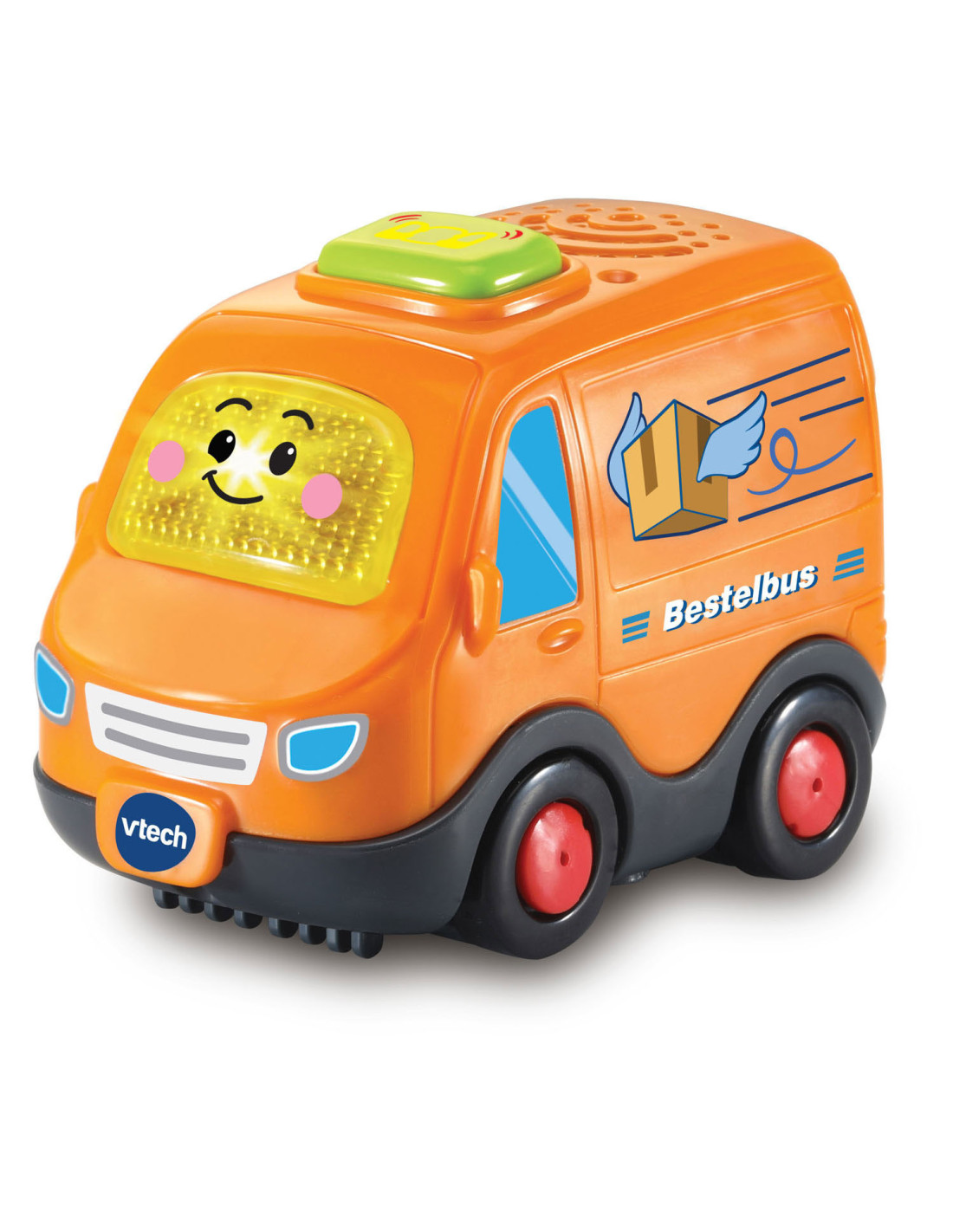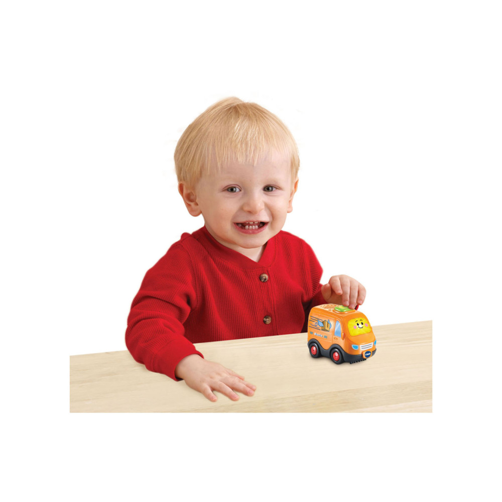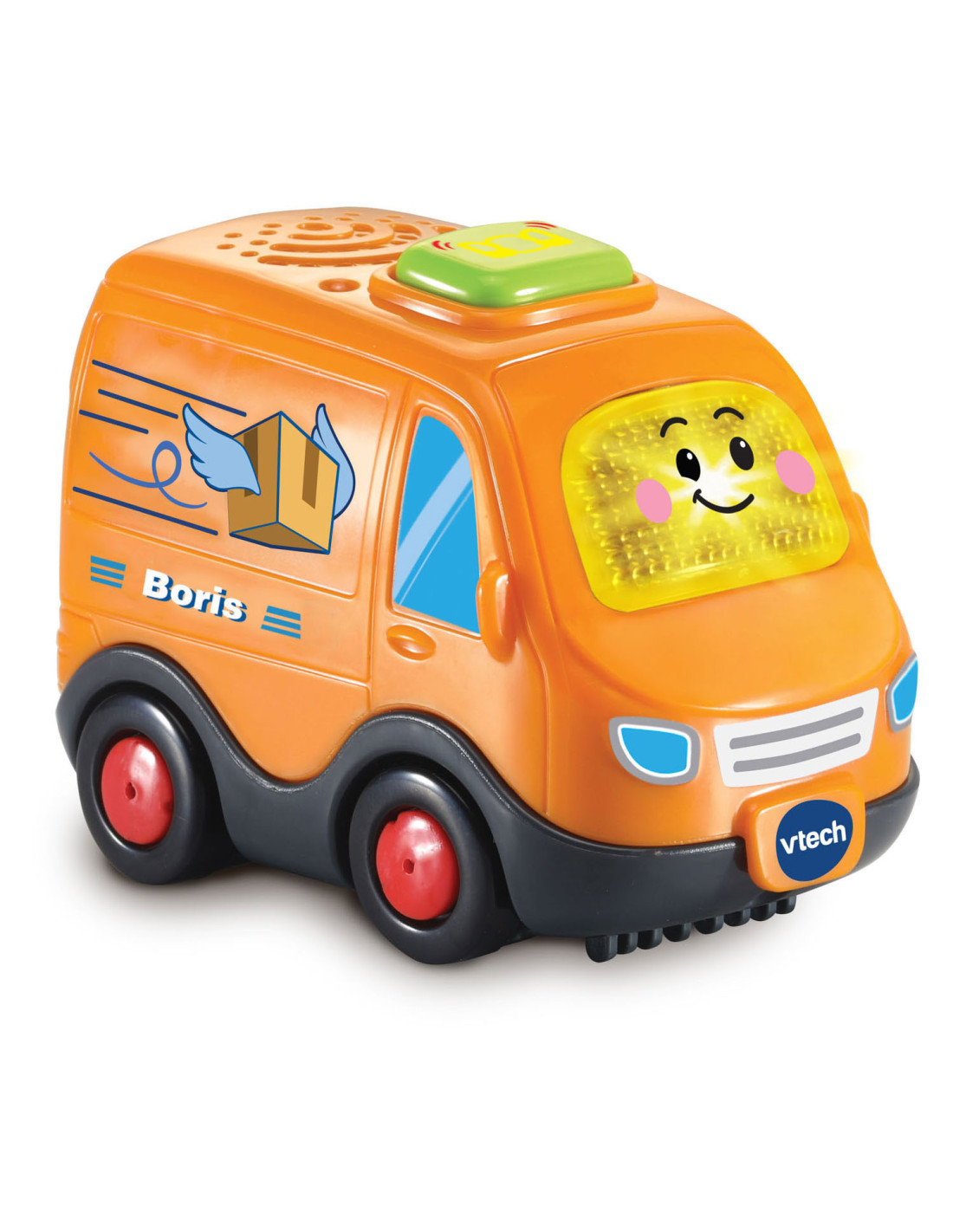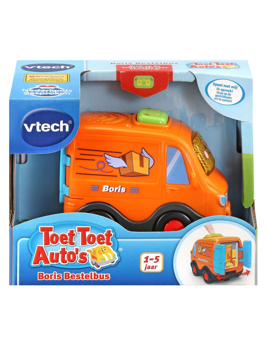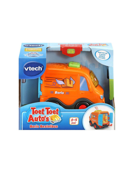 Verzamel alle voertuigen uit de VTech Toet Toet Auto's collectie! Druk op de knipperende gezicht-toets om geluidseffecten, vrolijke zinnetjes en gezongen liedjes te horen. Druk op de actie-toets om de deuren te openen en grappige geluidjes te horen. Kom en bezorg de bestellingen met Boris Bestelbus!