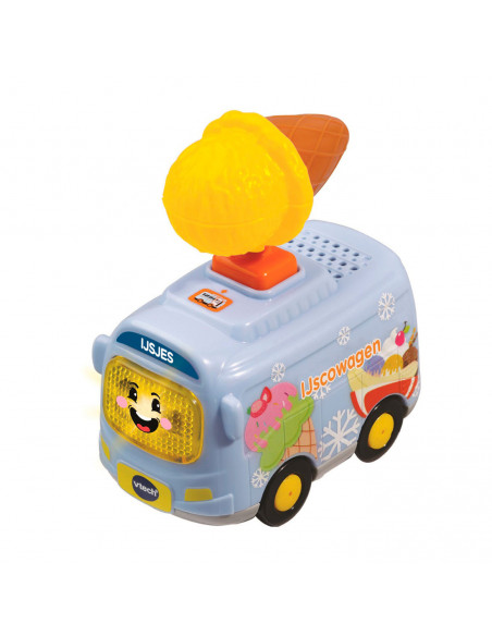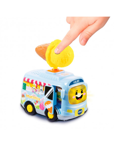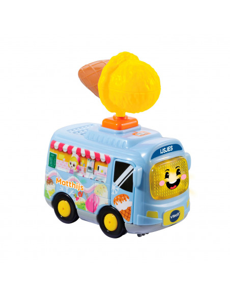 Druk op de knipperende gezicht-toets om geluidseffecten, vrolijke zinnetjes en gezongen liedjes te horen. Druk op de actie-toets om de deur te openen en grappige geluidjes te horen! Kom mee en ga ijs verkopen met Matthijs IJscowagen! Werkt op 2 AAA batterijen (inbegrepen).