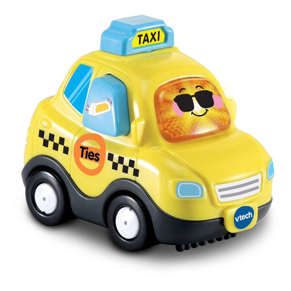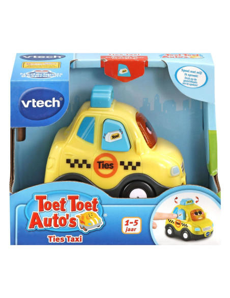 Verzamel alle voertuigen uit de Toet Toet Auto's collectie! Druk op de knipperende gezicht-toets om geluidseffecten, vrolijke zinnetjes en gezongen liedjes te horen. Druk op de actie-toets om het taxibord te bewegen en grappige geluidjes te horen. Kom en ga ritjes maken met Ties Taxi!