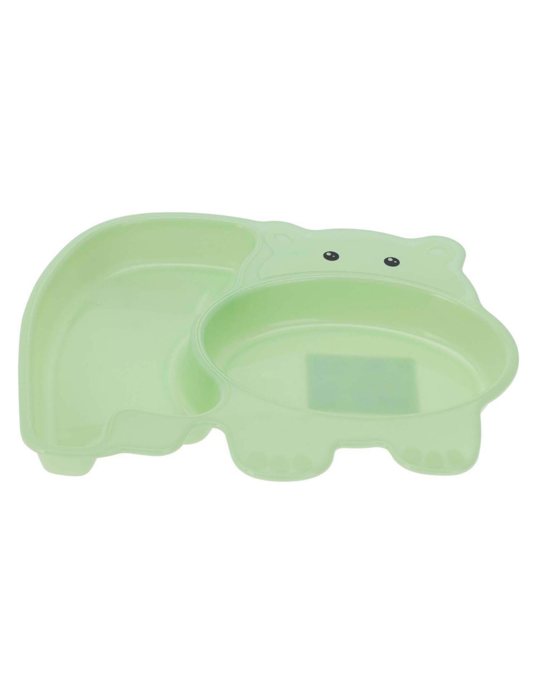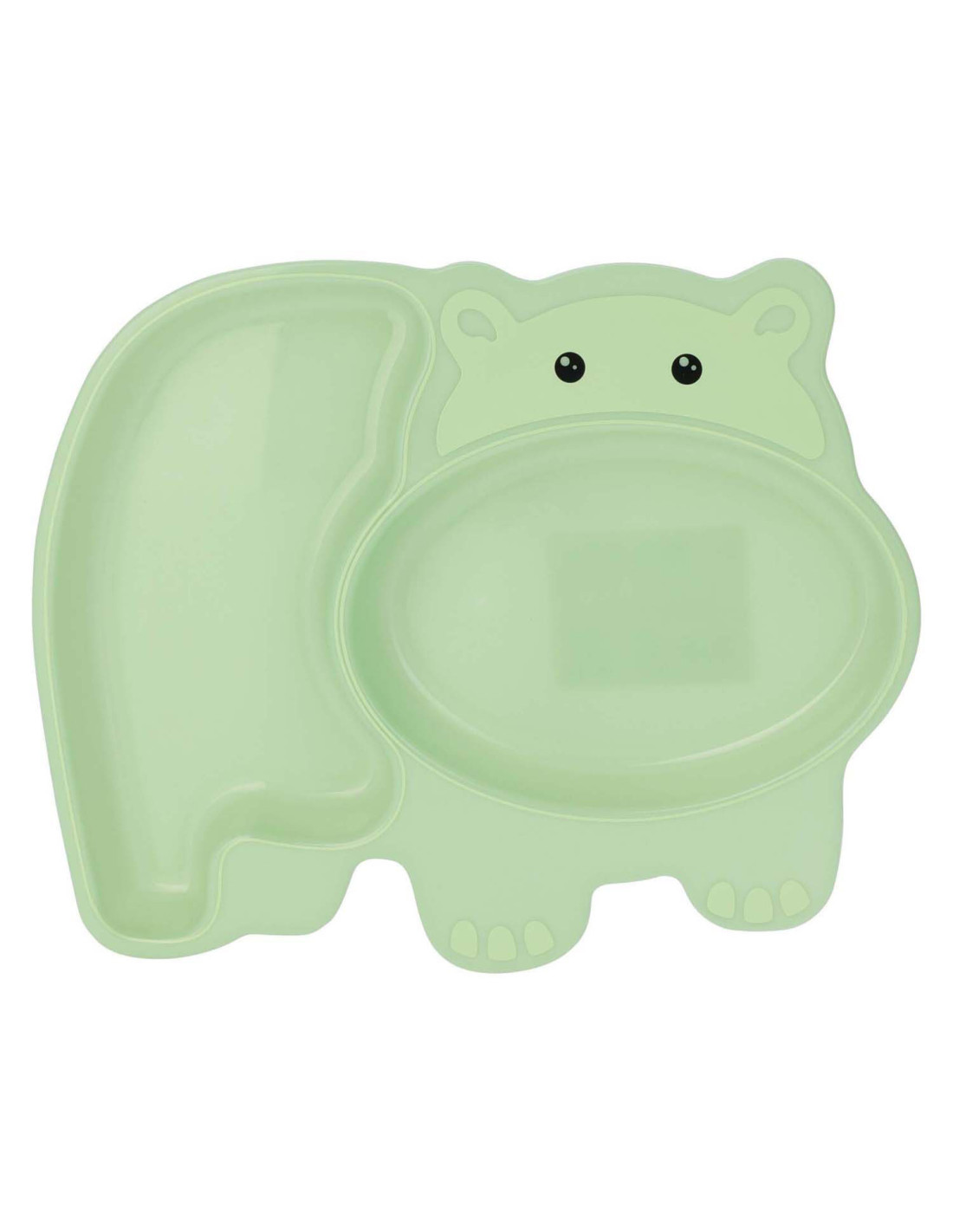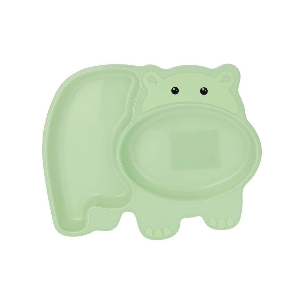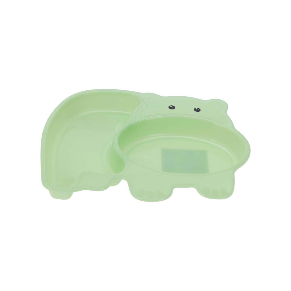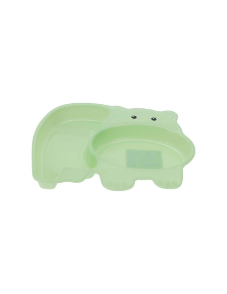 Babybord in nijlpaardvorm met opstaande randen. Afmetingen: 24 x 20,5 centimeter.
