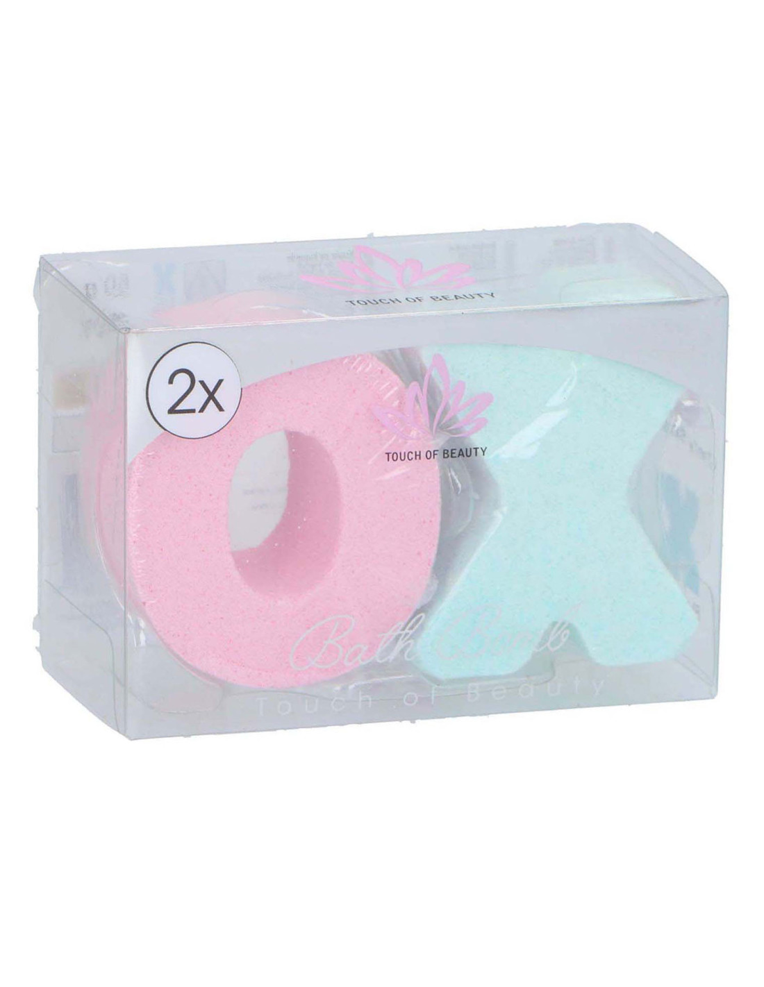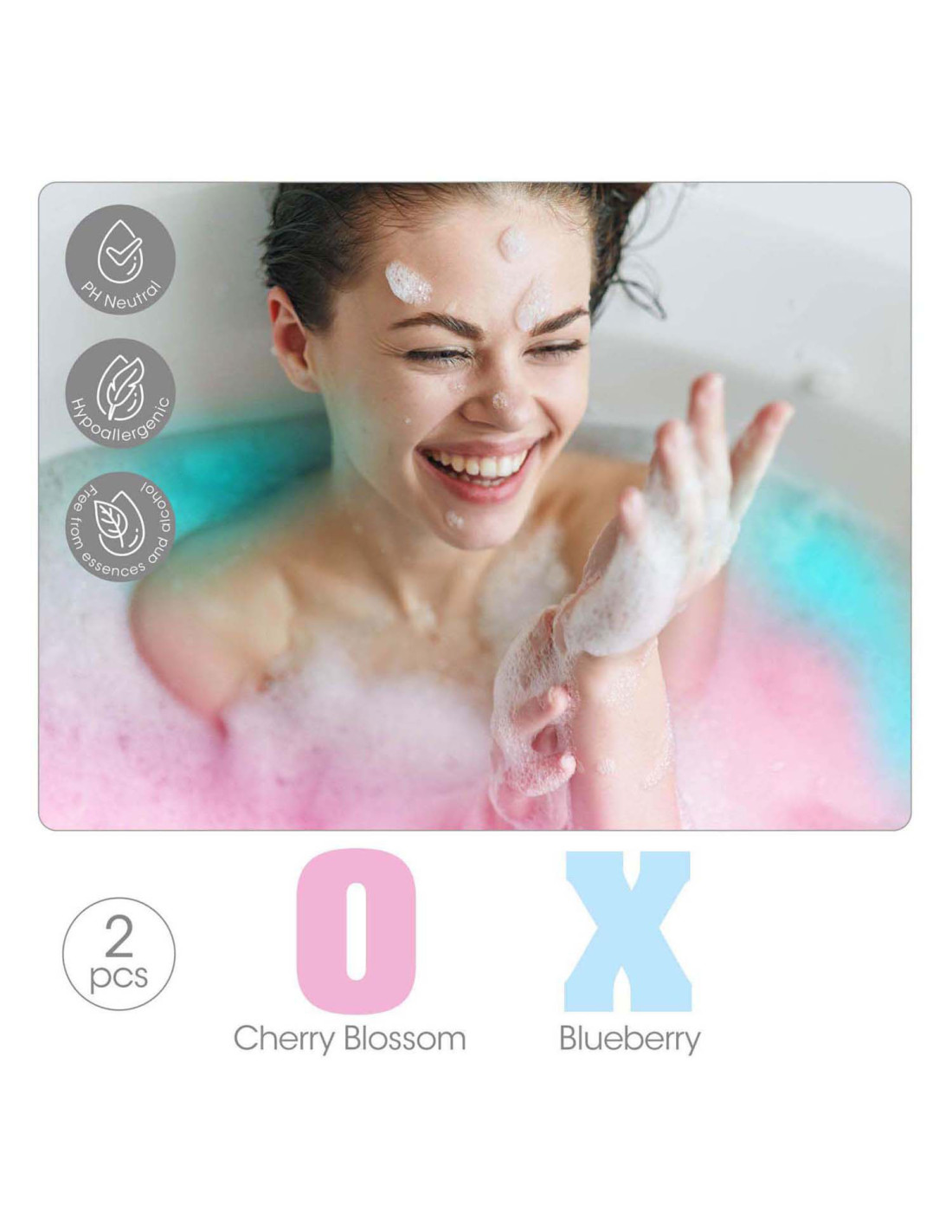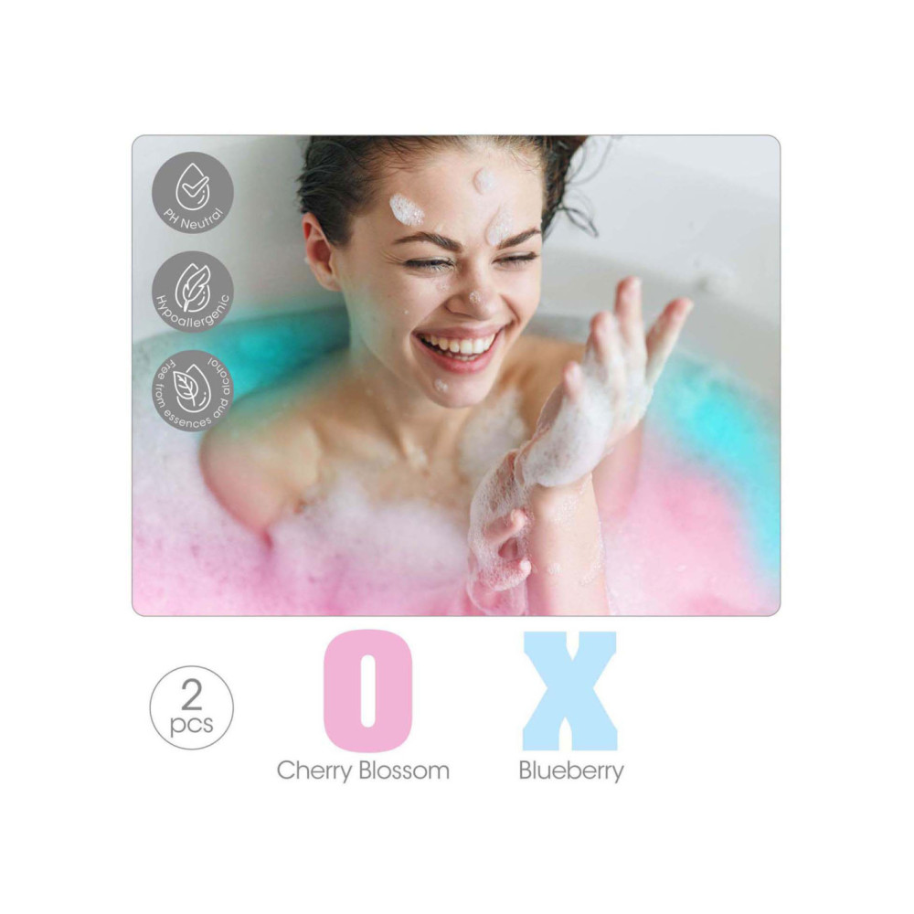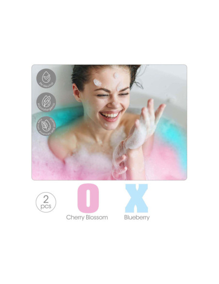 Een set van twee badproducten in een doorzichtige verpakking. De producten hebben zachte tinten roze en groen, ideaal voor een verfrissende badervaring.