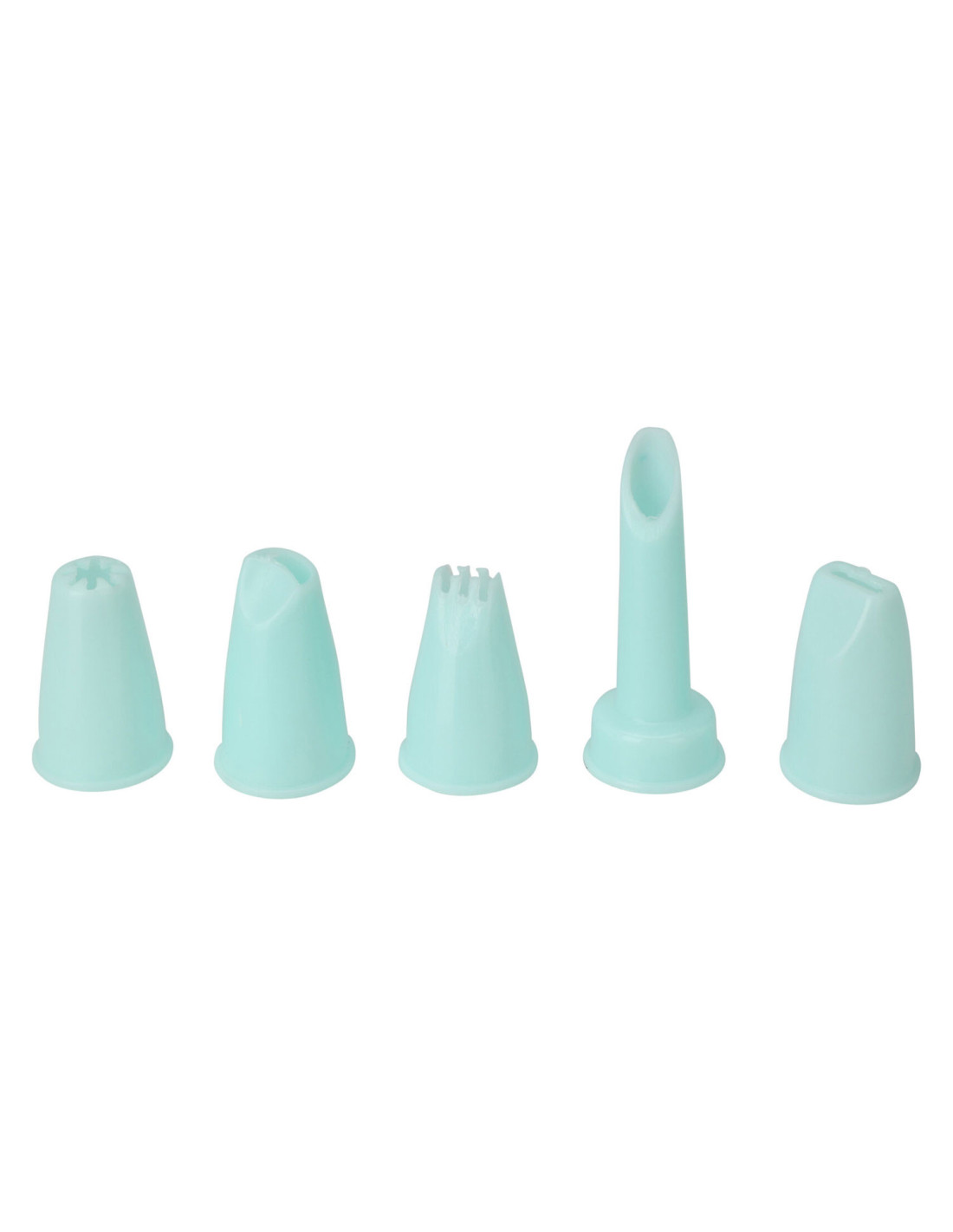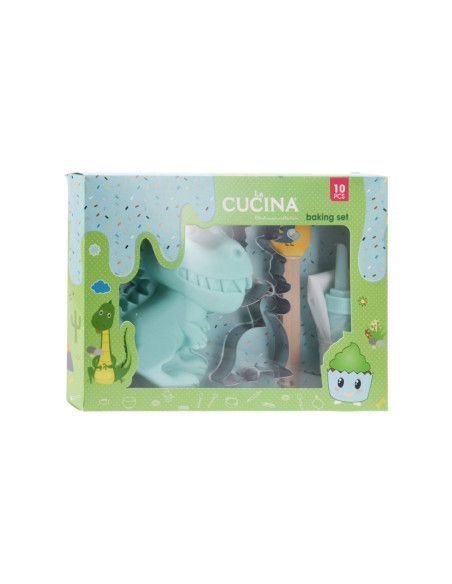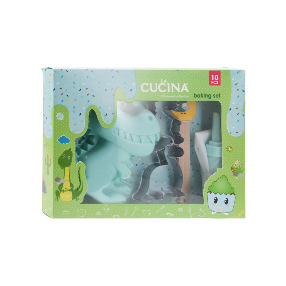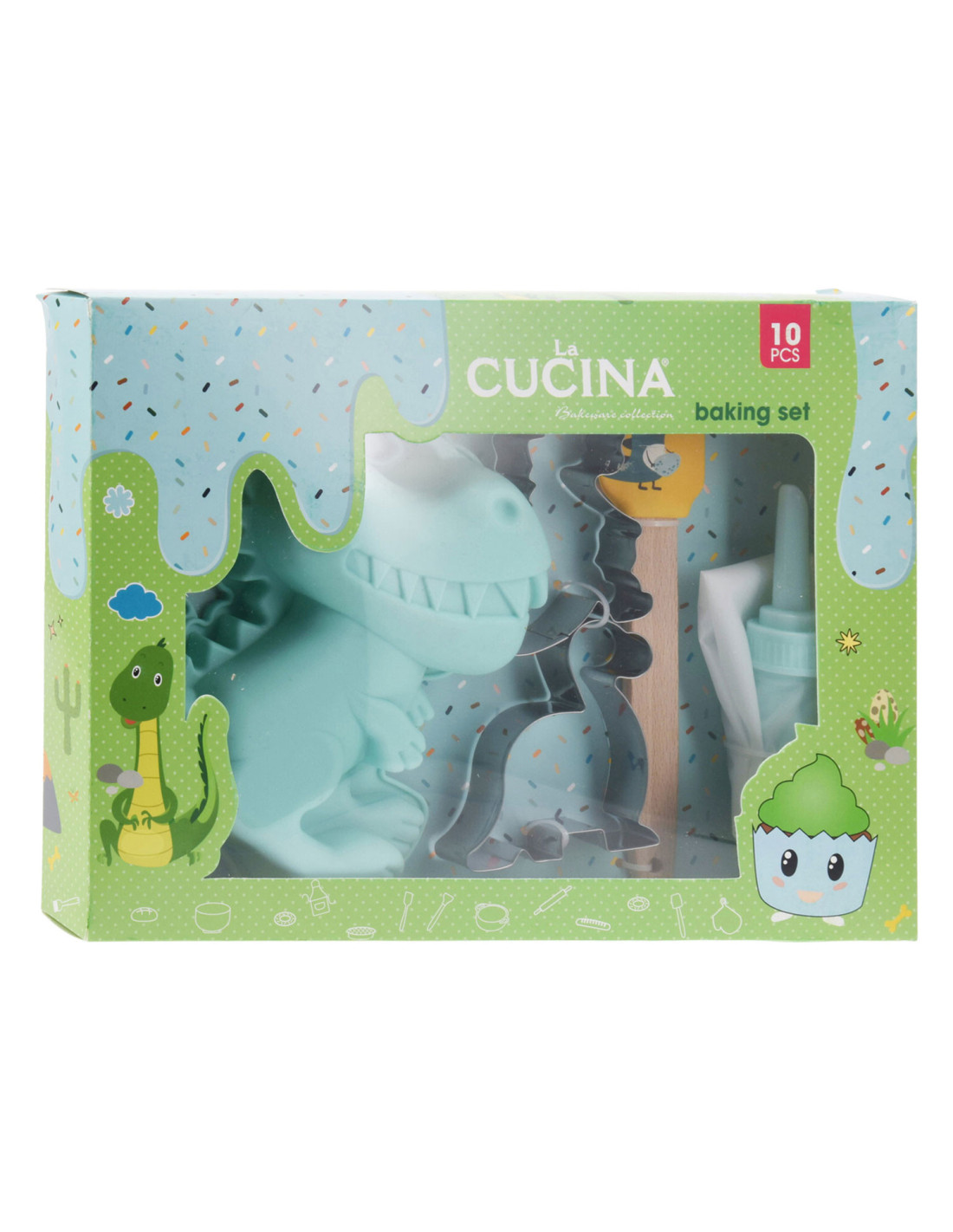 10-delige bakset in dinothema. Inhoud: spuitzak met 5 opzetstukken, cakevorm, spatel en 2 koekjesvormen. Geschikt vanaf 3 jaar.