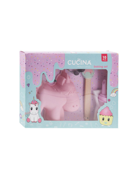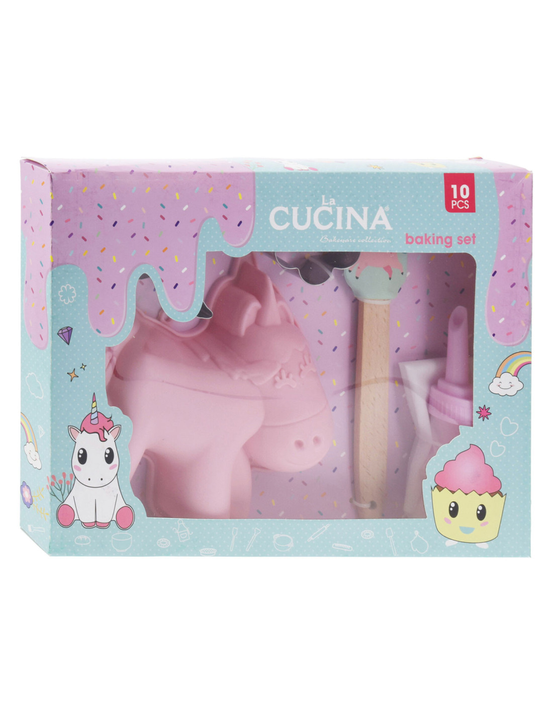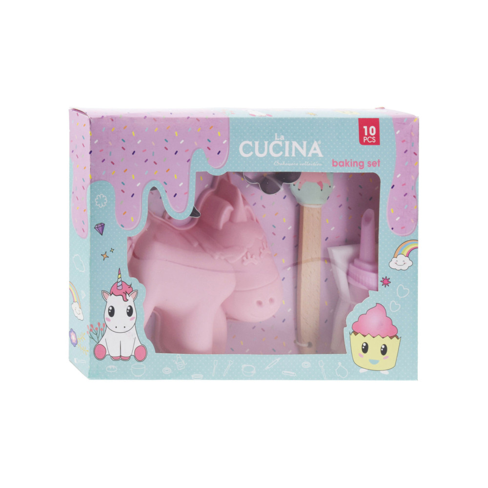 10-delige unicorn bakset met siliconen cakevorm, 2 koekjesvormen, spuitzak en 5 opzetstukken. Geschikt vanaf 3 jaar.