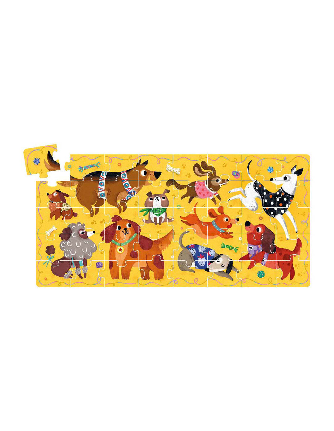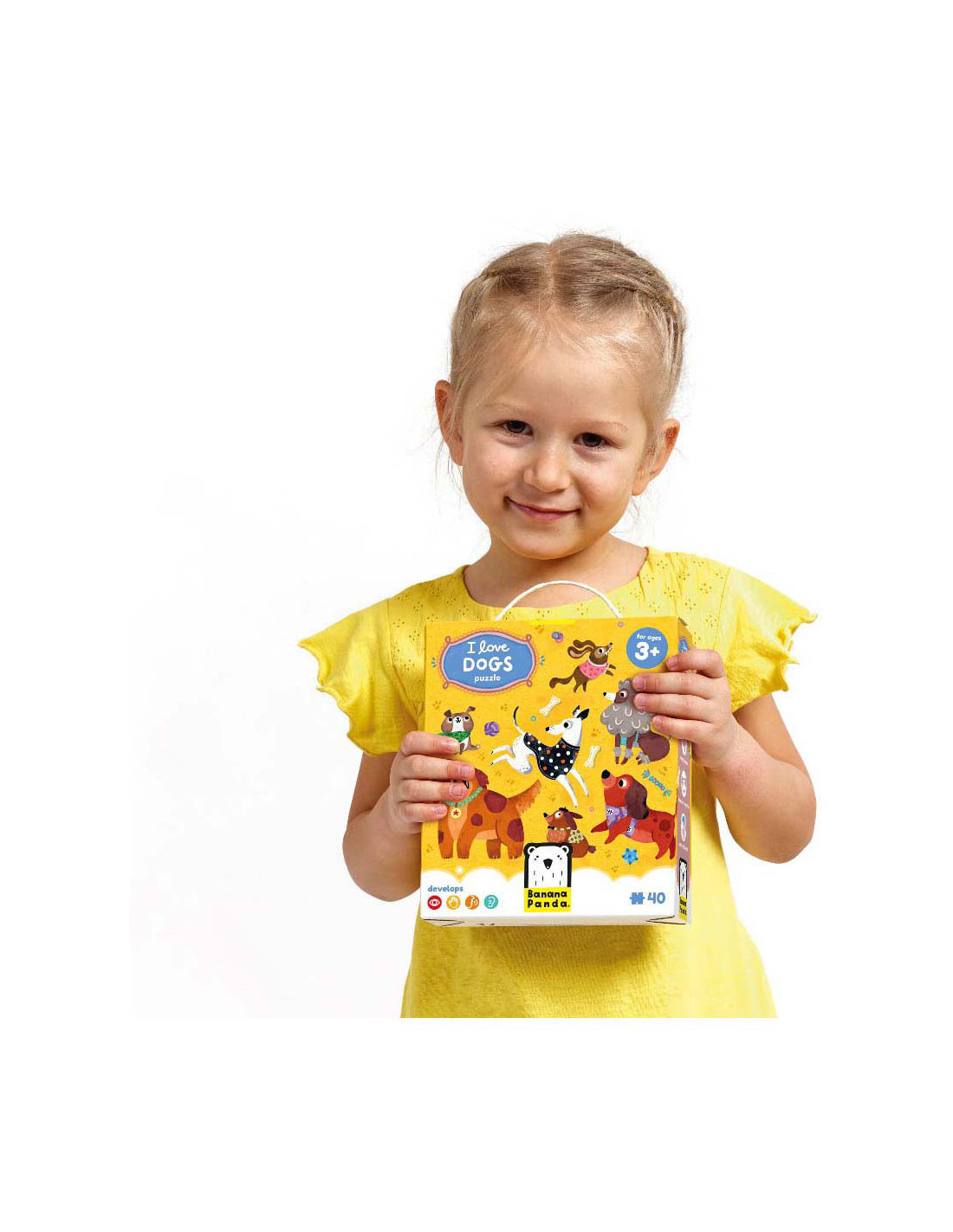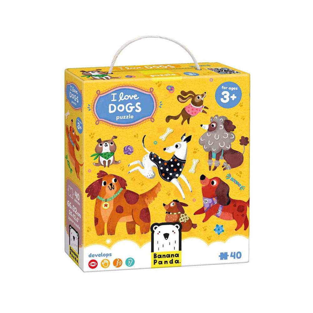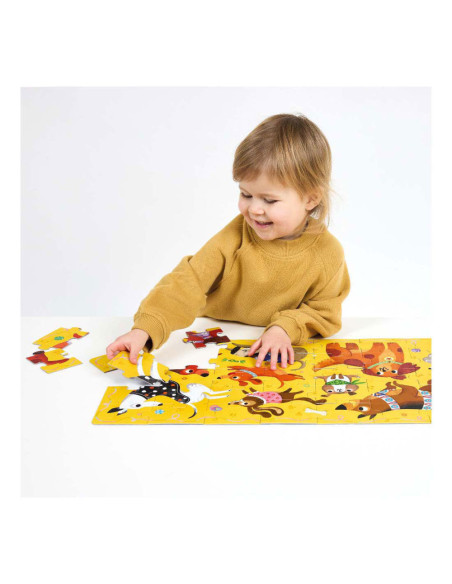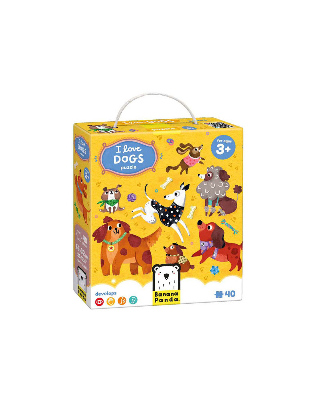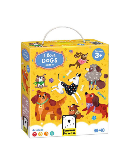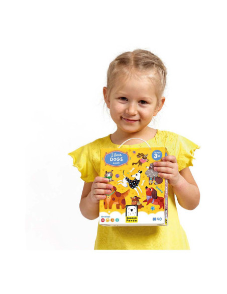 Woef, woef, laten we met spelen, puppy's! 10 vrolijke, vriendelijke honden en puppy's nodigen je uit voor een leuk avontuur dat je observatievermogen, fijne motoriek en verbeelding zal verbeteren. Deze grote puzzels bestaan uit 40 stukjes. Ze zijn perfect als eerste uitdagende puzzel voor steeds bekwamere puzzelaars. Een must-have in de kamer van jonge hondenliefhebbers!