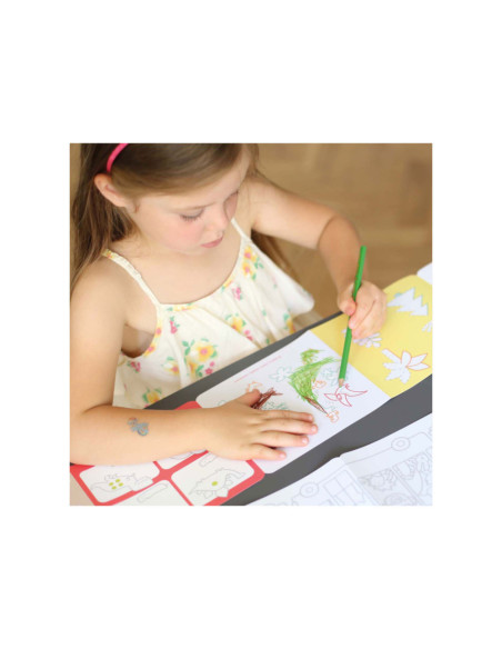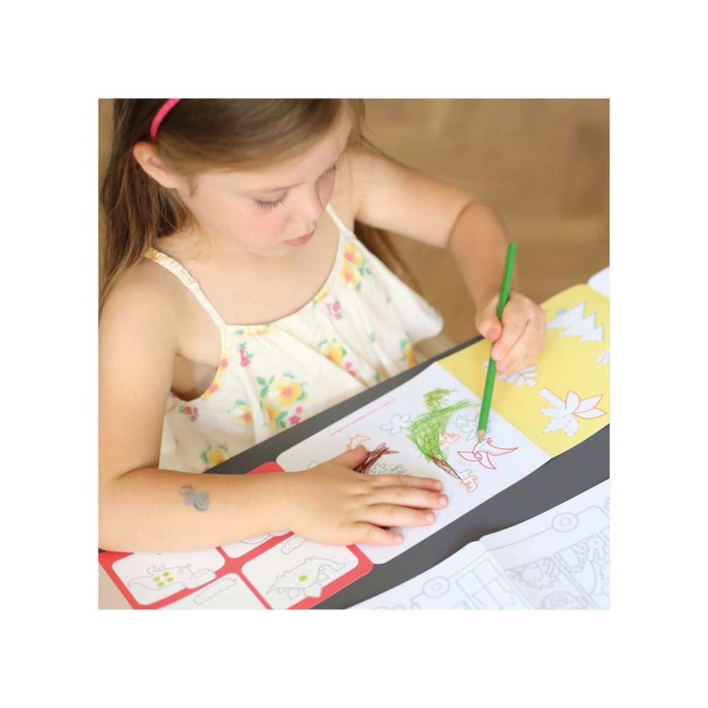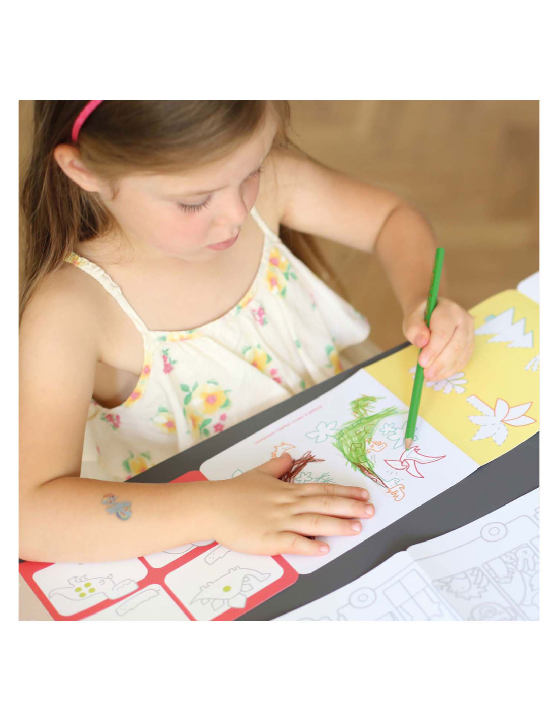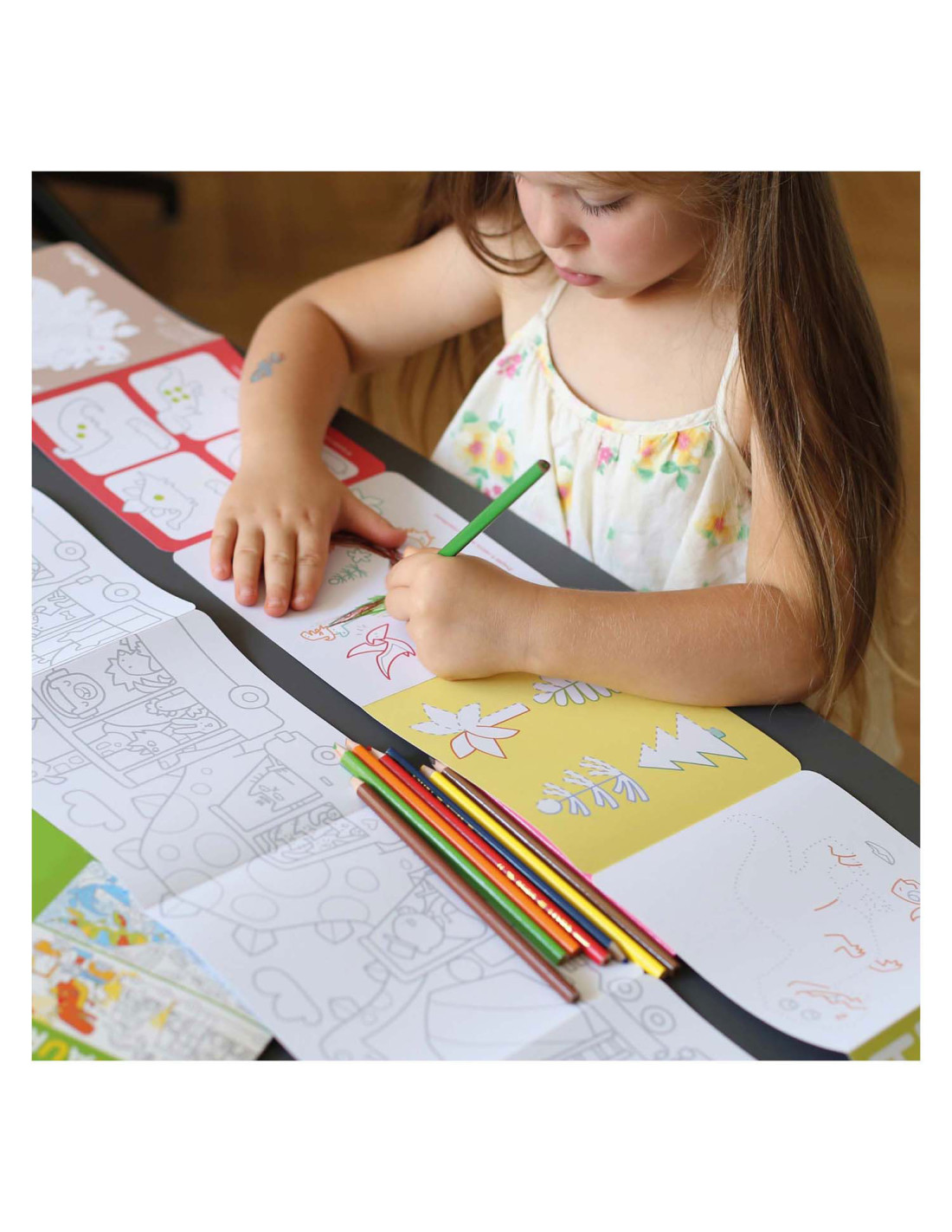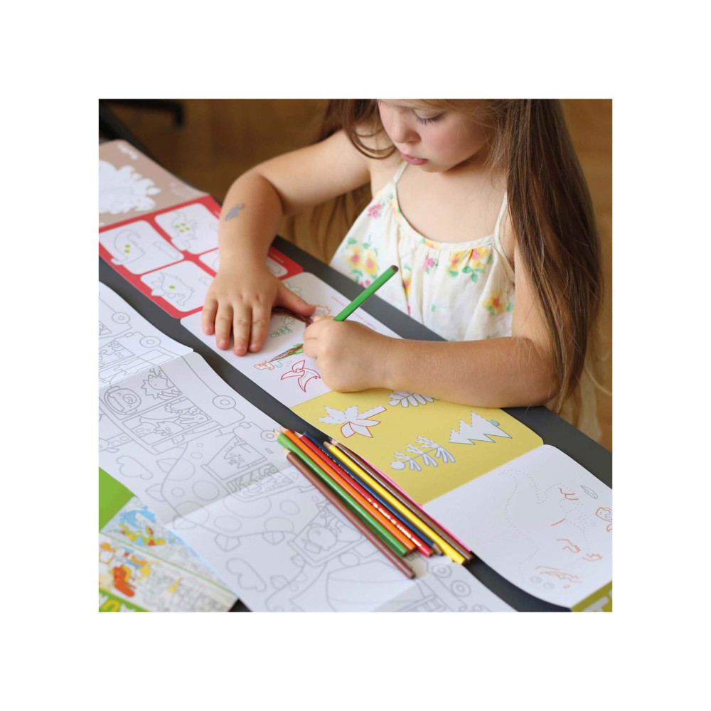 Deze creatieve set bevat 2 lange (95 cm!) accordeonboeken met 2 panoramafoto's om in te kleuren, plus talloze creatieve en leerzame oefeningen.