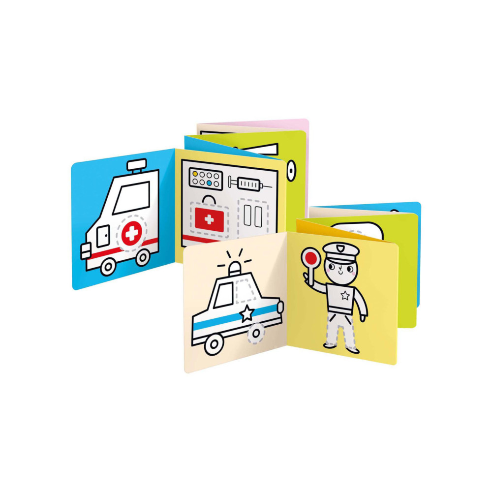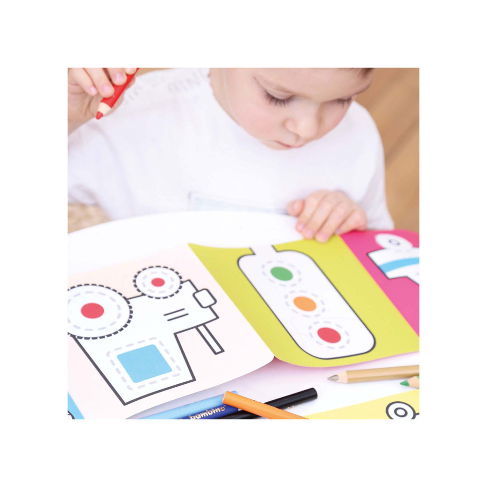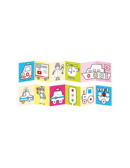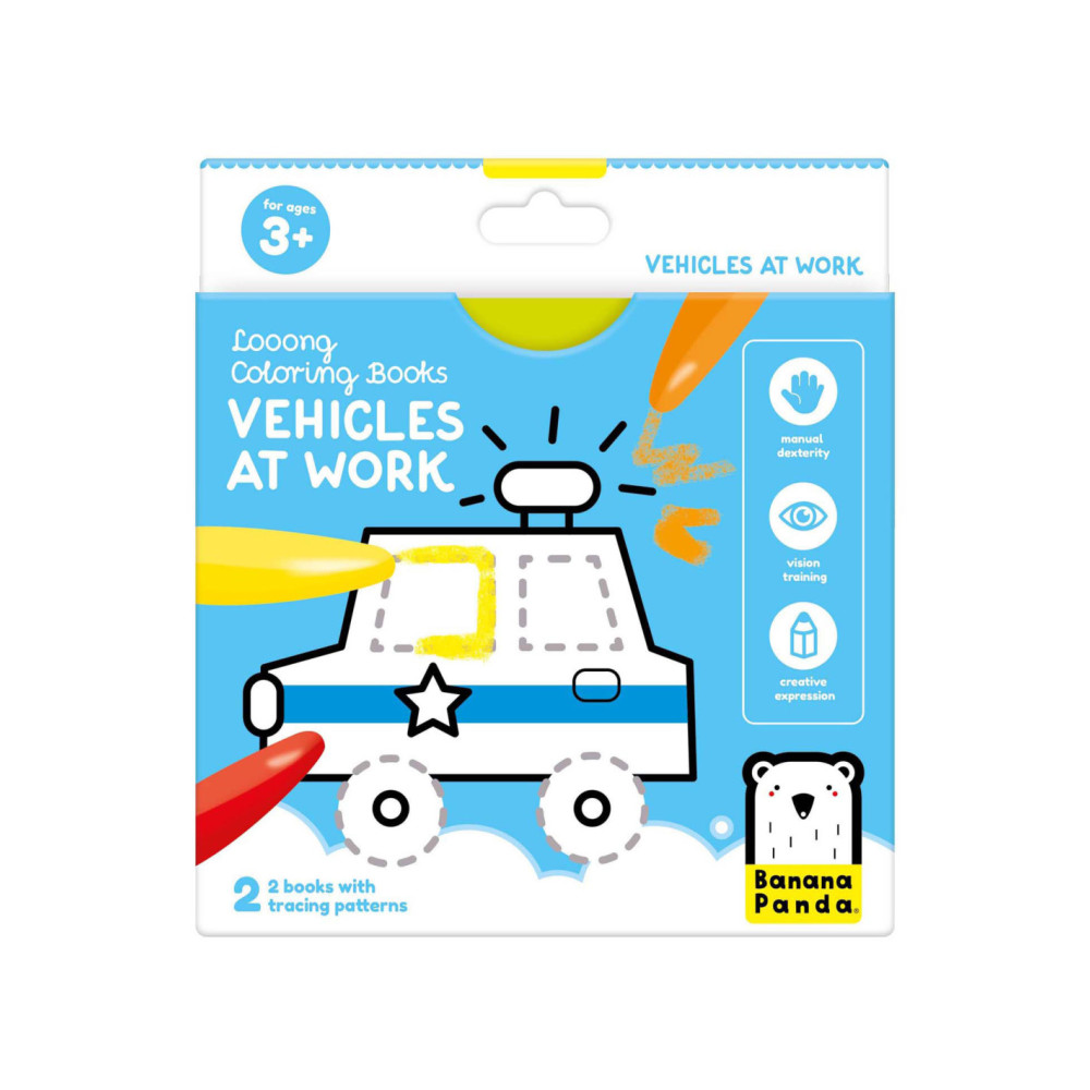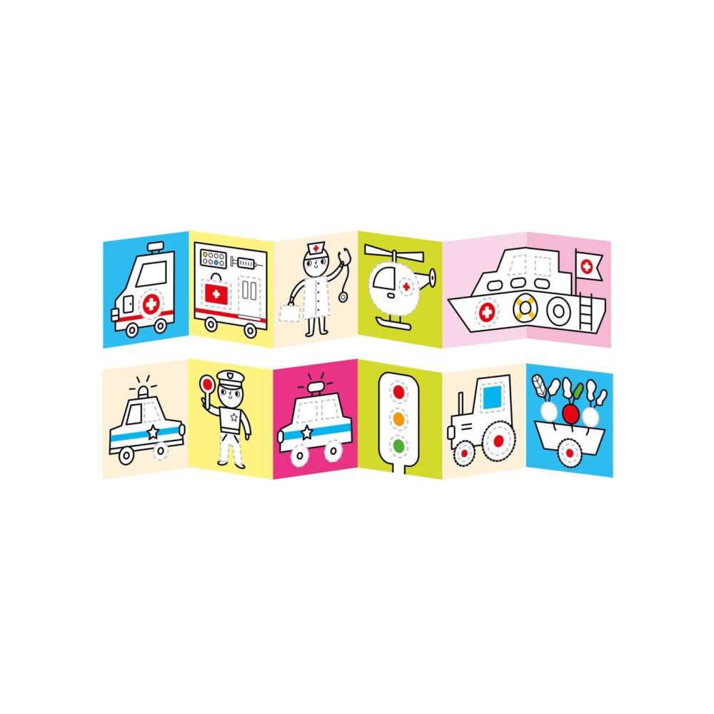 Welkom in de wereld van voertuigen op de weg. Spring met ons in actie en trek de lijnen over! Deze creatieve set bevat 2 lange (95 cm!) accordeonboeken met 23 illustraties vol leuke details, die kinderen zullen aanmoedigen om hun kleurpotloden op te pakken en hun eerste tekenpogingen te wagen.