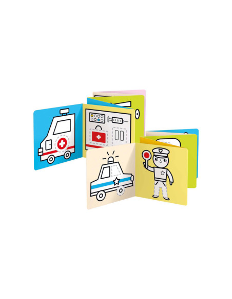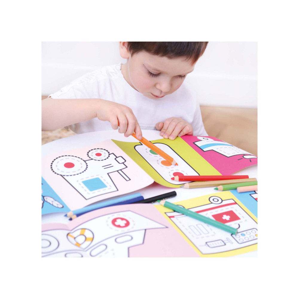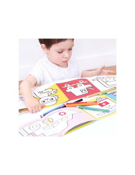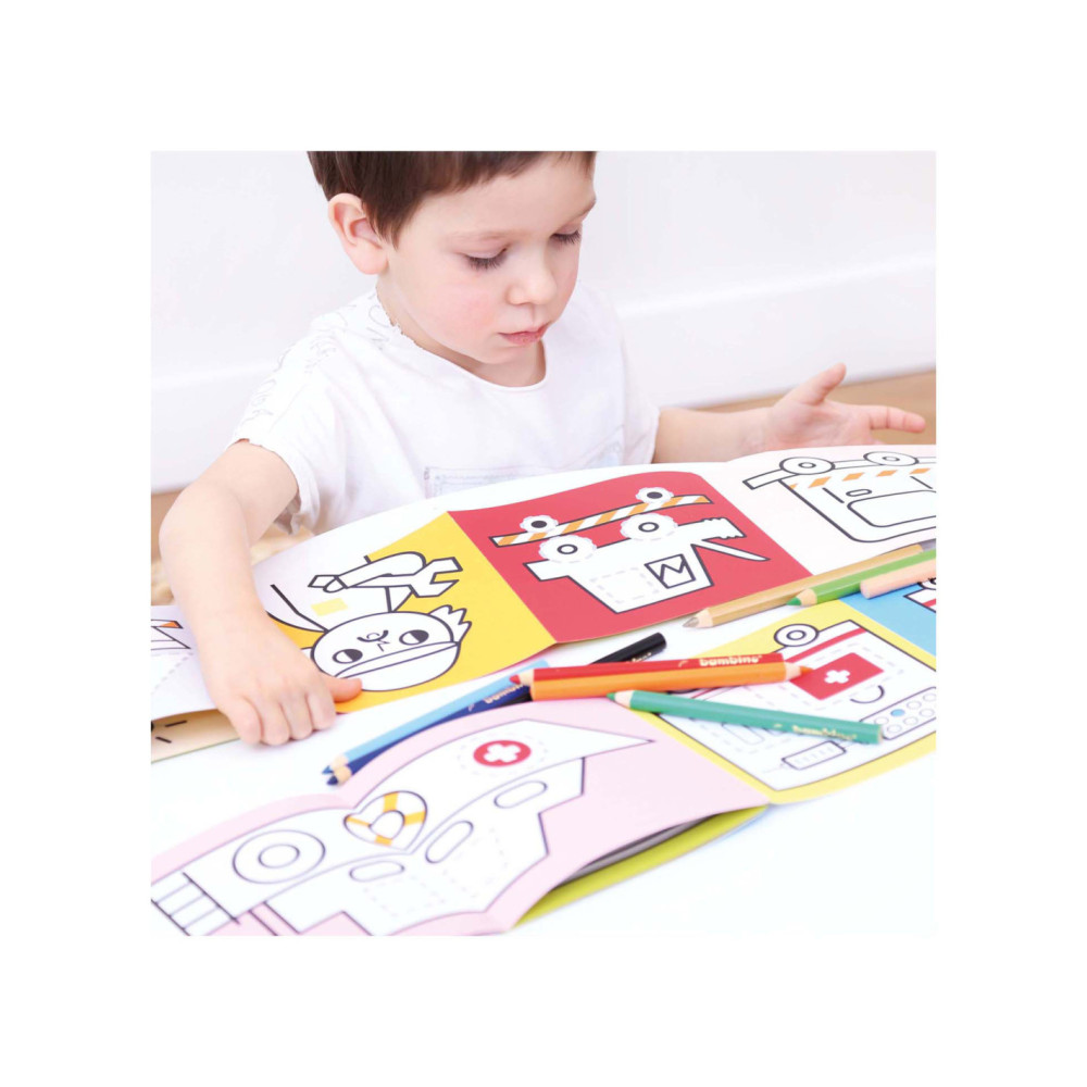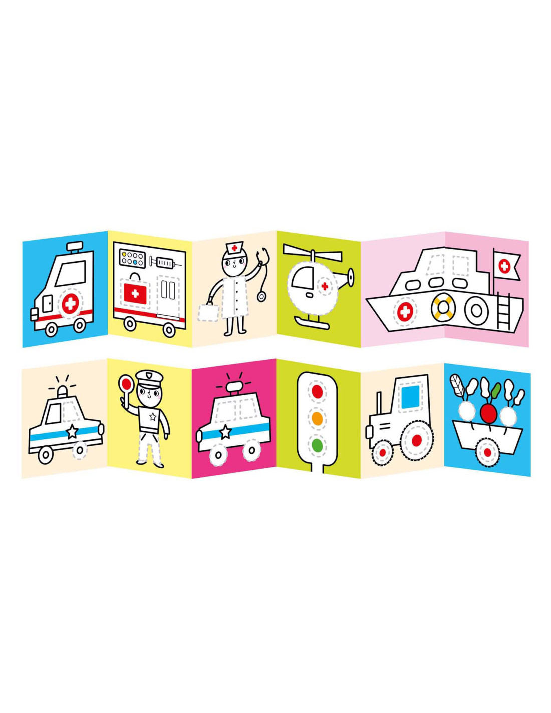 Welkom in de wereld van voertuigen op de weg. Spring met ons in actie en trek de lijnen over! Deze creatieve set bevat 2 lange (95 cm!) accordeonboeken met 23 illustraties vol leuke details, die kinderen zullen aanmoedigen om hun kleurpotloden op te pakken en hun eerste tekenpogingen te wagen.
