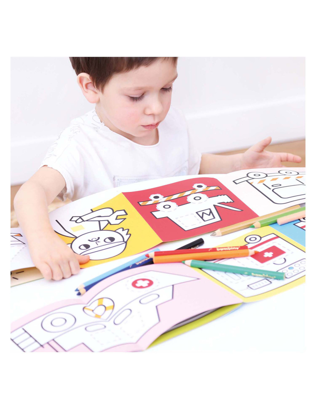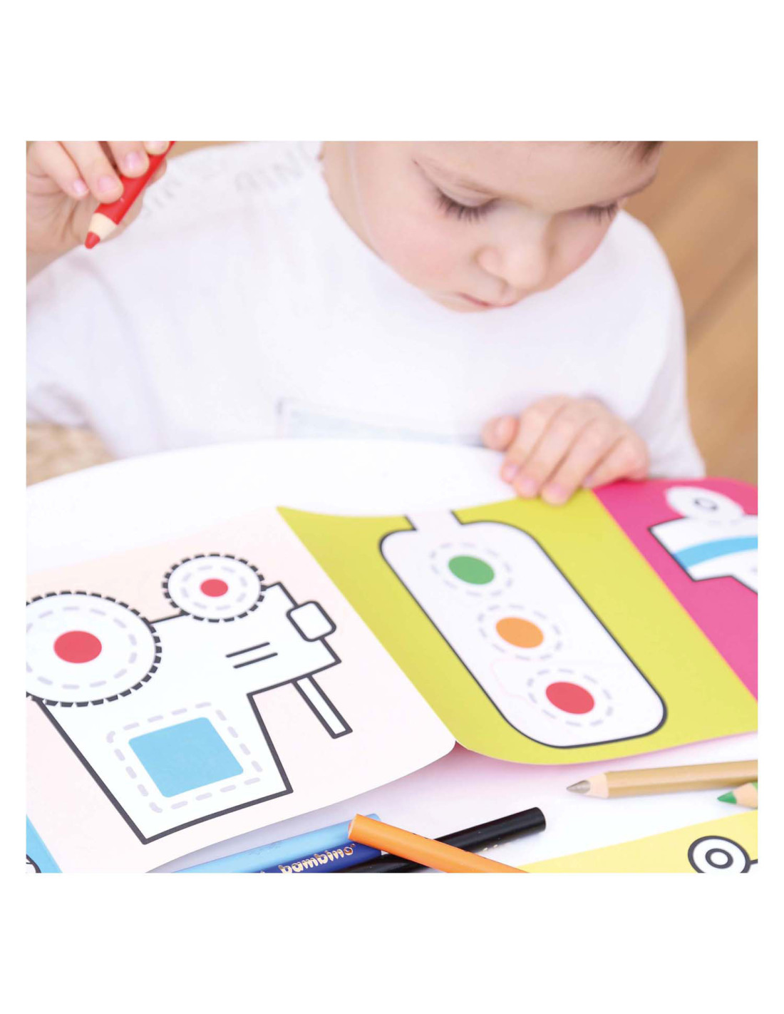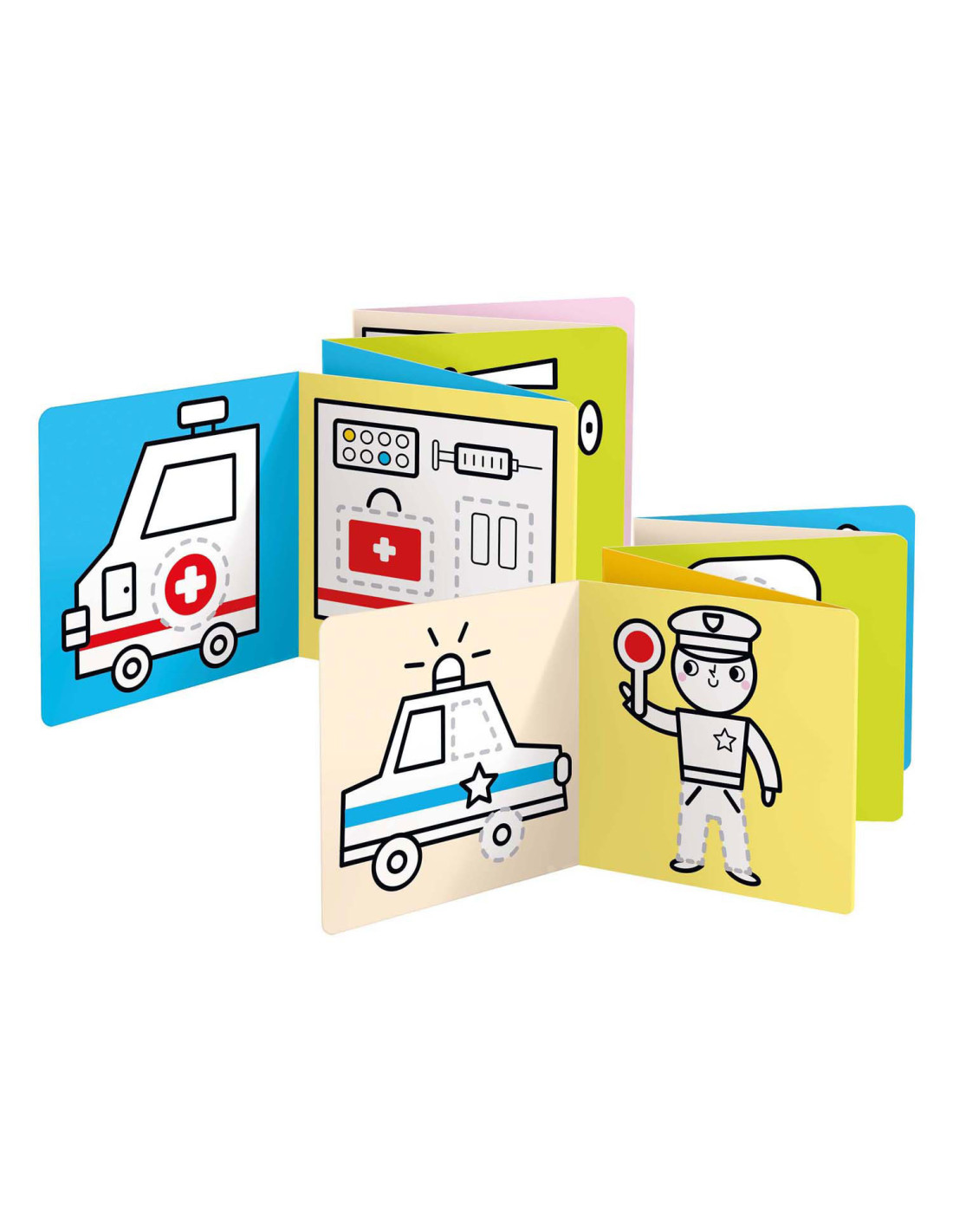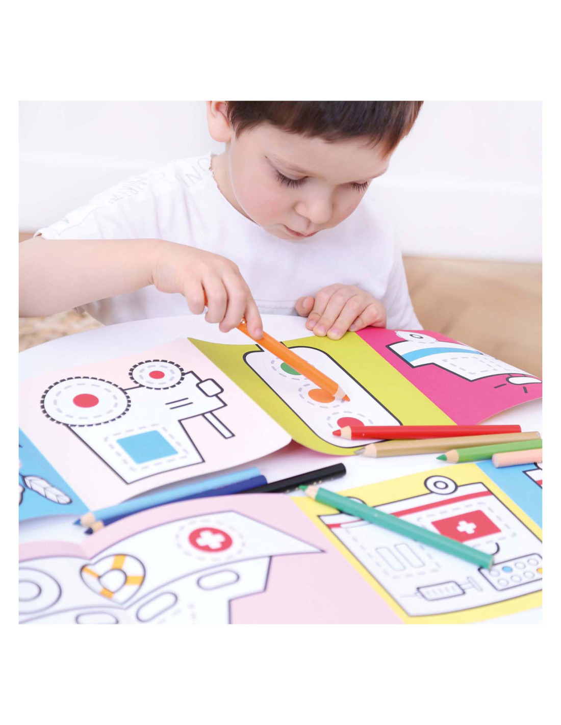 Welkom in de wereld van voertuigen op de weg. Spring met ons in actie en trek de lijnen over! Deze creatieve set bevat 2 lange (95 cm!) accordeonboeken met 23 illustraties vol leuke details, die kinderen zullen aanmoedigen om hun kleurpotloden op te pakken en hun eerste tekenpogingen te wagen.