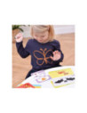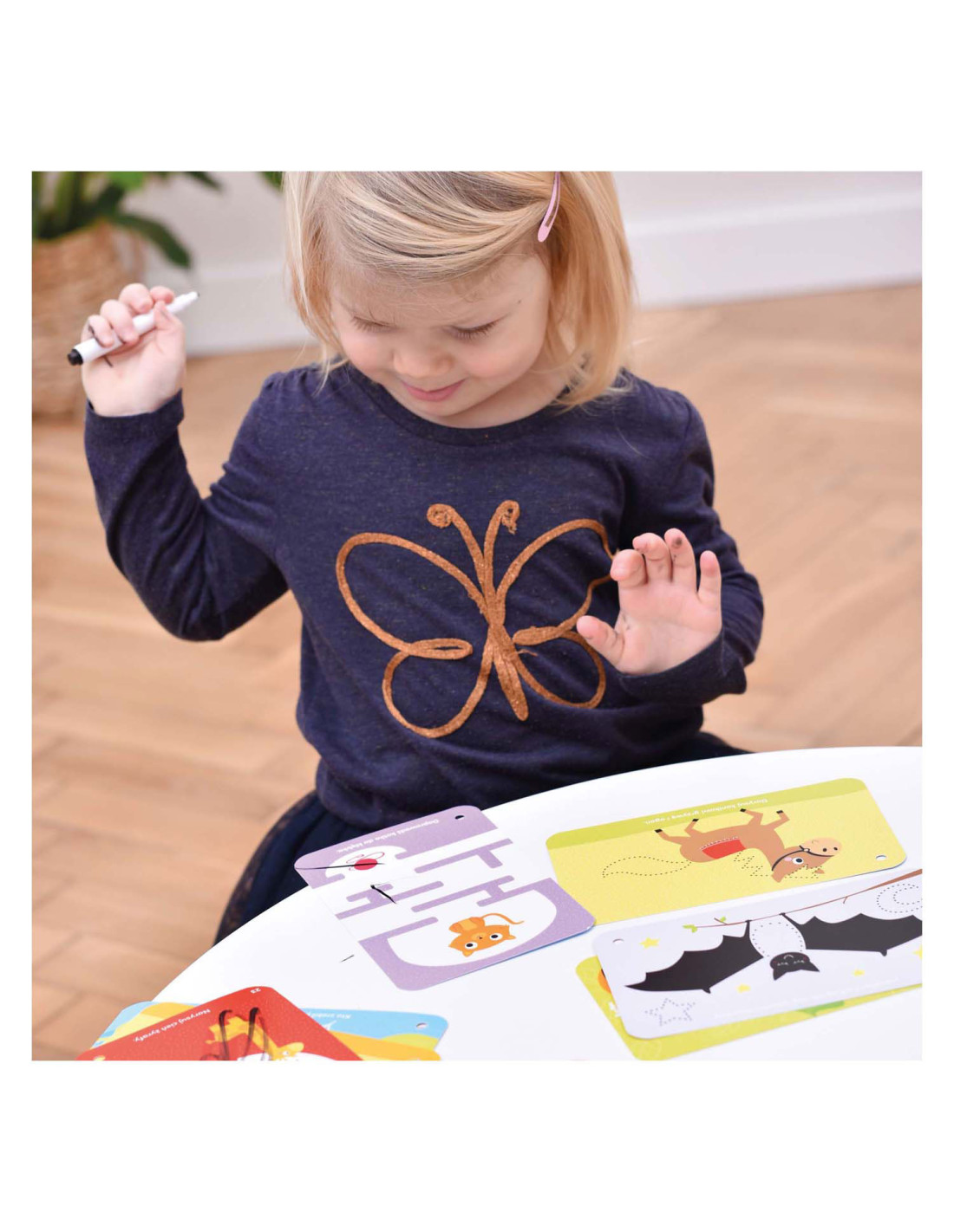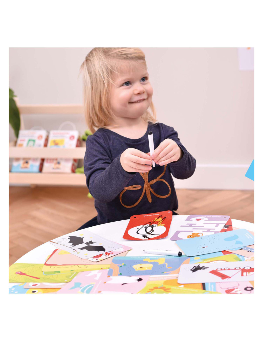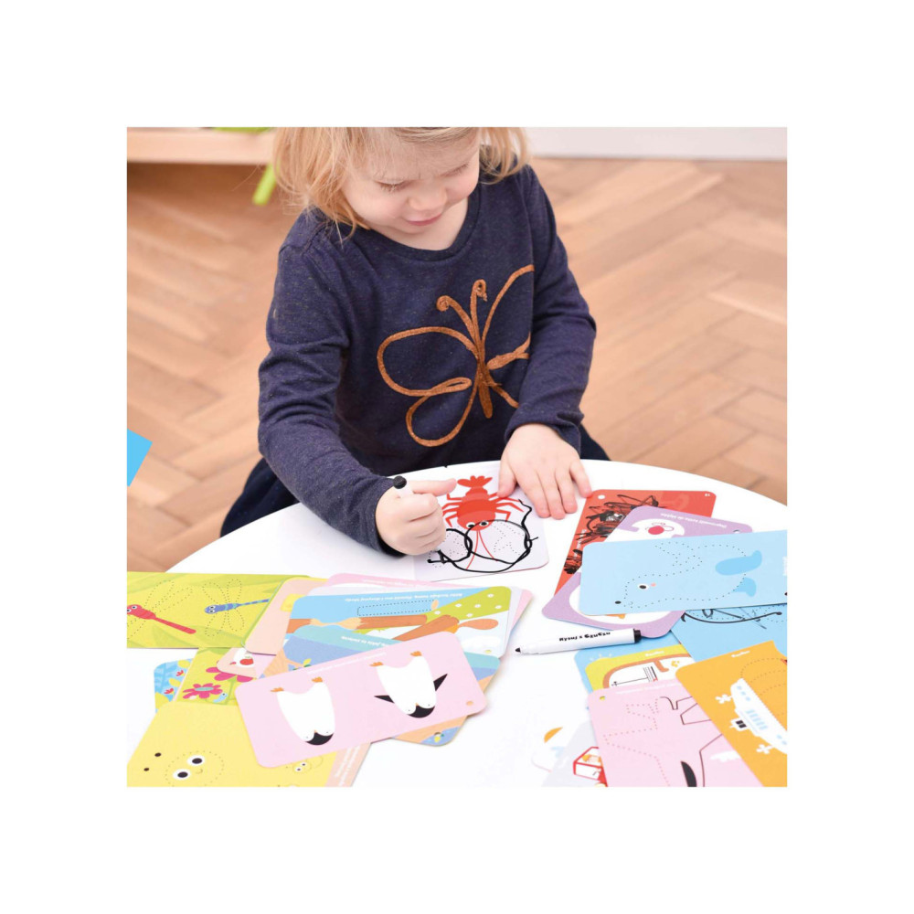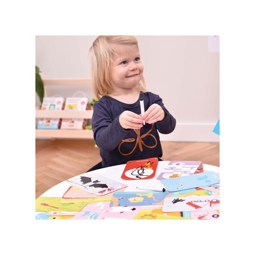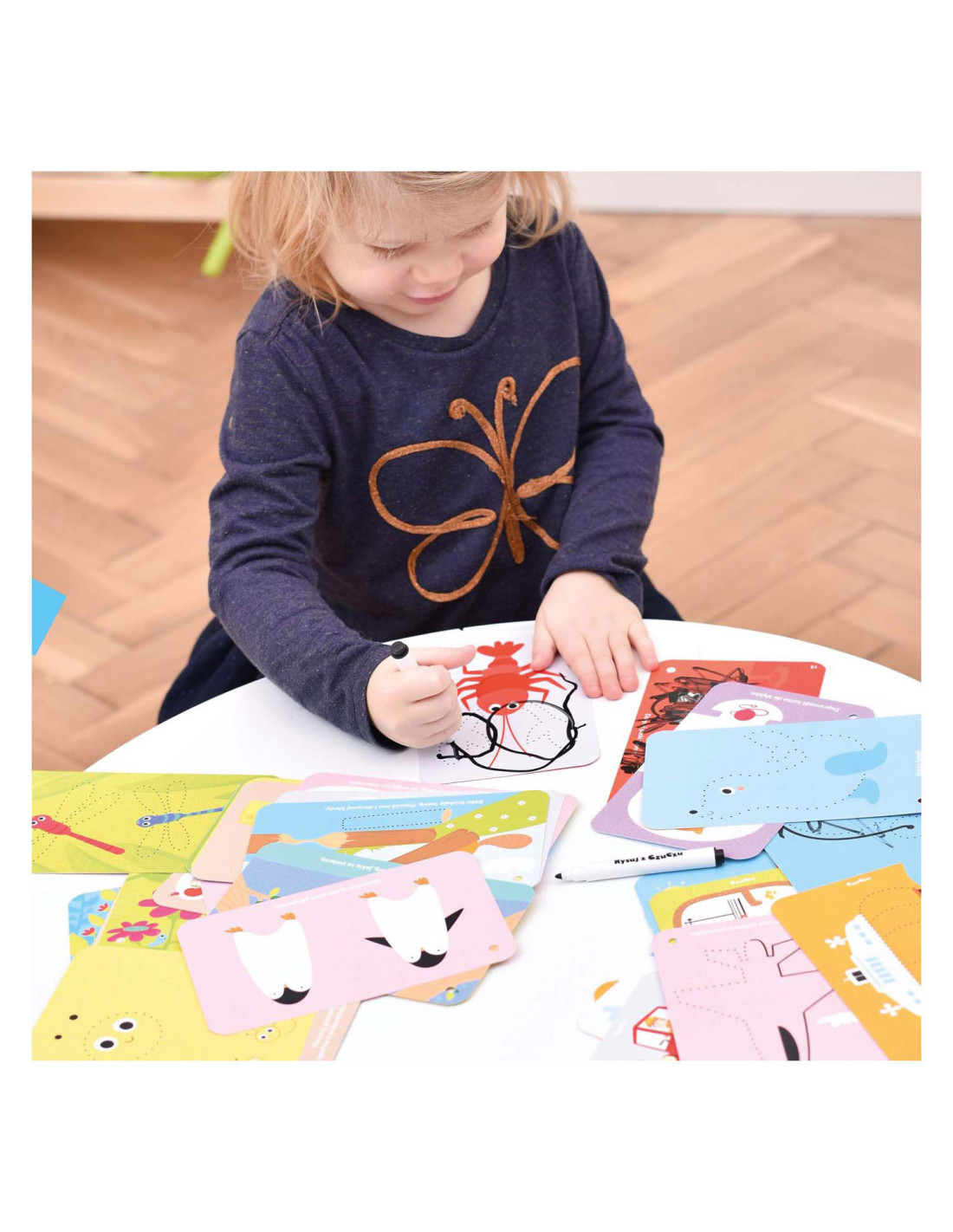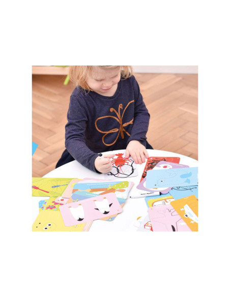 Ze helpen kinderen om hun waarnemingsvermogen en bewustzijn van hun omgeving te ontwikkelen en bereiden hen voor op het leren lezen, schrijven en tellen. Creatief spelen brengt voordelen voor de toekomst - krabbelen traint de verbeelding en stimuleert de creativiteit, wat een positief effect heeft op het leervermogen en het geheugen. Dankzij het handige formaat met een praktische touwbinding kun je de kaarten overal gebruiken: thuis, op de kleuterschool en onderweg.