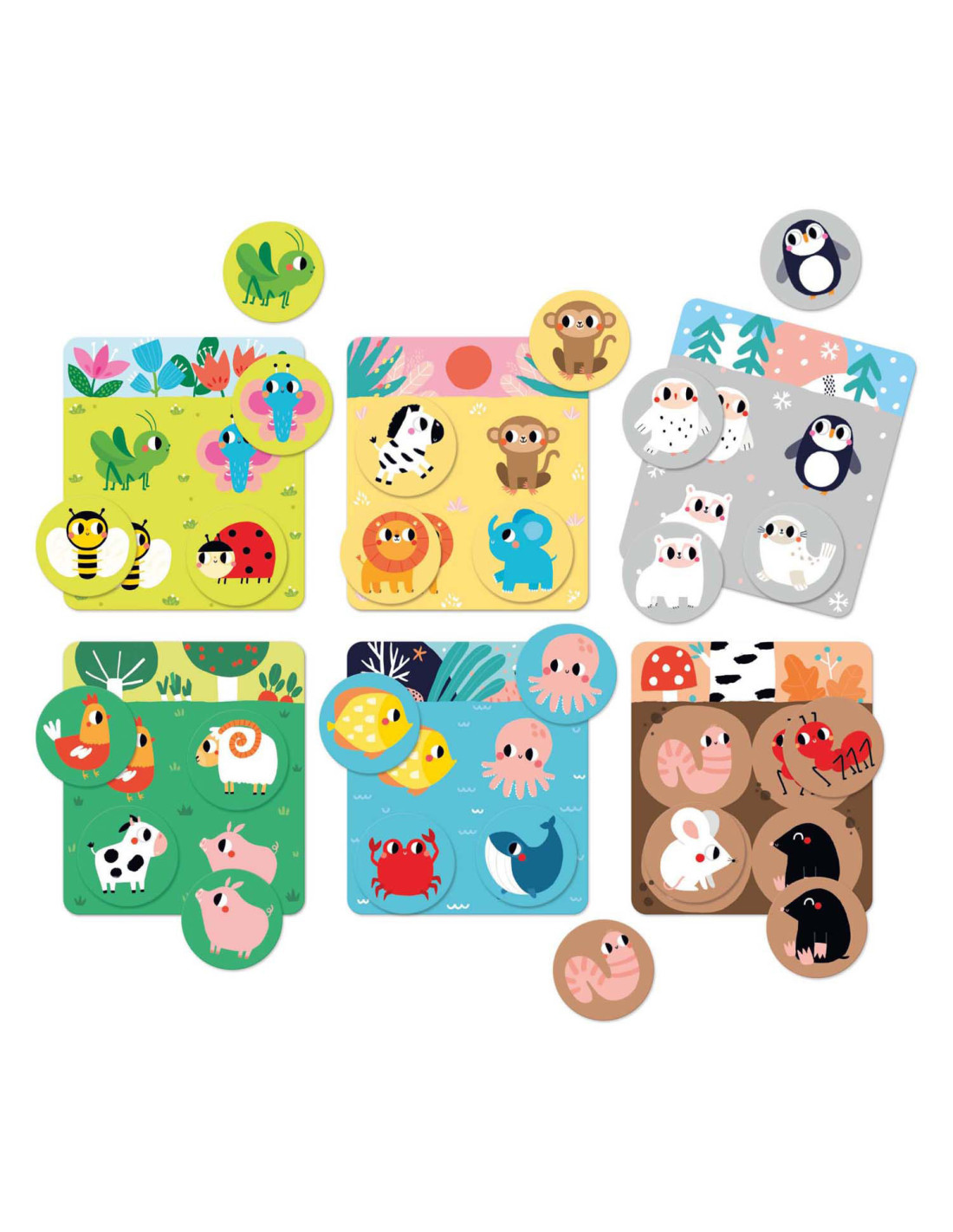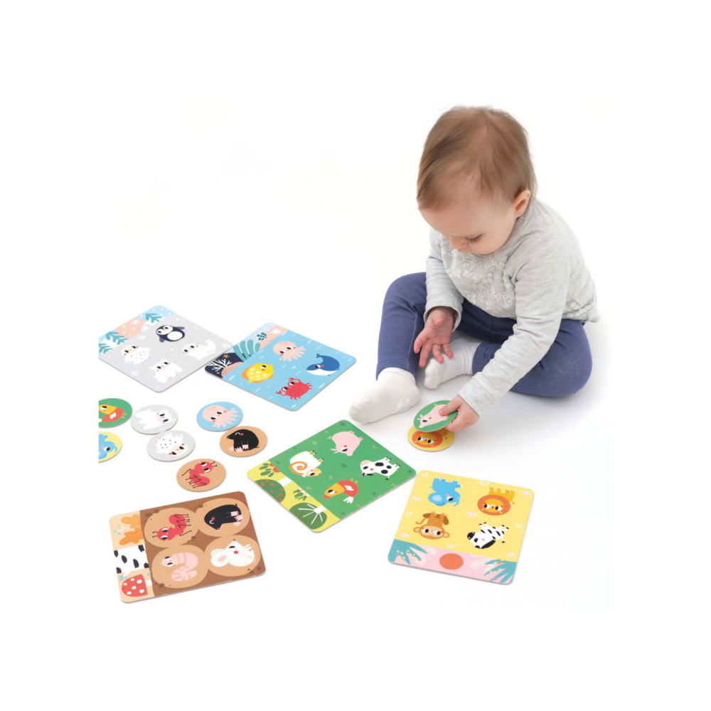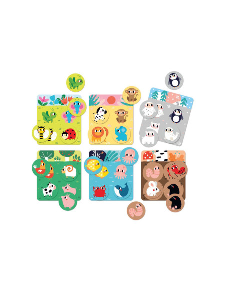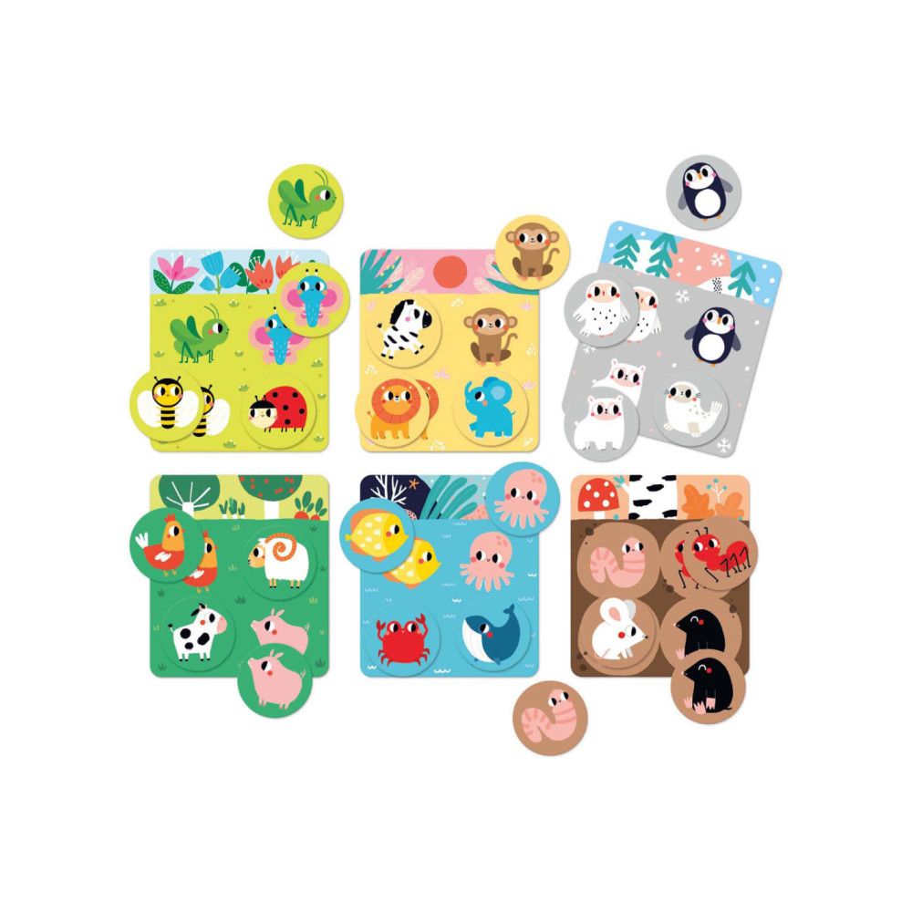 De set bevat 6 borden en 24 grote speelfiguren die je in verschillende scenario's kunt combineren. Gebruik de borden en dierenfiguren voor veel educatieve spellen. Je kunt het klassieke bingospel spelen (de dierenfiches op de borden leggen), een van onze 30 spelideeën proberen of je eigen regels introduceren en van het spel genieten.