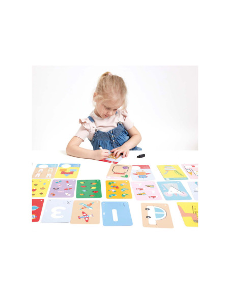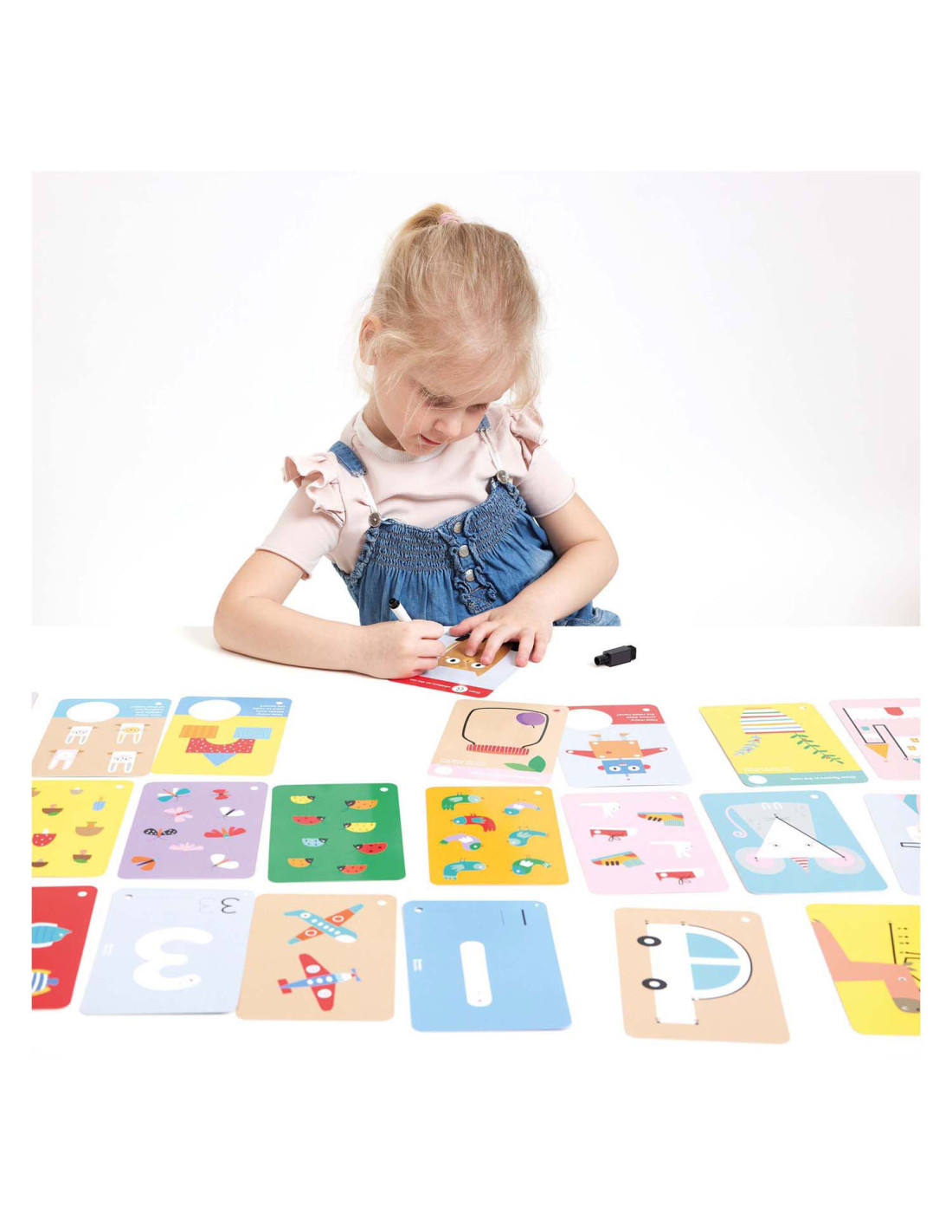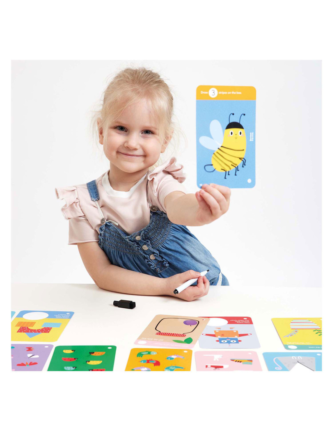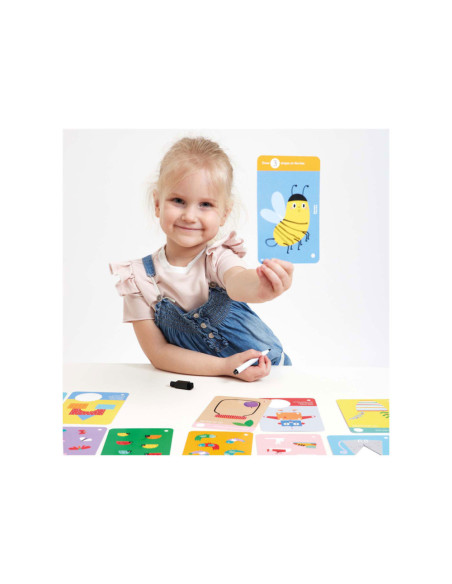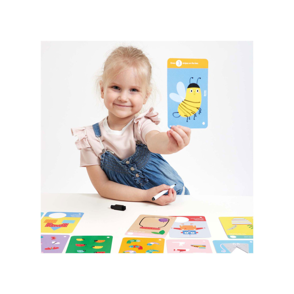 Verschillende activiteiten nodigen kinderen uit tot grafomotorische oefeningen zoals: lijnen overtrekken, stippen verbinden, ontbrekende elementen intekenen of vormen nabootsen. Ze helpen kinderen hun waarnemingsvermogen te ontwikkelen, hun omgevingsbewustzijn te vergroten, hun concentratie te trainen en de juiste schrijfhouding te ontwikkelen. Creatief spelen levert voordelen op voor de toekomst - krabbelen traint de verbeelding en stimuleert de creativiteit, wat een positief effect heeft op het leervermogen en het geheugen. Dankzij het handige formaat met een praktische touwbinding kun je de kaarten overal gebruiken: thuis, op de kleuterschool en onderweg.