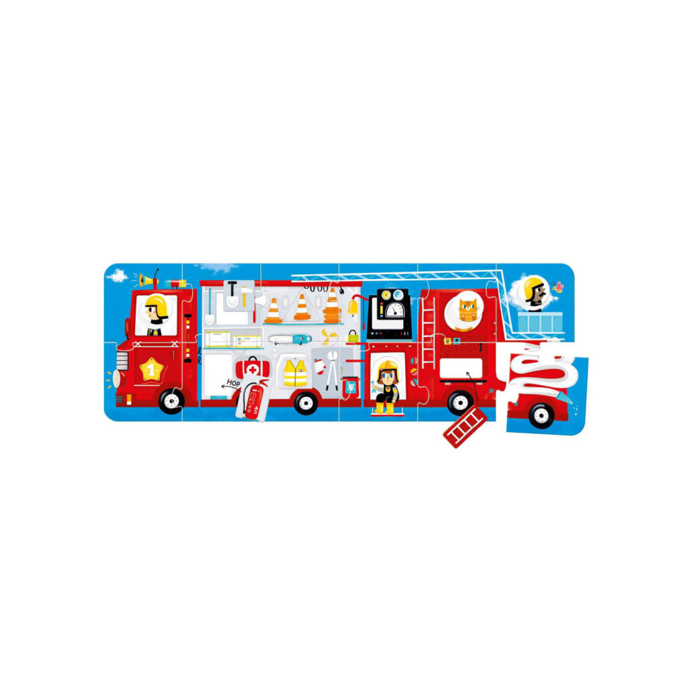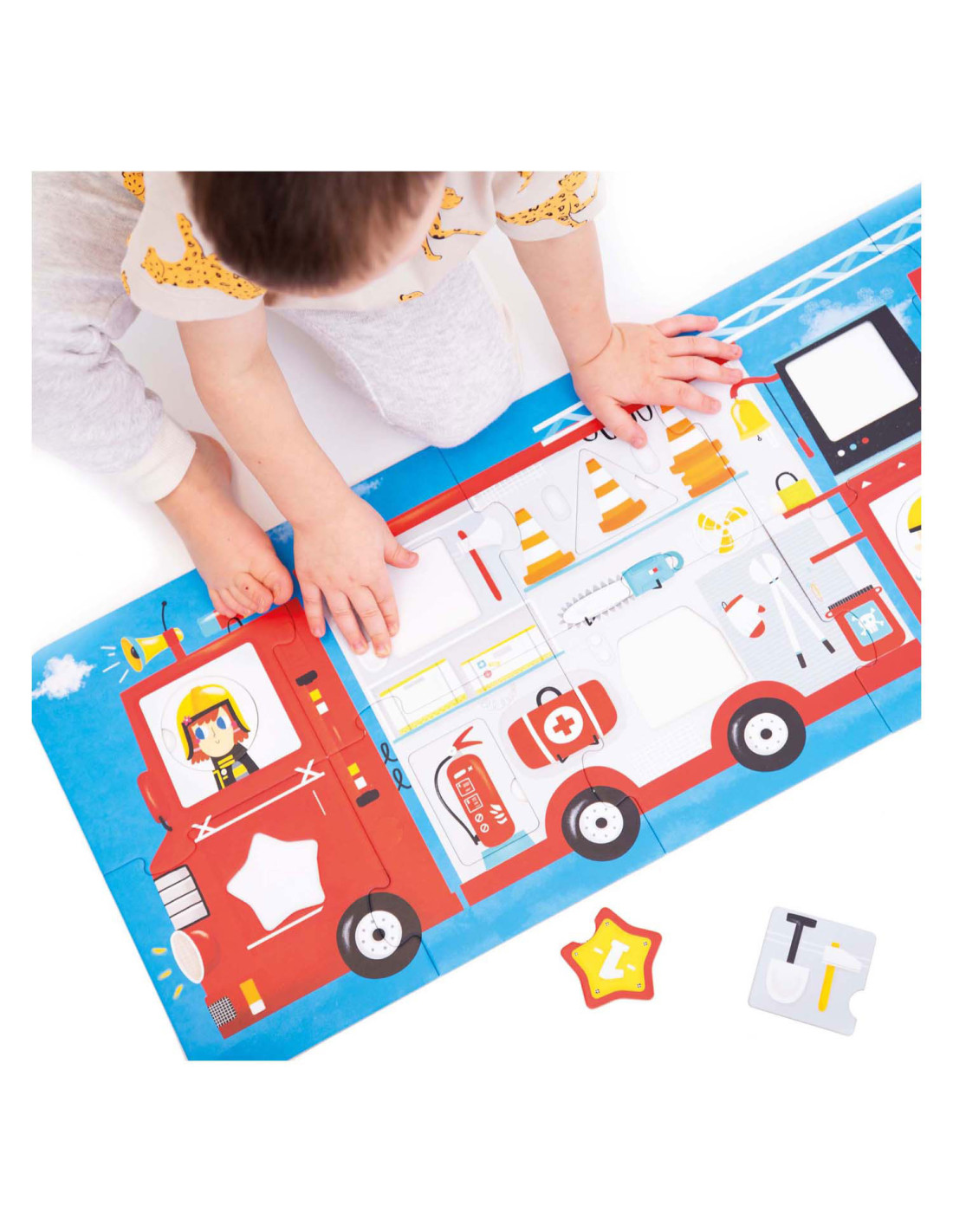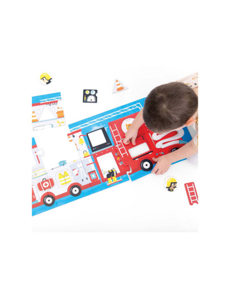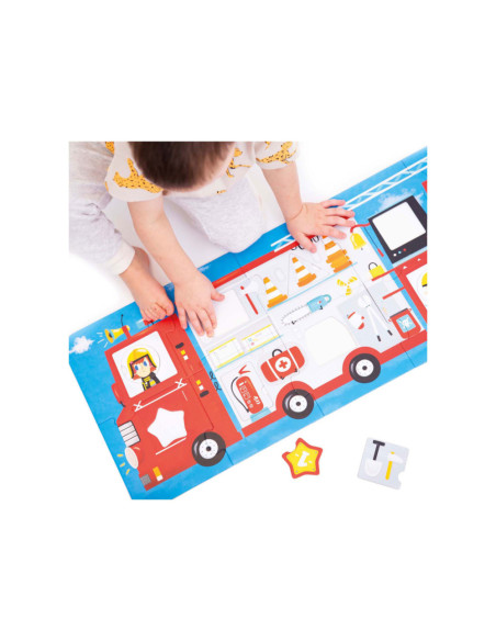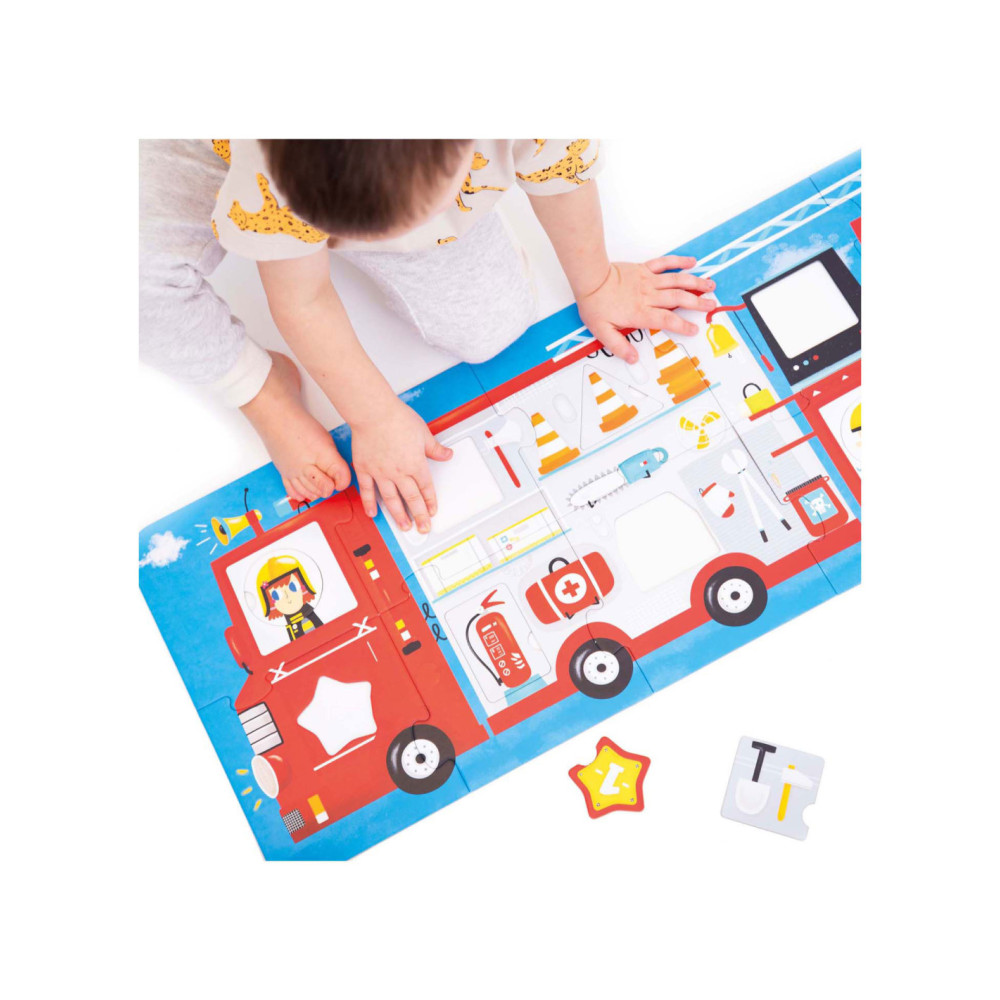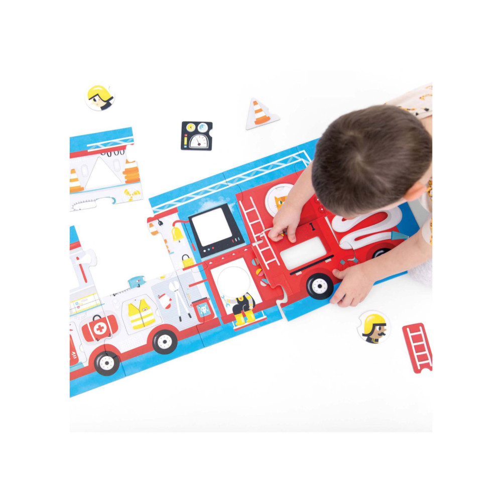 Klaar voor de start: af! Deze 23-delige educatieve puzzel laat kinderen in twee stappen creatief plezier beleven. Eerst zetten kinderen de jumbo-stukken in elkaar tot een groot (meer dan 3 meter lang) voertuig en dan leren ze over verschillende vormen door de verschillende bijgeleverde voorwerpen in de puzzel te plaatsen. Maar daar houdt het plezier niet op! Ronde stukken kunnen vrij gemixt en gematcht worden, dus jij bepaalt wie er rijdt!
