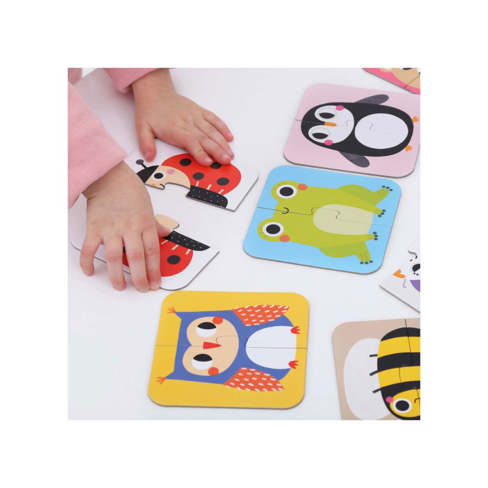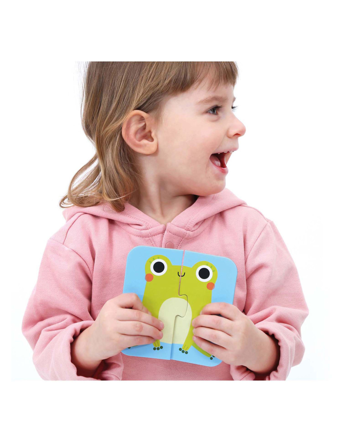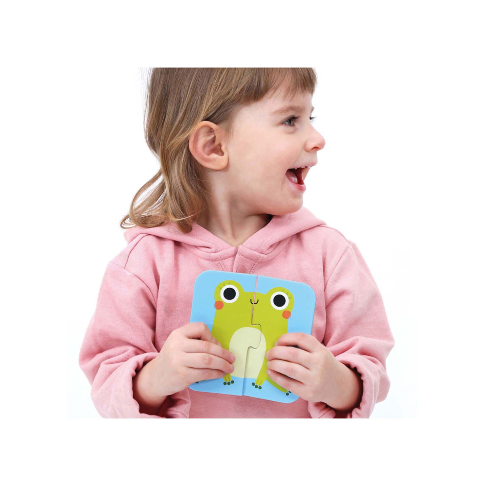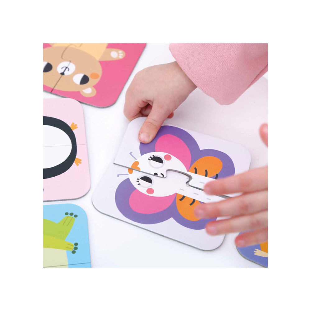 Begin met 2 of 3 puzzelparen/puzzels en voeg er geleidelijk meer toe. Laat je kind zien hoe hij de stukjes kan combineren om vriendelijke dieren te vormen. Zodra de puzzels in elkaar zitten, bedenk je verhalen over dieren, waar ze leven en wat ze doen.Niet voor de hand liggende combinaties zijn ook mogelijk - combineer de paren gewoon en beleef nog meer plezier. Laat je fantasie de vrije loop!