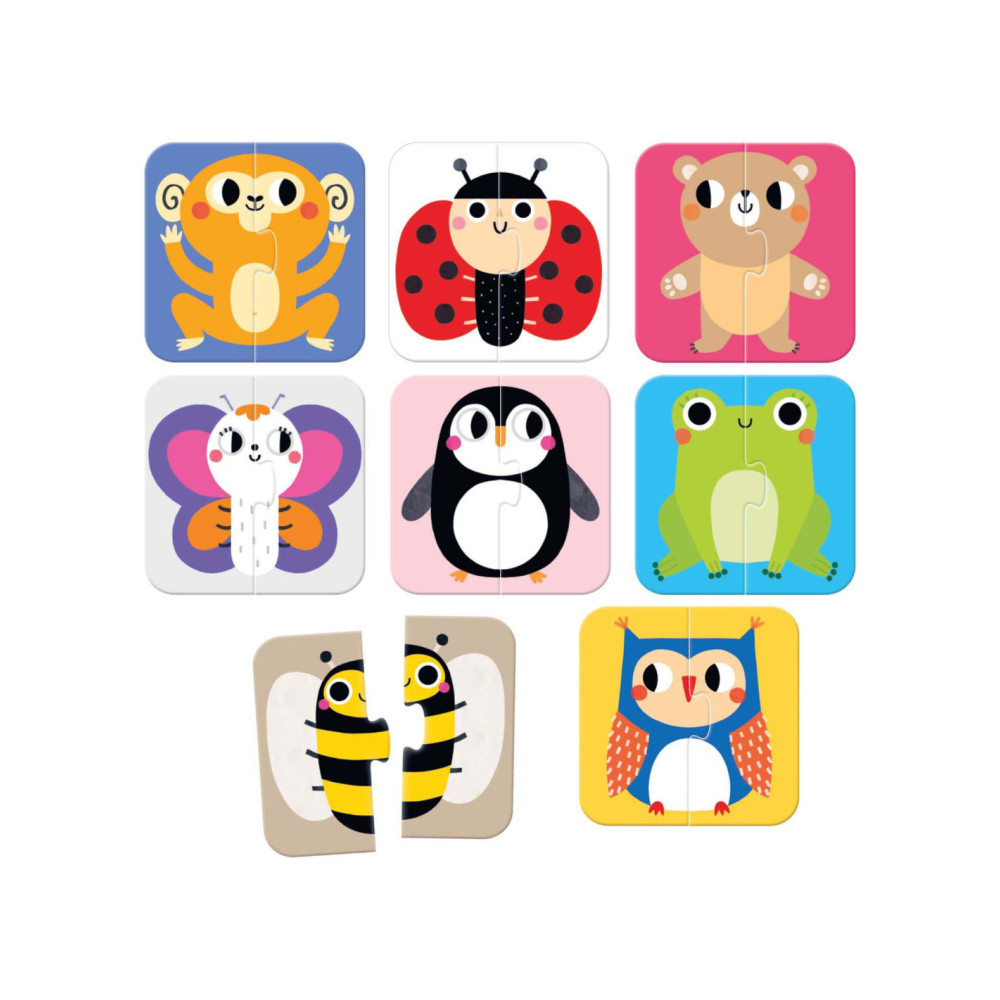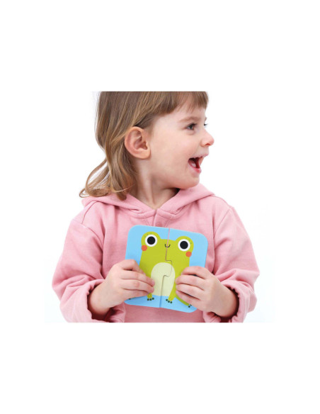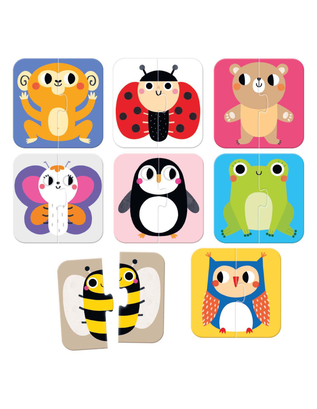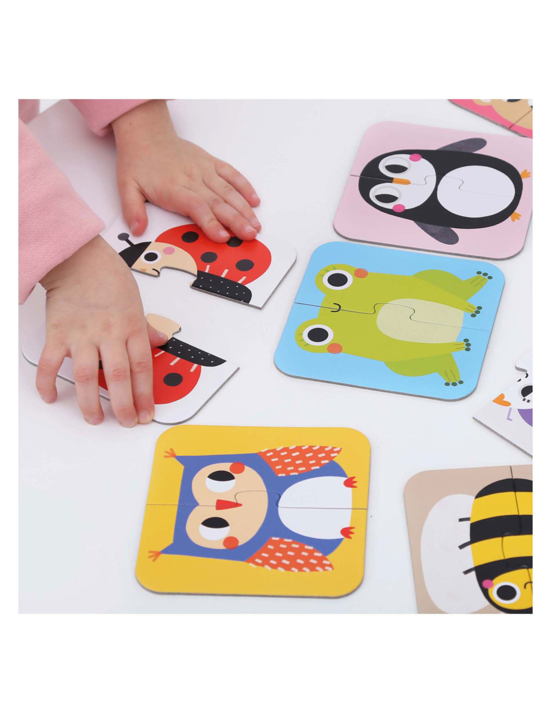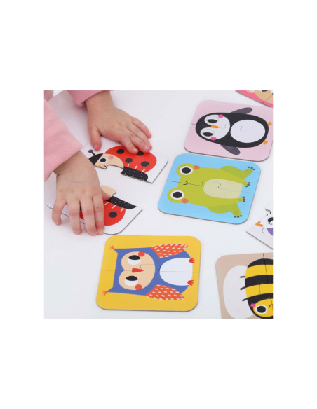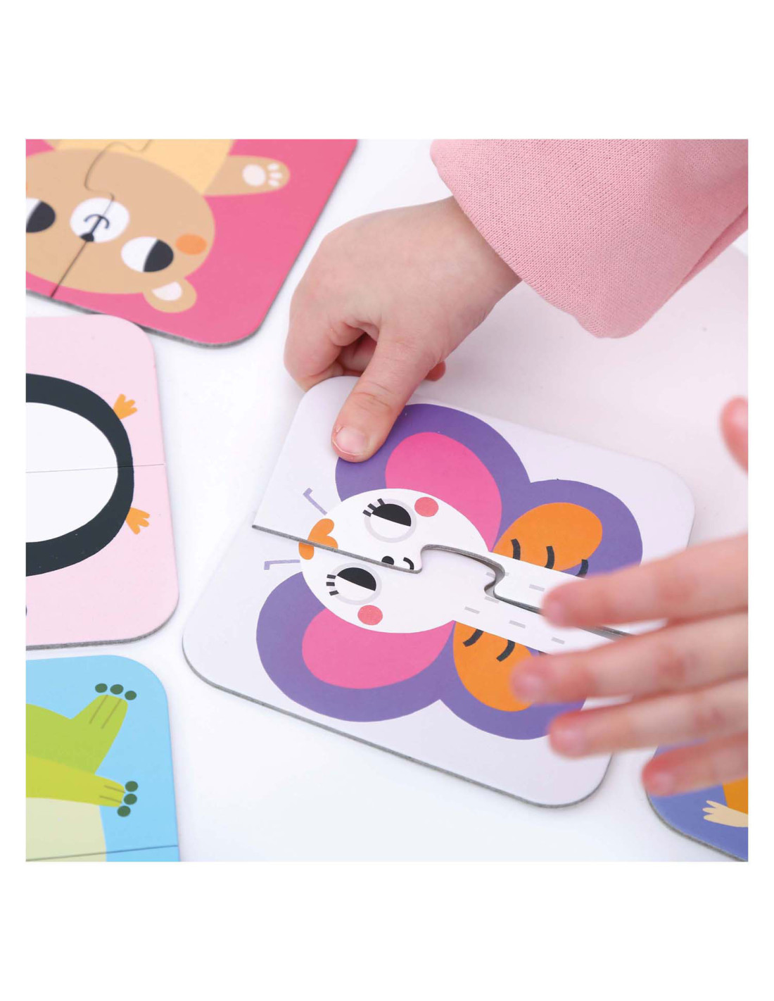 Begin met 2 of 3 puzzelparen/puzzels en voeg er geleidelijk meer toe. Laat je kind zien hoe hij de stukjes kan combineren om vriendelijke dieren te vormen. Zodra de puzzels in elkaar zitten, bedenk je verhalen over dieren, waar ze leven en wat ze doen.Niet voor de hand liggende combinaties zijn ook mogelijk - combineer de paren gewoon en beleef nog meer plezier. Laat je fantasie de vrije loop!
