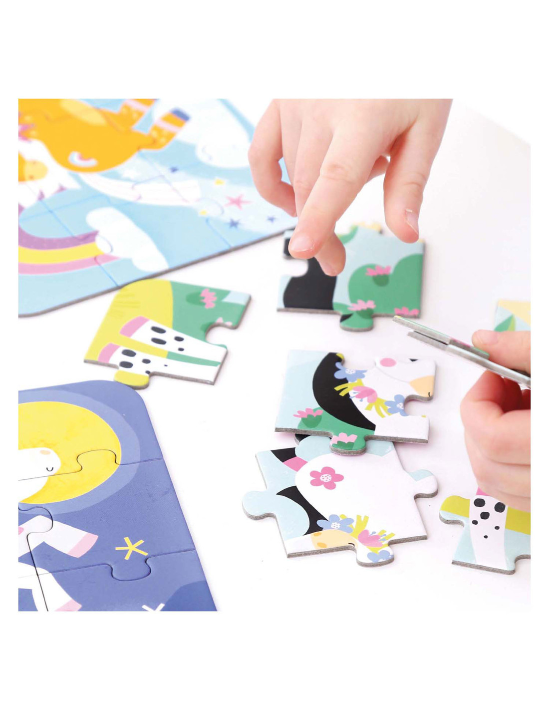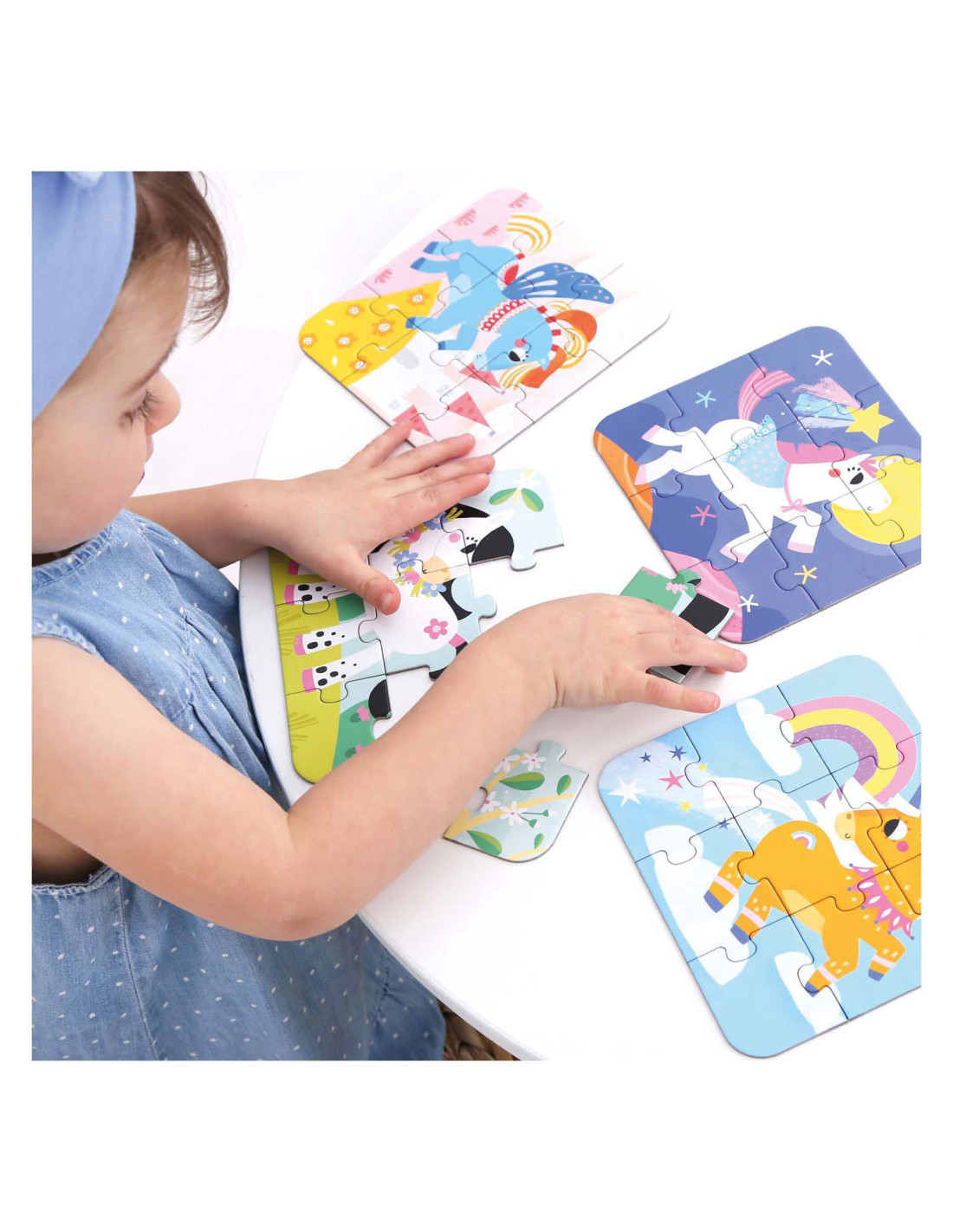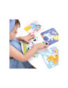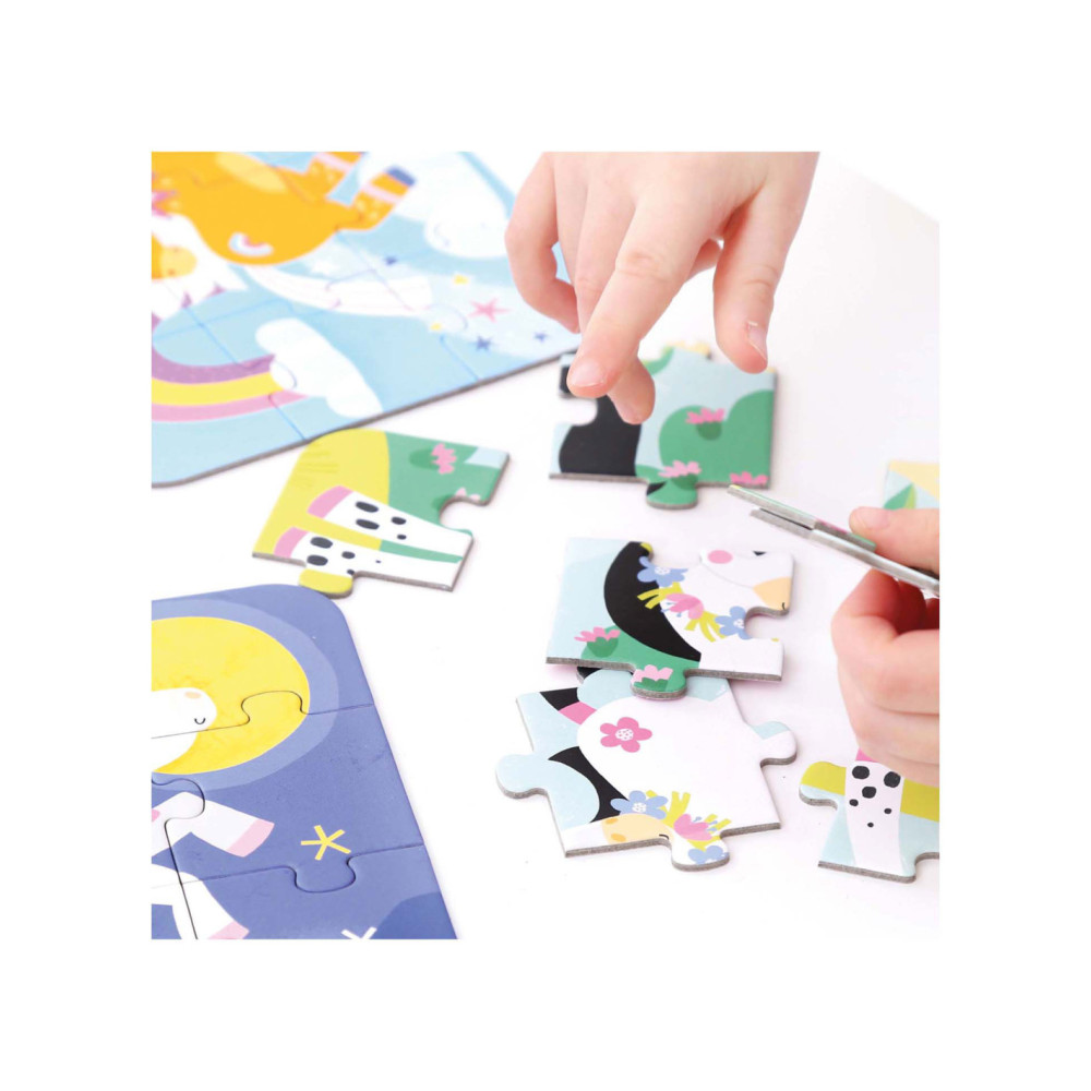 Het is tijd voor moeilijkere puzzels. Deze handige doos bevat 5 puzzels, elk bestaande uit 9 stukjes. De kleurrijke illustraties moedigen kinderen aan om de puzzel in elkaar te zetten, de perfecte manier om behendigheid en waarnemingsvermogen te ontwikkelen. Je kunt op veel manieren met deze puzzel spelen. Gebruik hem als inspiratie voor andere spellen, vertel je eigen verhalen of teken je eigen plaatjes.