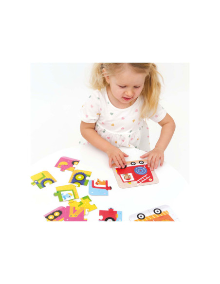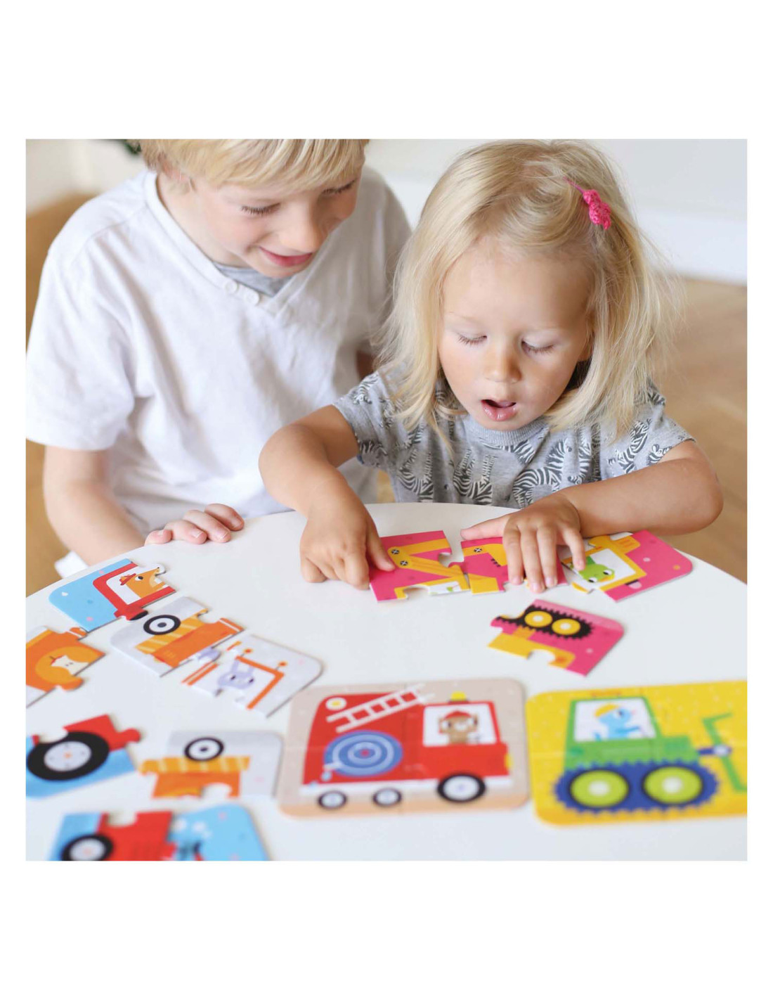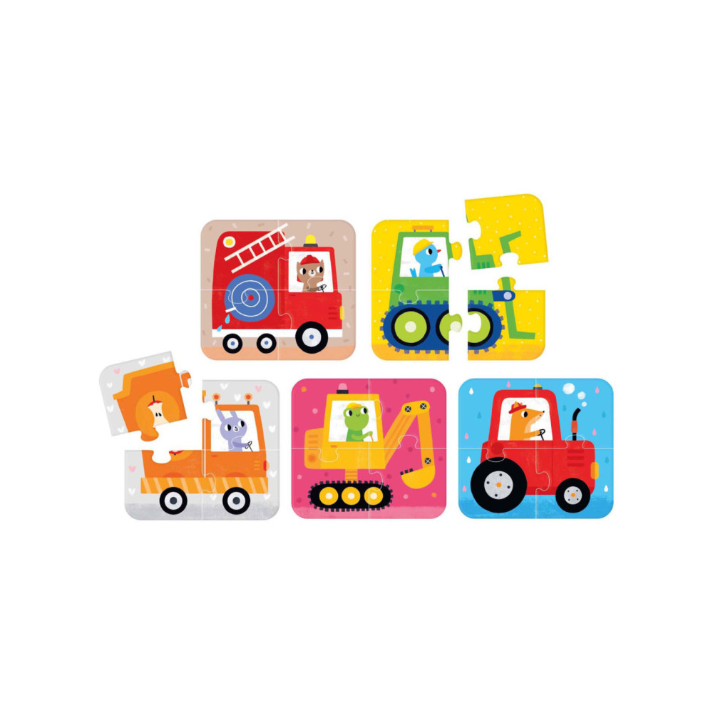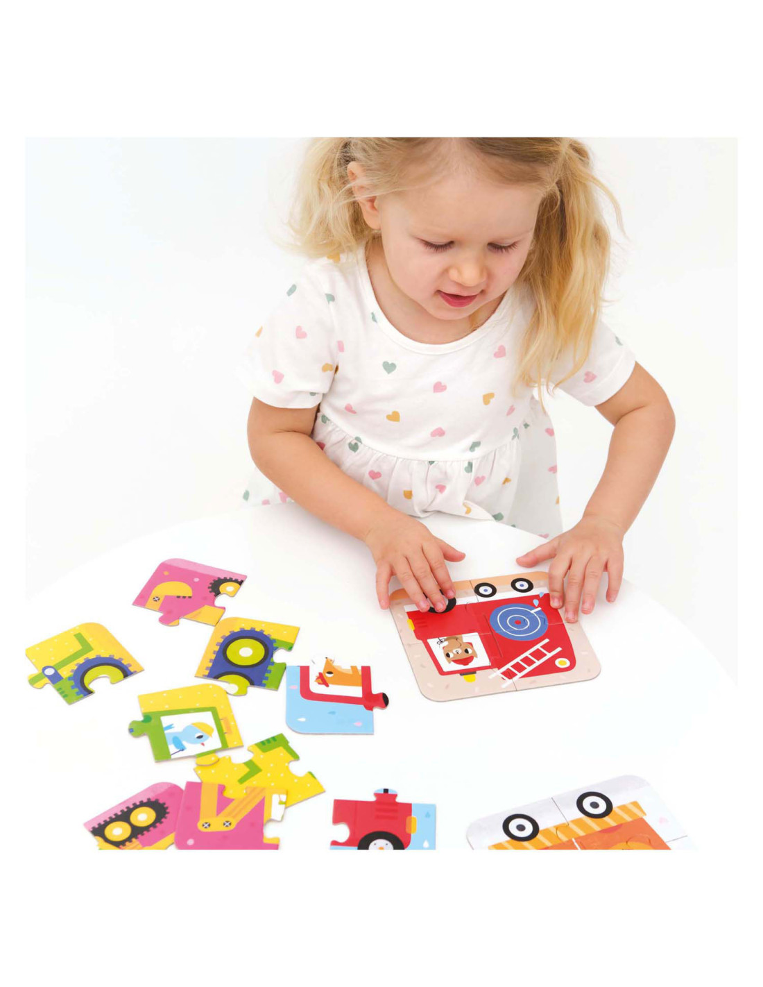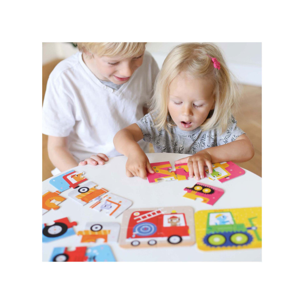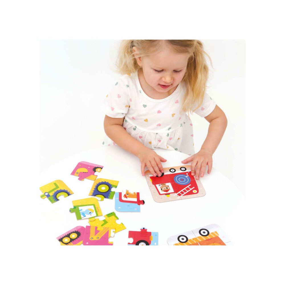 Vroem, vroem! Kleurrijke voertuigen en vriendelijke chauffeurs nemen je kind mee naar de wereld van uitdagendere puzzels!