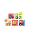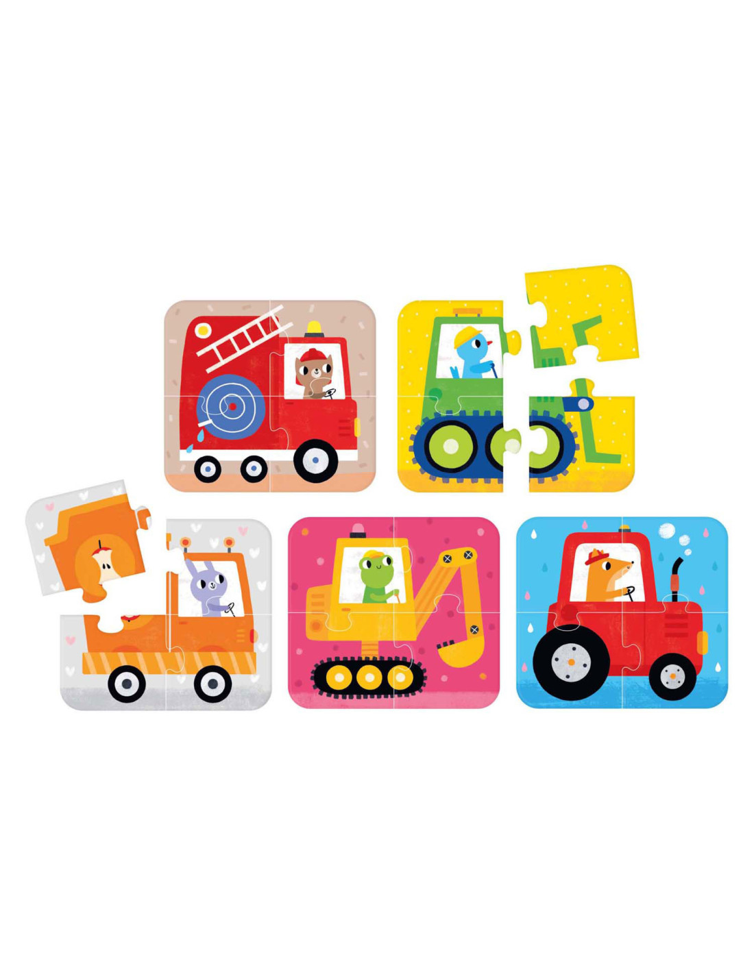 Deze handige doos bevat 5 puzzels met elk 4 stukjes. De kleurrijke illustraties moedigen kinderen aan om de puzzel in elkaar te zetten, de perfecte manier om hun behendigheid en waarnemingsvermogen te ontwikkelen. Puzzels inspireren kinderen om de namen van nieuwe dieren, voertuigen en kleuren te leren, nieuwe geluiden, en ook fysieke spelletjes - laat je fantasie de vrije loop! Jonge fans van grote machines zullen het geweldig vinden om deze voertuigen als eerste puzzel met meerdere stukjes in elkaar te zetten.