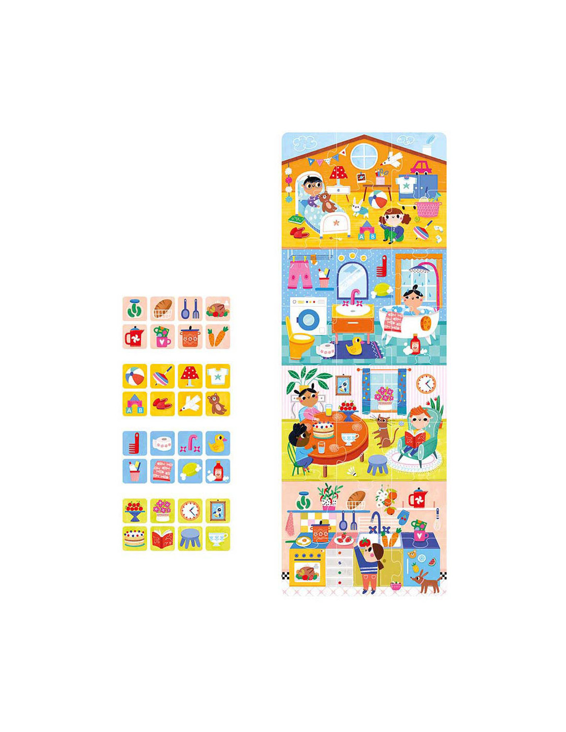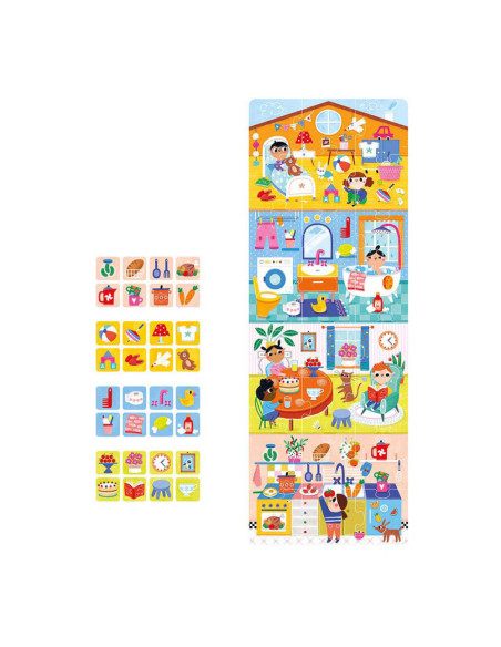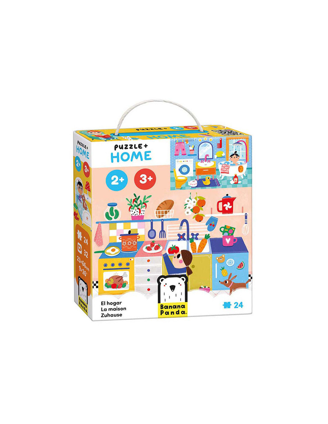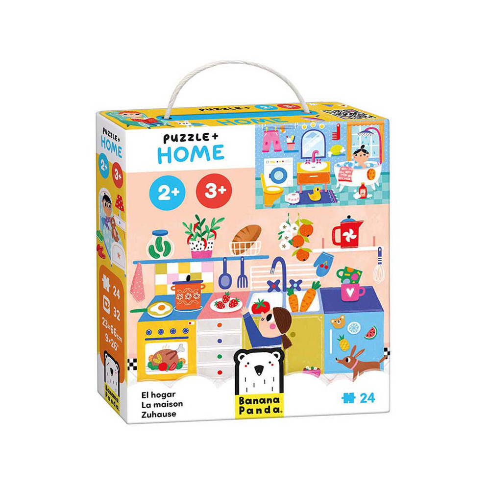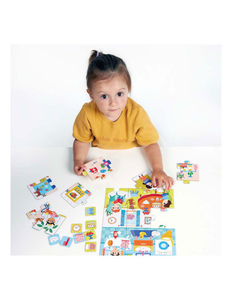 "Puzzel Thuis" is een uitzonderlijke educatieve set voor jonge ontdekkingsreizigers, inclusief een grote puzzel van 24 stukjes, 32 extra tegels en een gids vol speelideeën die gemakkelijk aan te passen zijn aan de vaardigheden van kinderen.