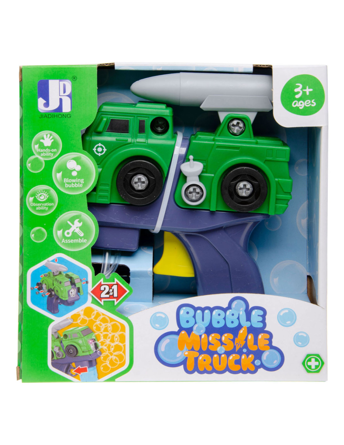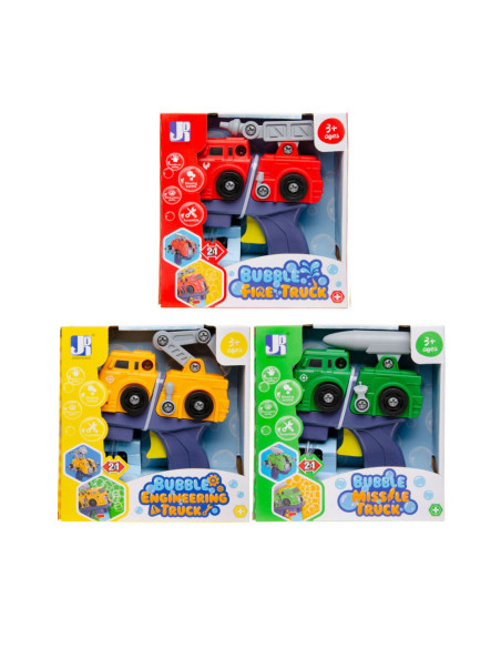 Bellenblaaspistool 2-in-1 met speelgoedvoertuig die zowel op het pistool bevestigd kan worden als los gebruikt kan worden om mee te spelen. Afmetingen: 21 x 20 x 7.5 centimeter. Gemaakt van kunststof. Geschikt vanaf 3 jaar.