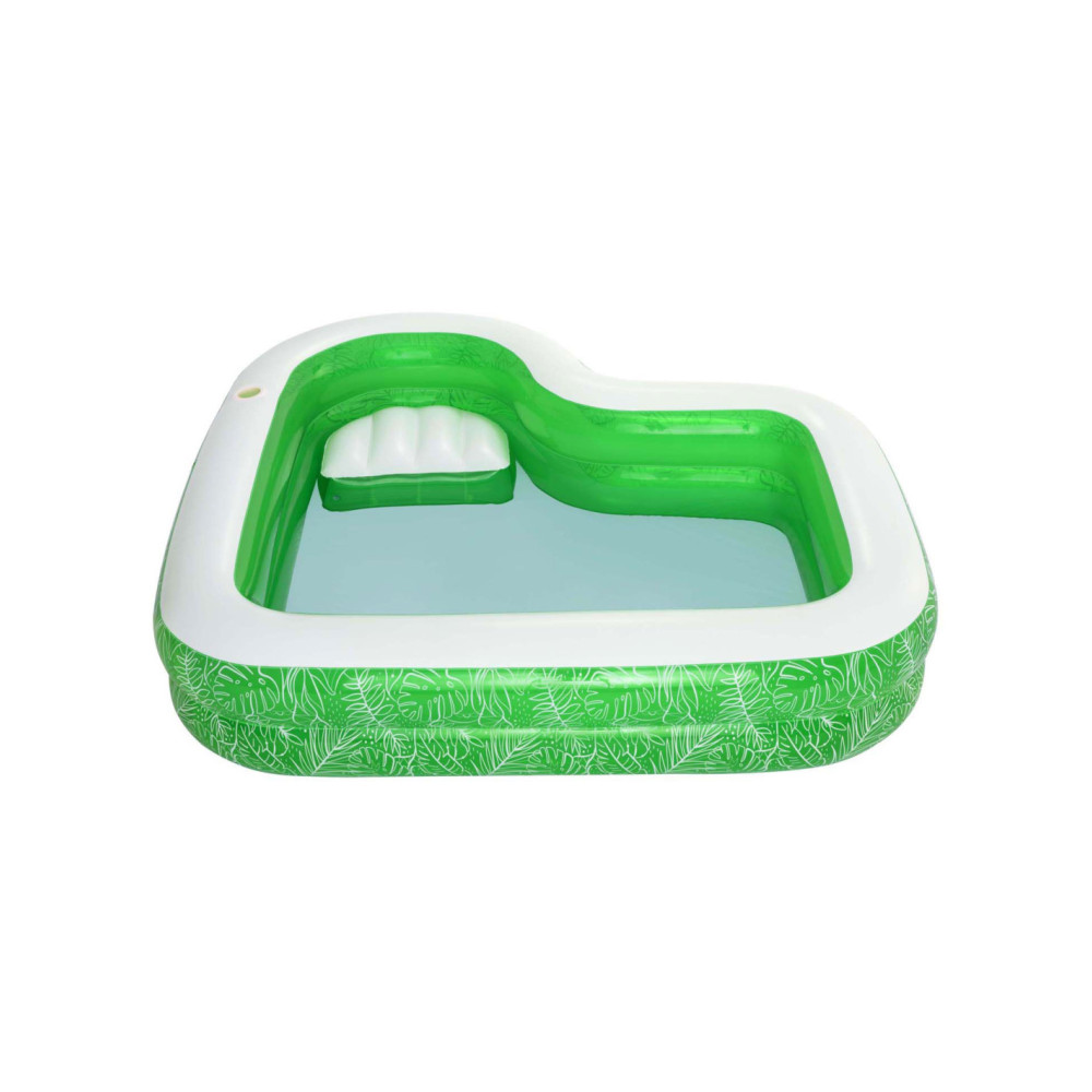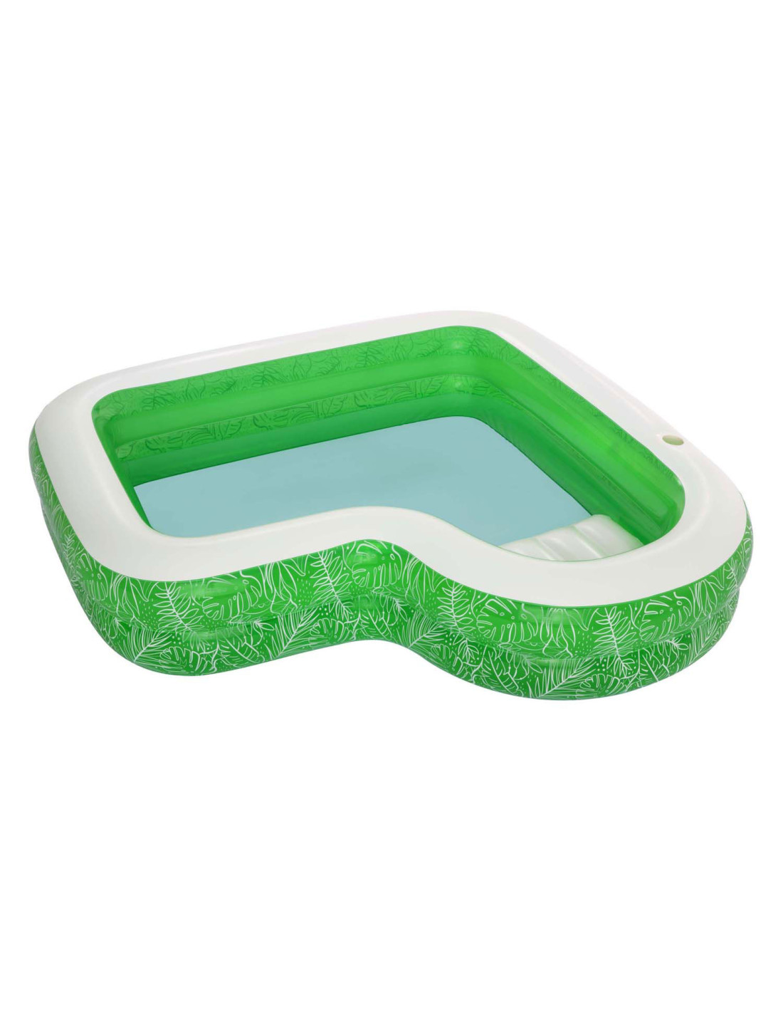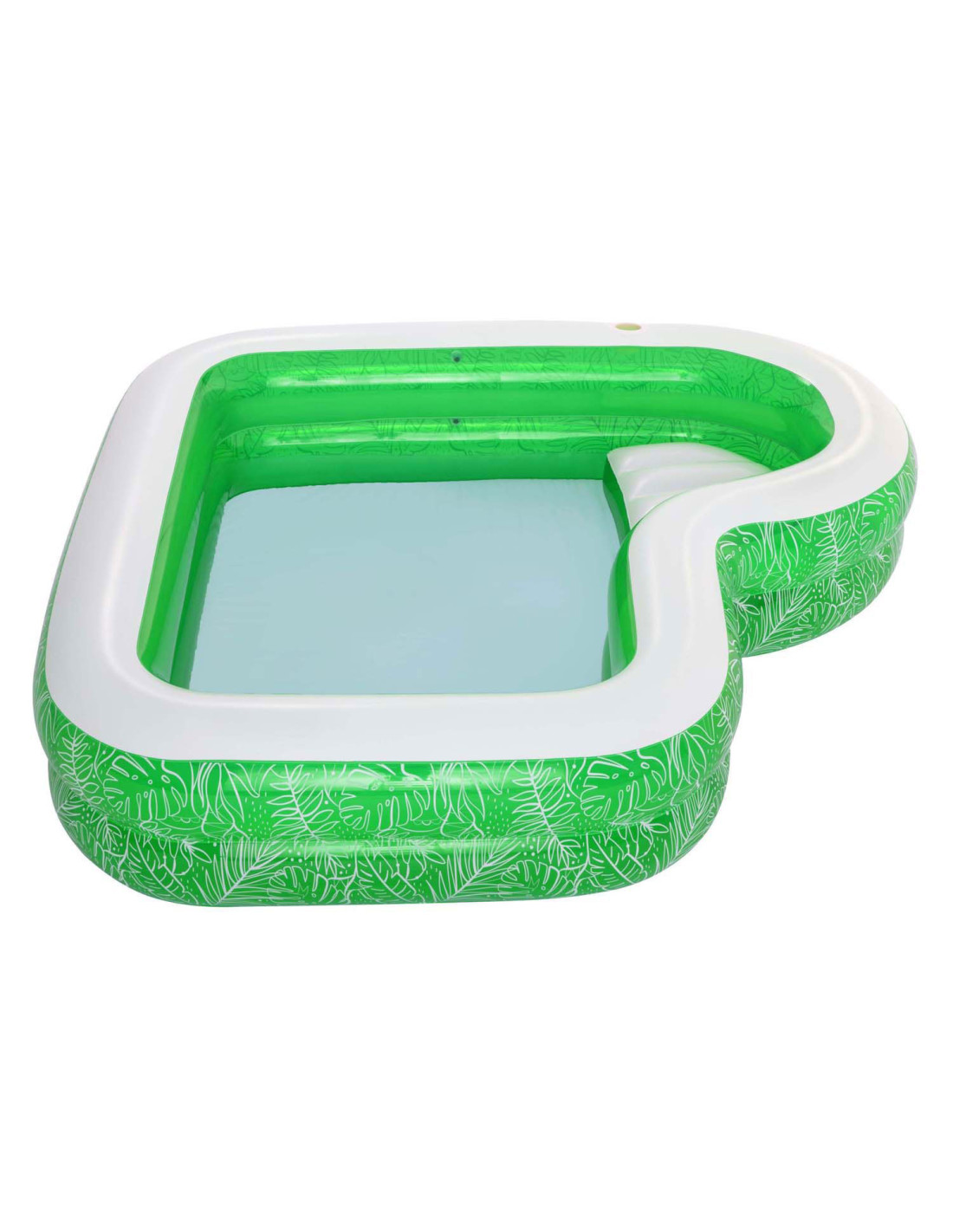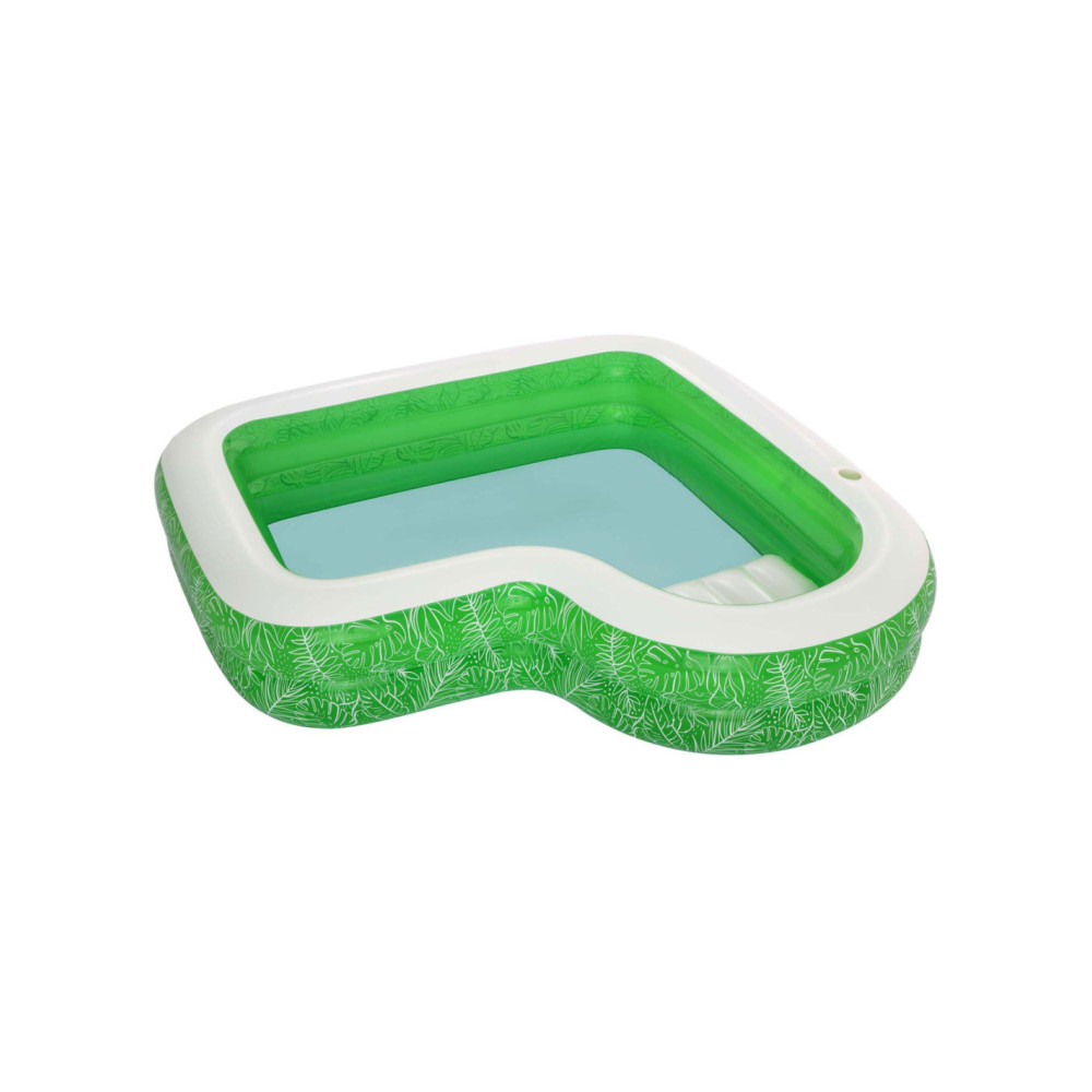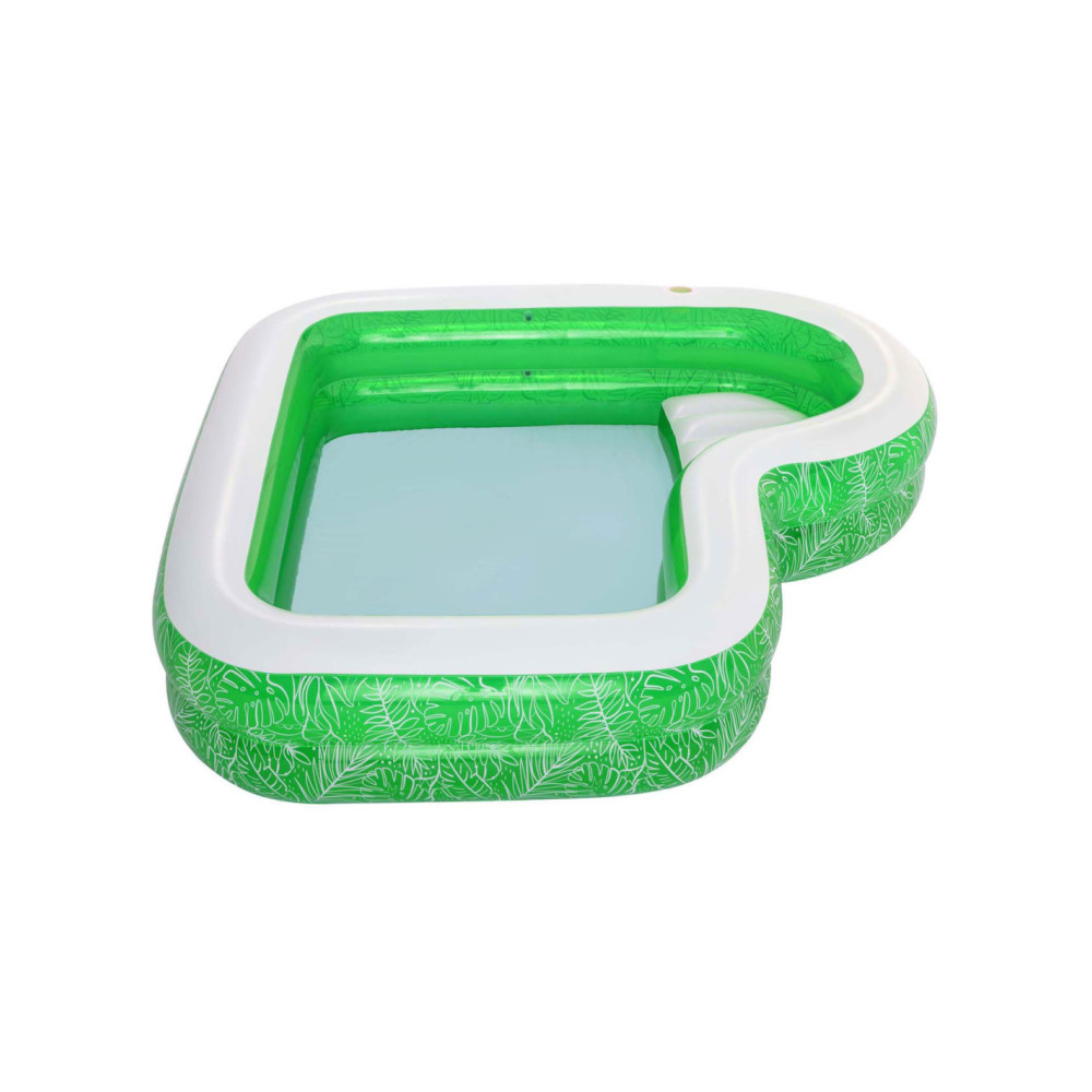 Dit bad met een unieke vorm en kleur is een toevoeging voor elke tuin. Het bad is voorzien van een handige uitstulp met een opblaasbaar zitje en bekerhouders om de spelende kinderen goed in te gaten te kunnen houden. De geraffineerde print op een groene achtergrond met reliëfprint is uniek voor dit zwembad en zorgt voor een echte wow-factor in de tuin. De twee individuele opblaasbare ringen maken dit bad gemakkelijk op te zetten en met het ventiel op de bodem is het water snel uit het bad te halen.